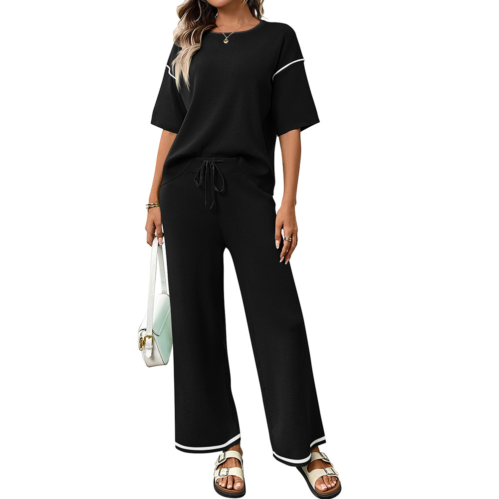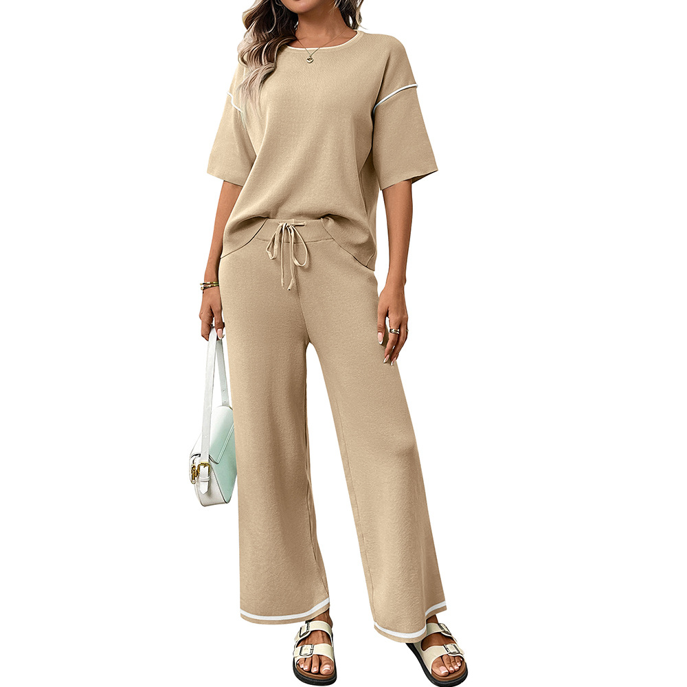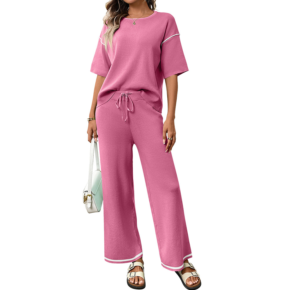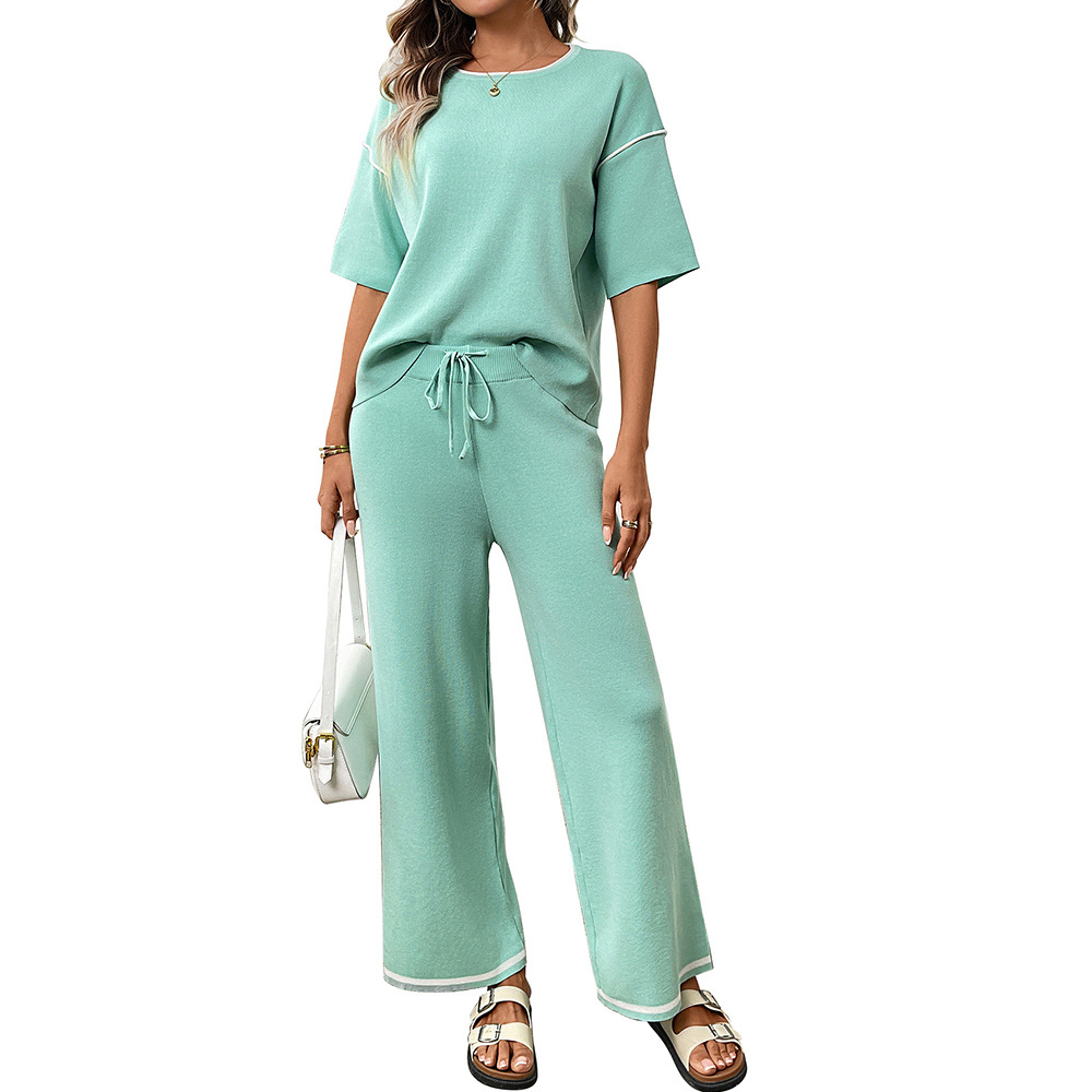 Womens Casual Ice Silk Sweater Short Sleeve Leisure Set