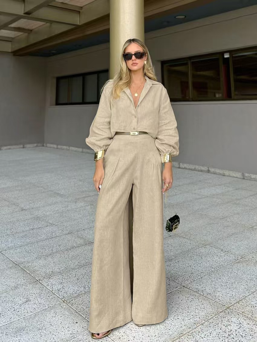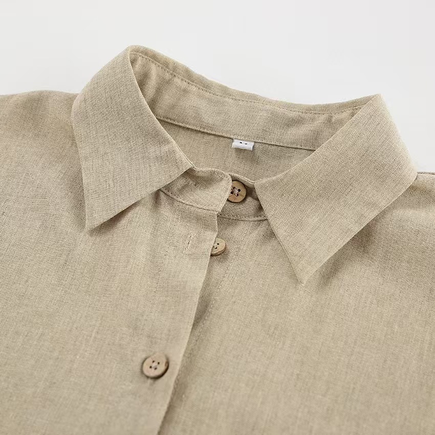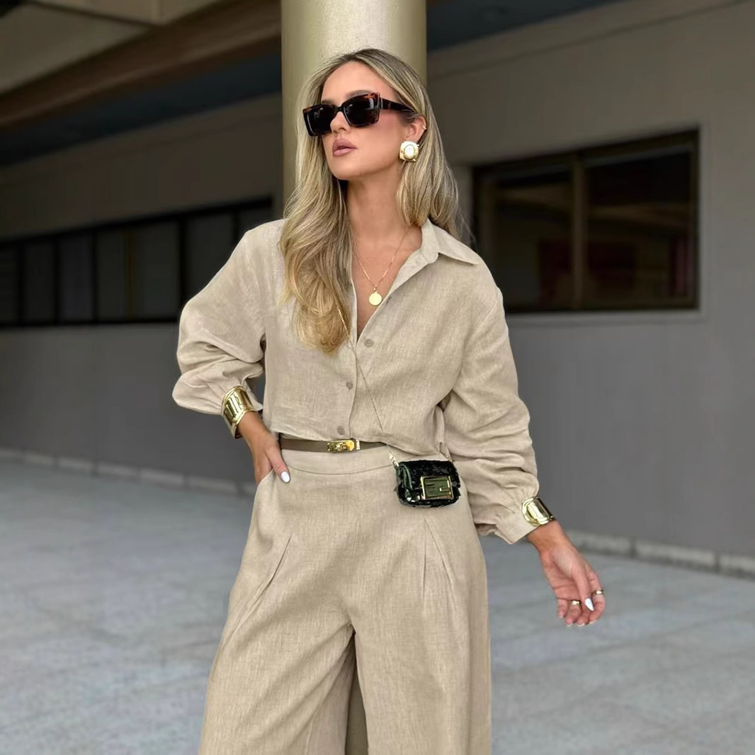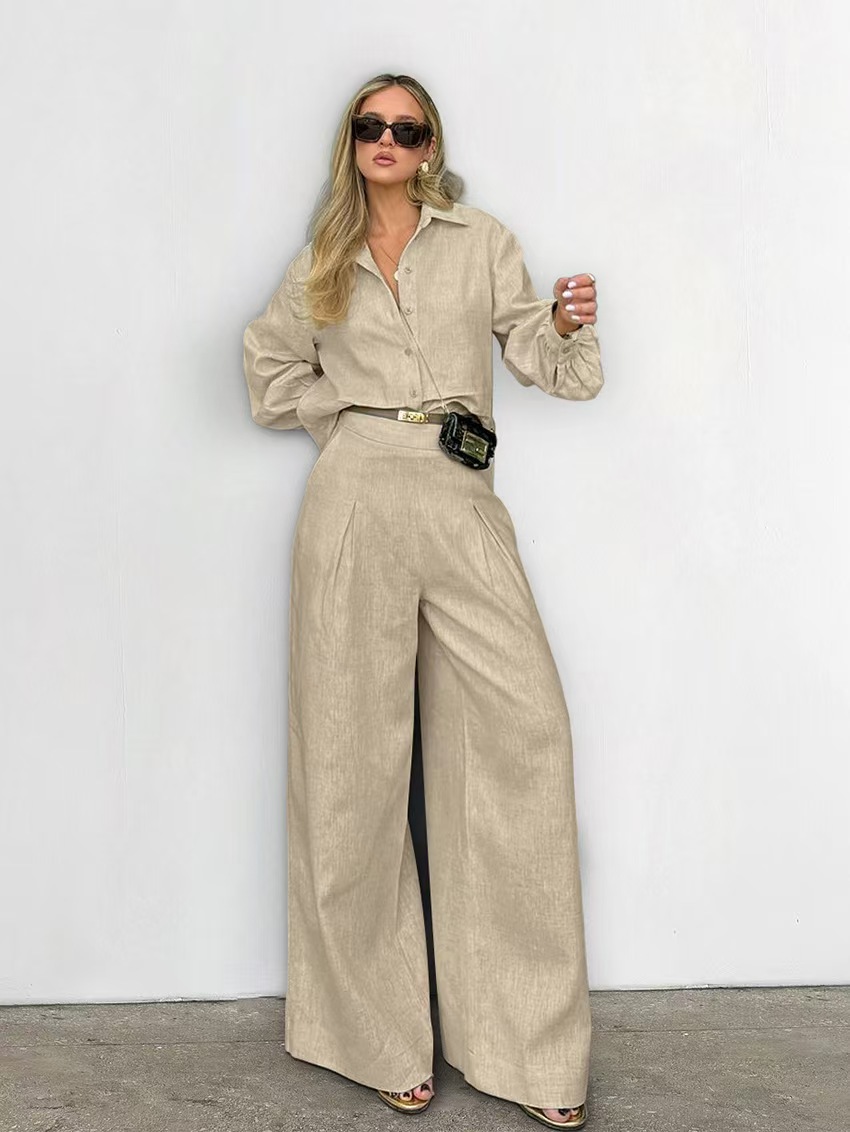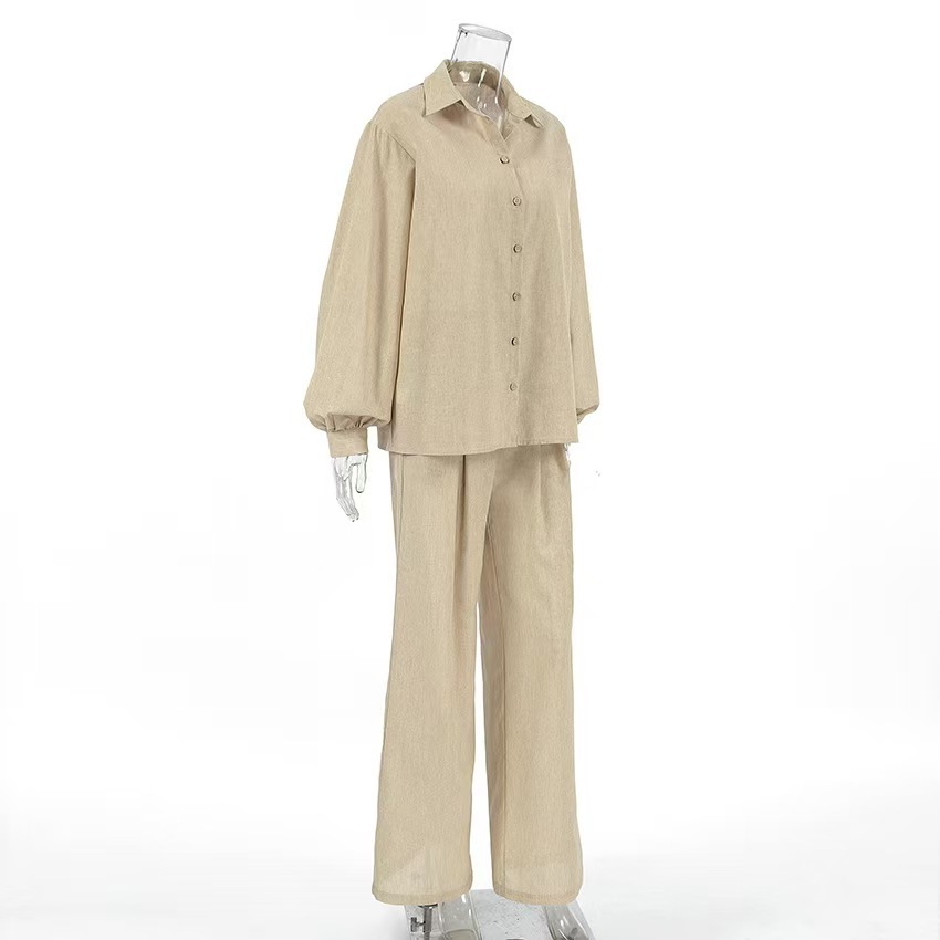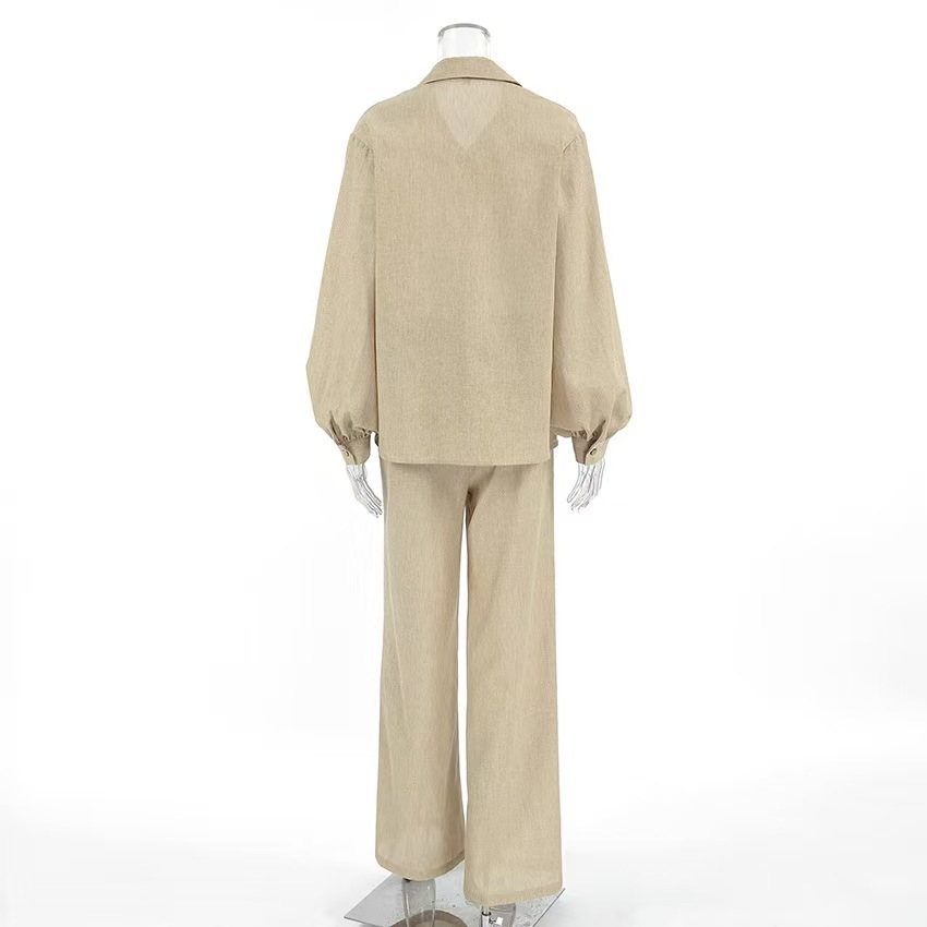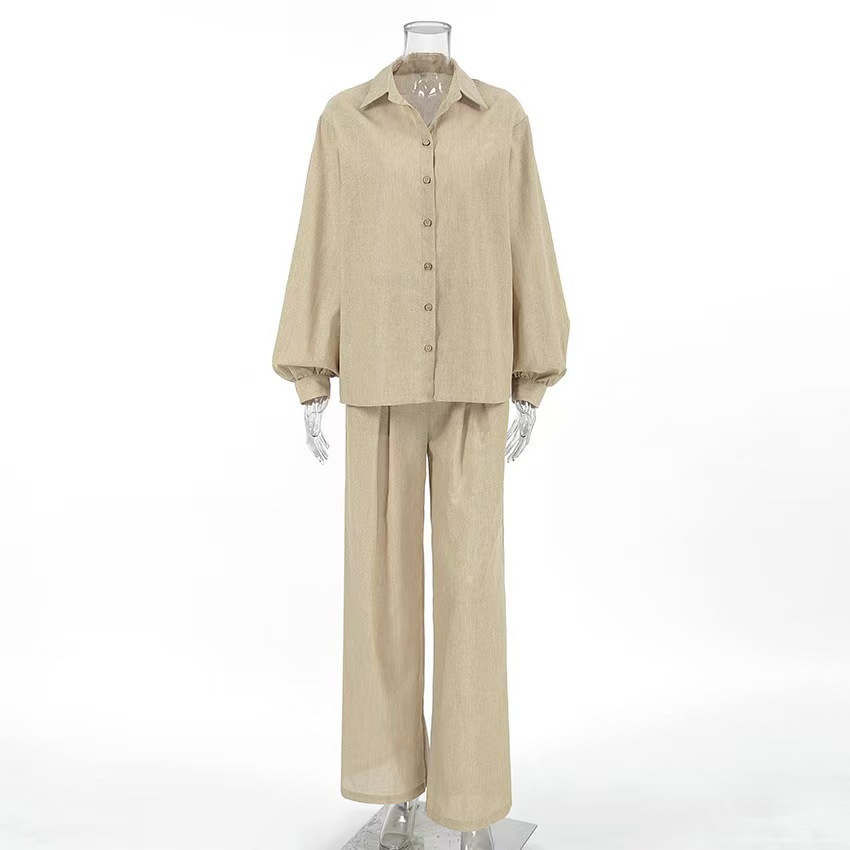 Womens Casual Khaki Cotton-Linen Two-Piece Set Loose-Fit Shirt And Wide-Leg Pants