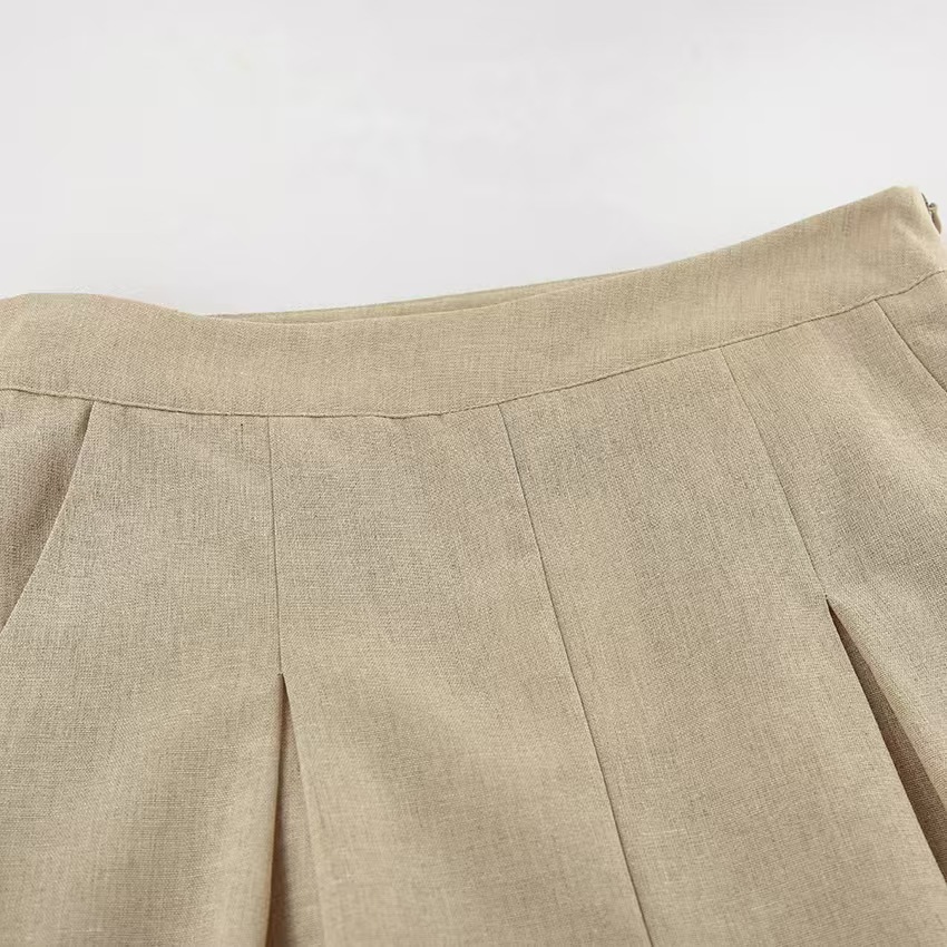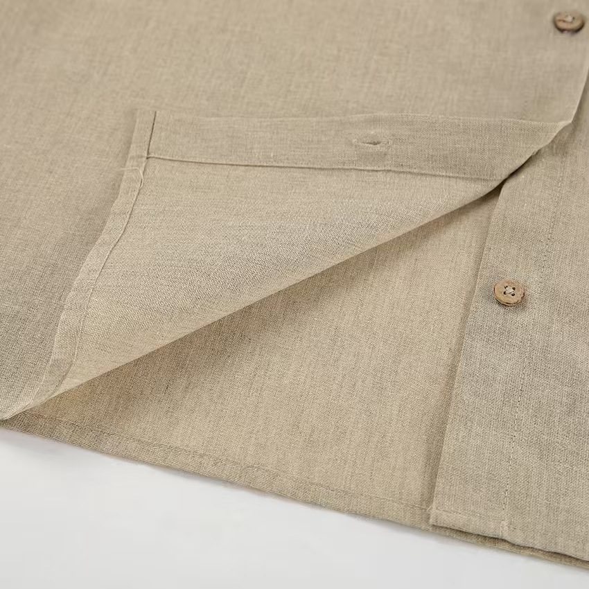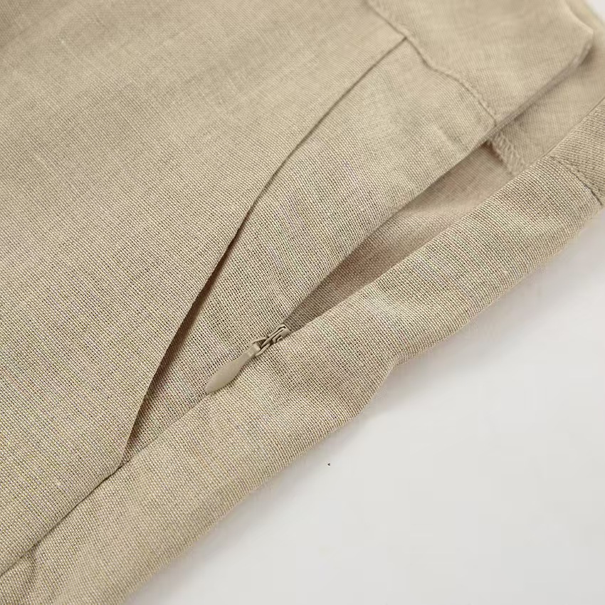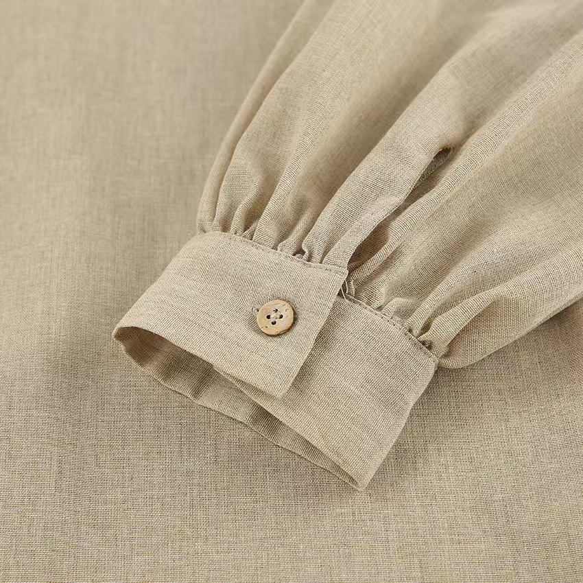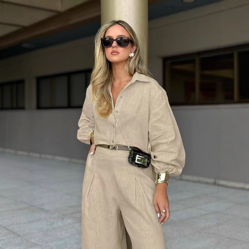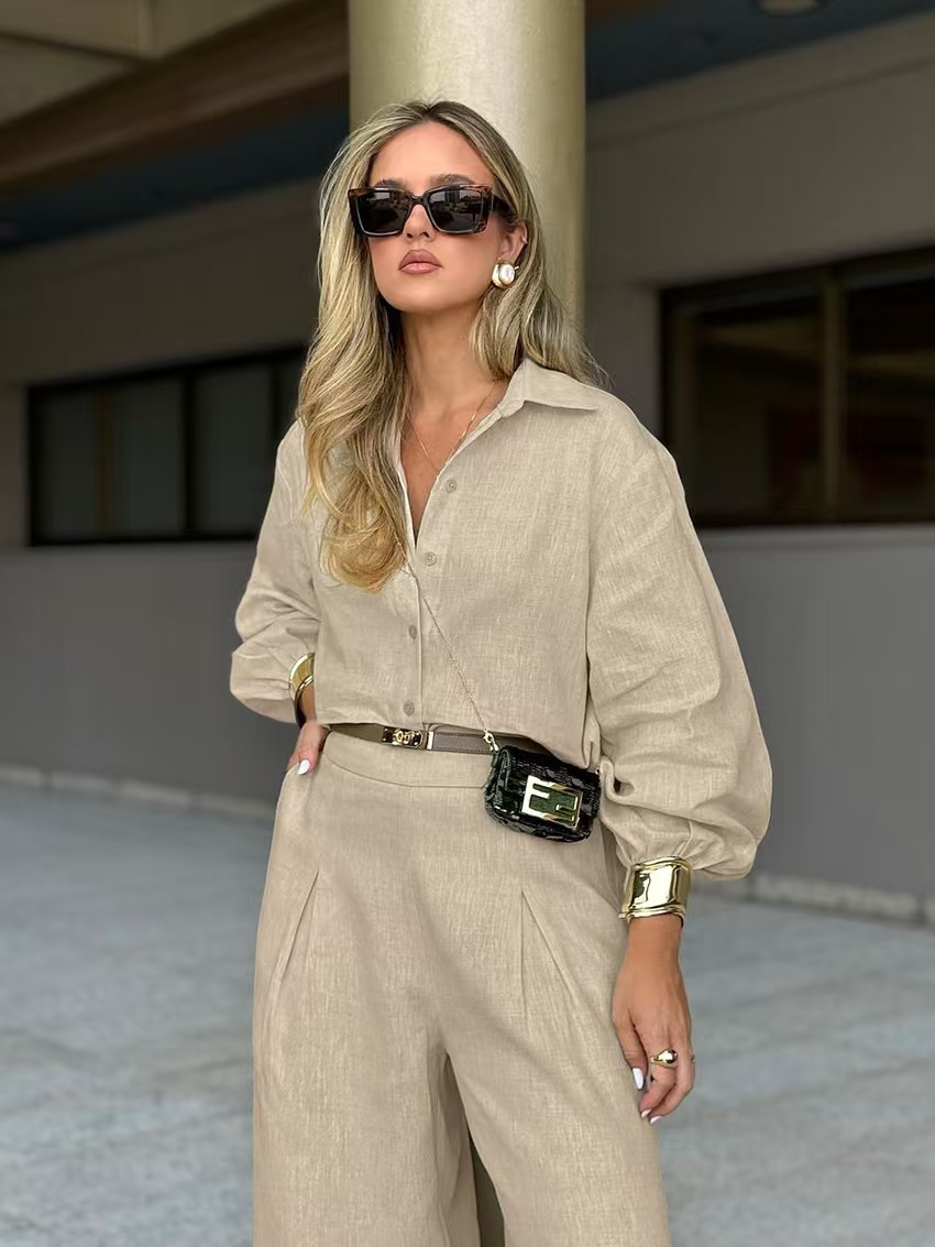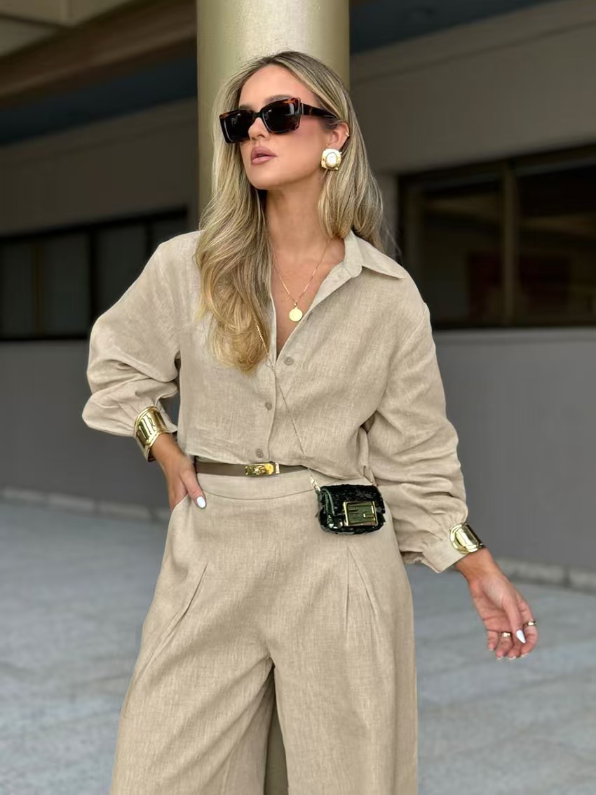 Womens Casual Khaki Cotton-Linen Two-Piece Set Loose-Fit Shirt And Wide-Leg Pants