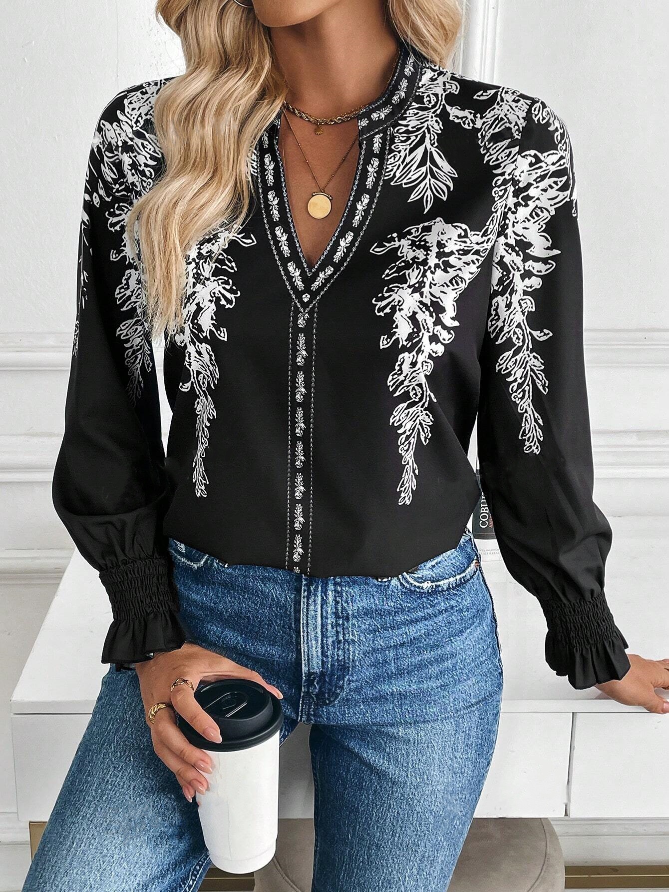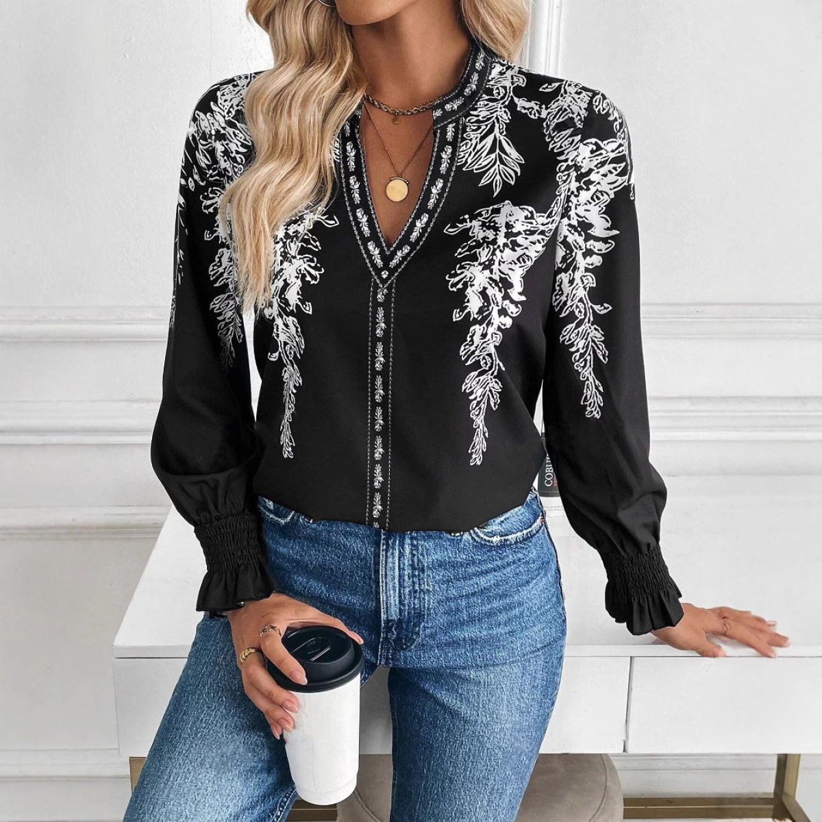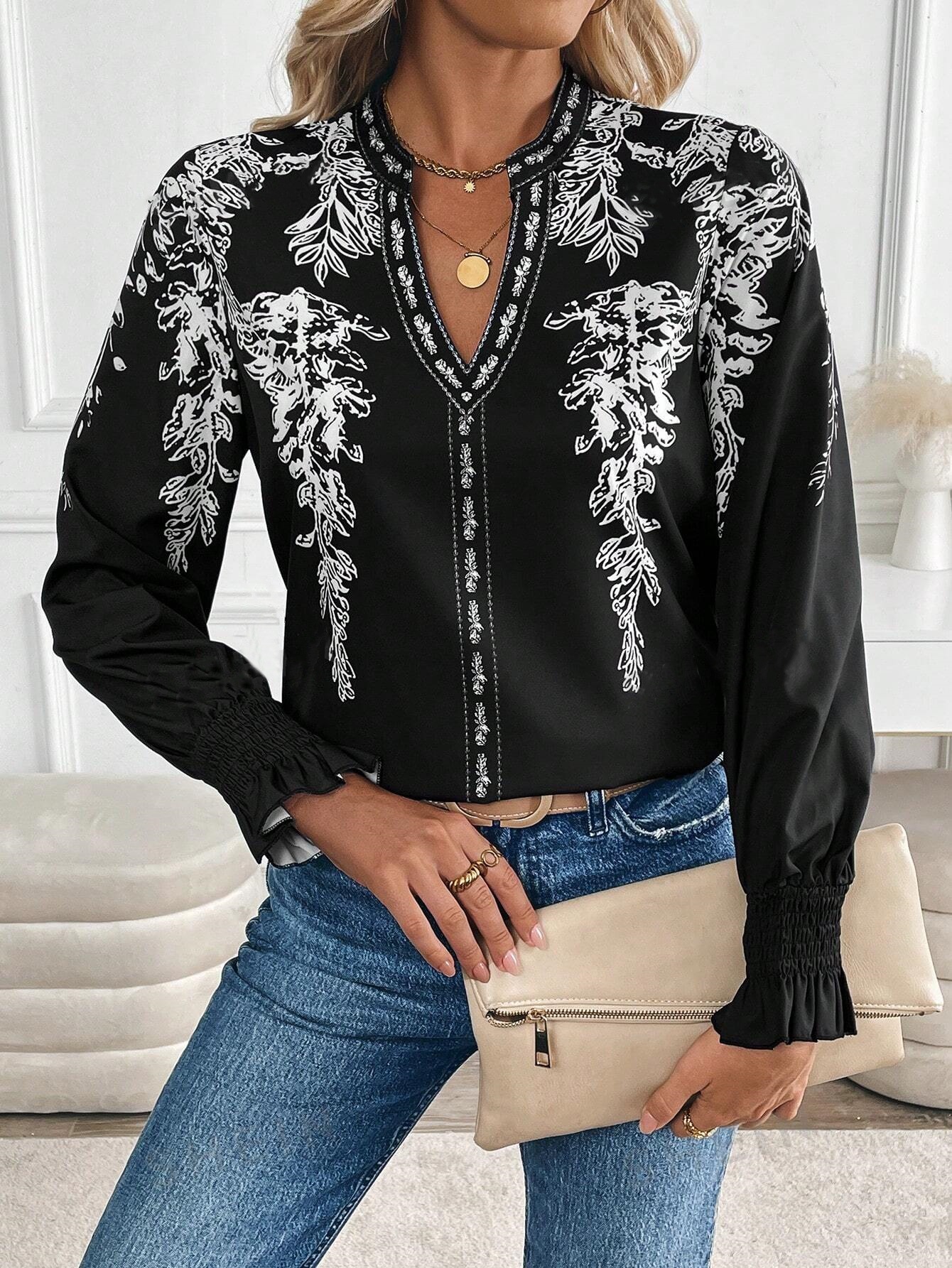 Womens Casual Long-sleeve V-neck Blouse