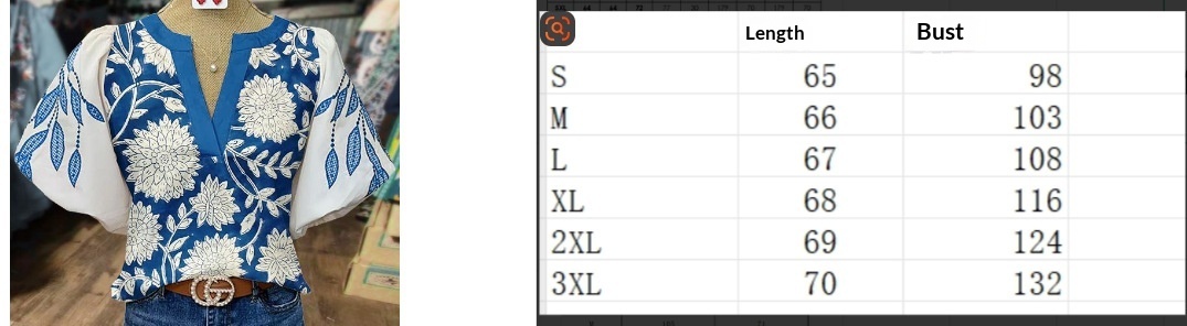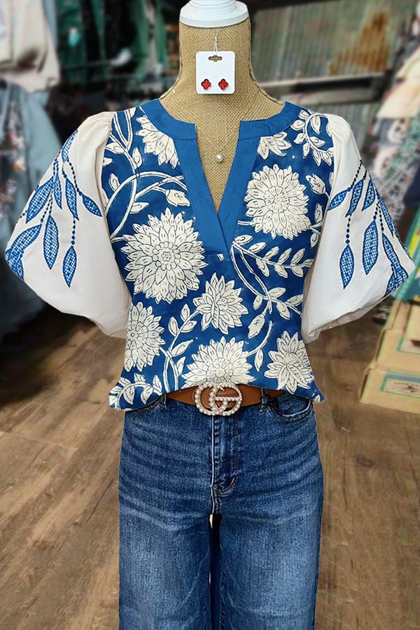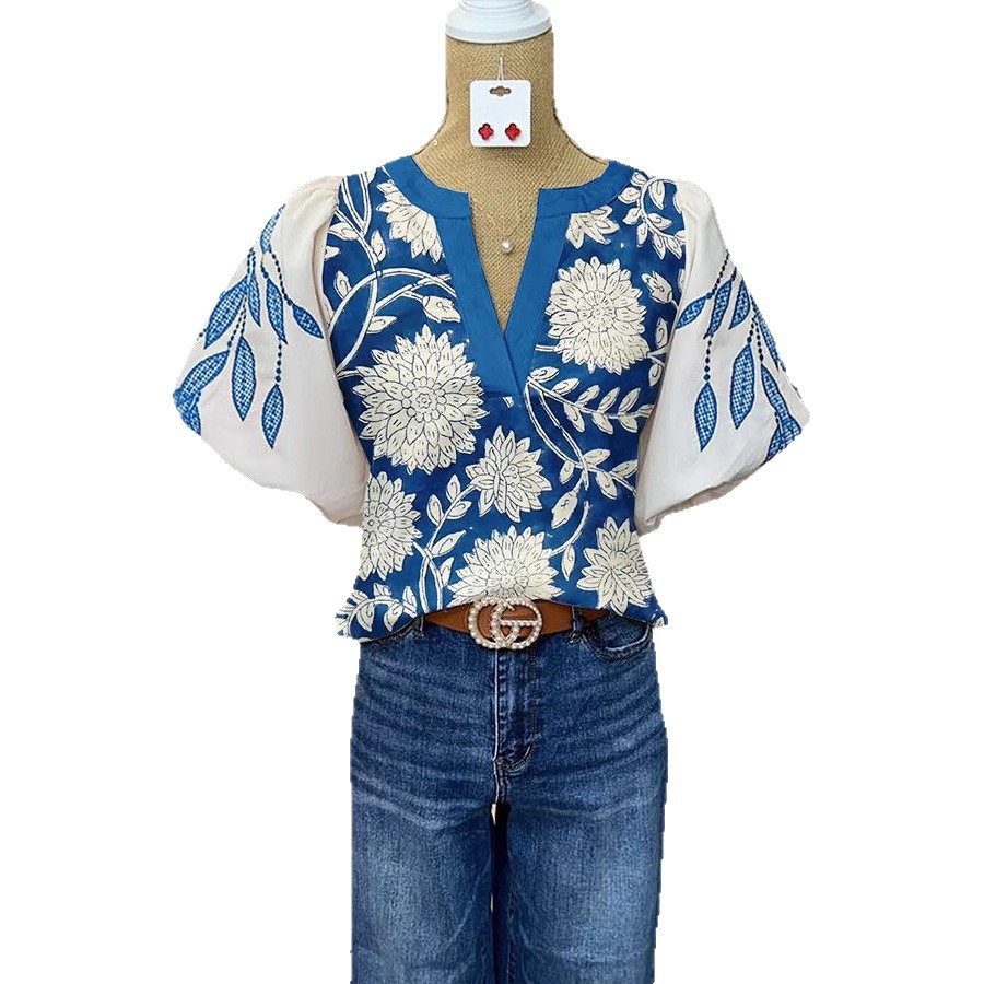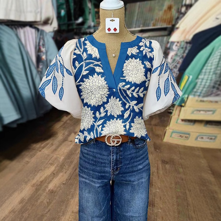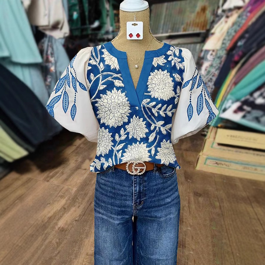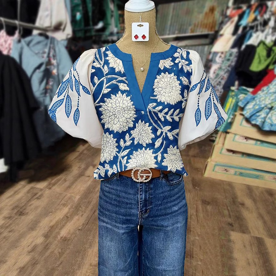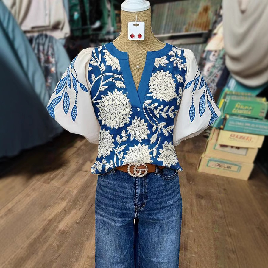 Women's Casual Loose Ethnic Print Lantern Sleeve Shirt