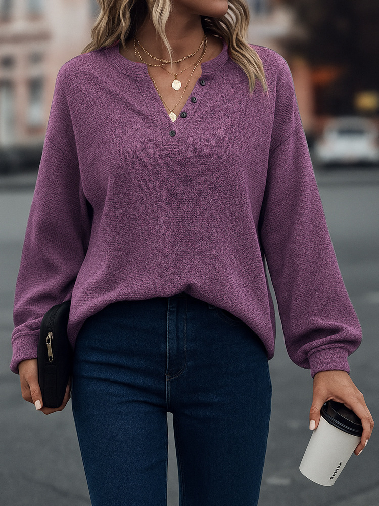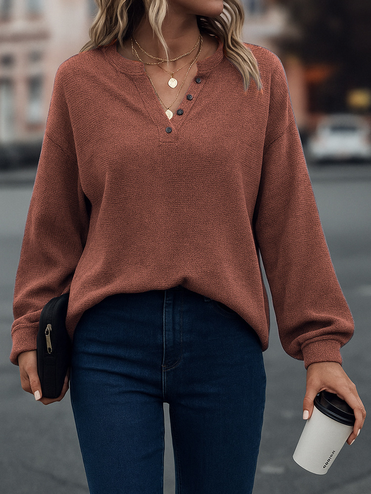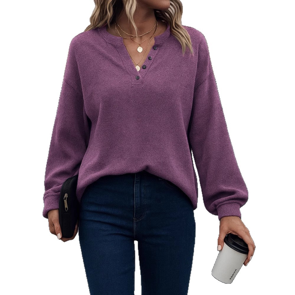Women's Casual Loose-Fit Fashion Solid-Color Long-Sleeve V-Neck Pullover Top