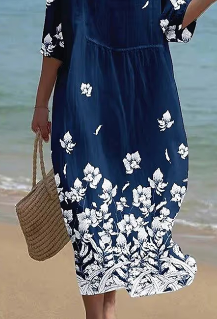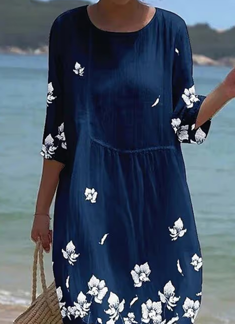 Women's Casual Round Neck Mid Sleeve Print Cotton And Linen Dress