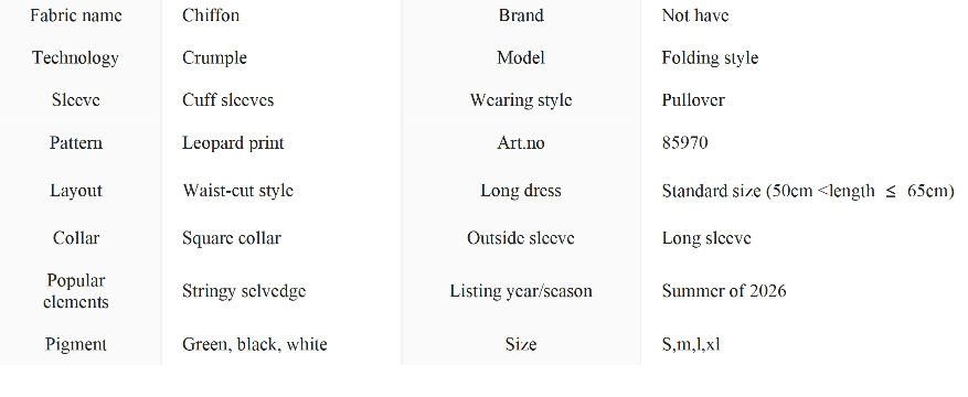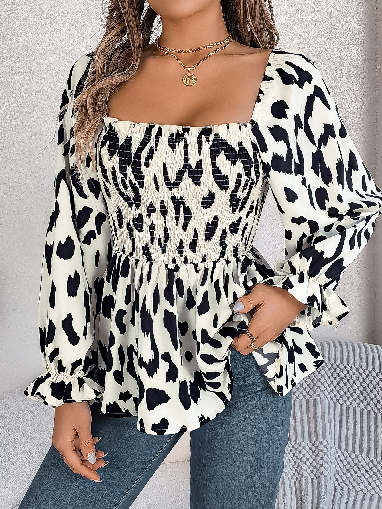 Women's Casual Ruffle Trim Square Neck Leopard Print Long Sleeve Chiffon Top