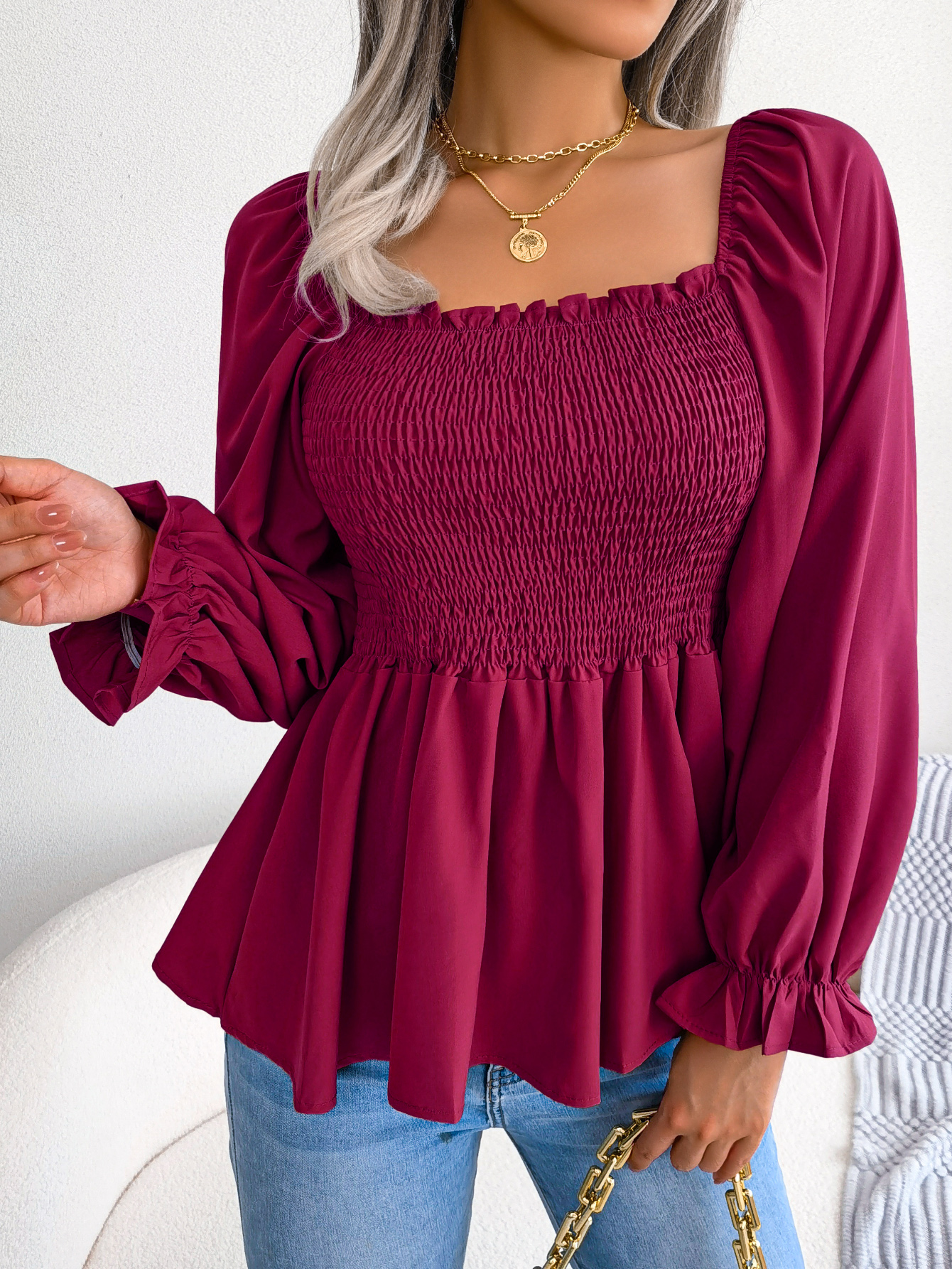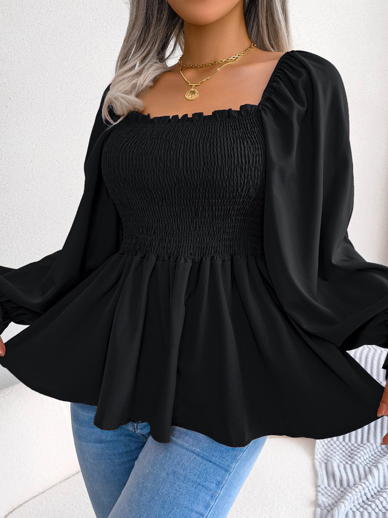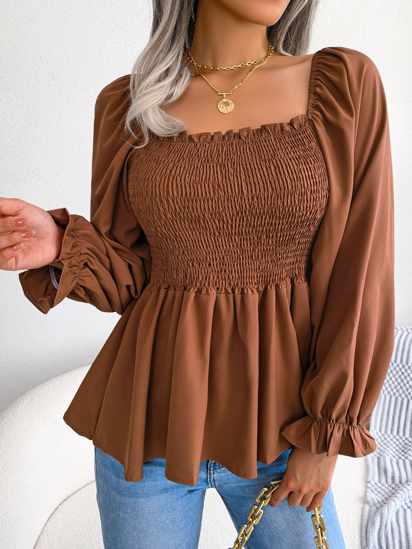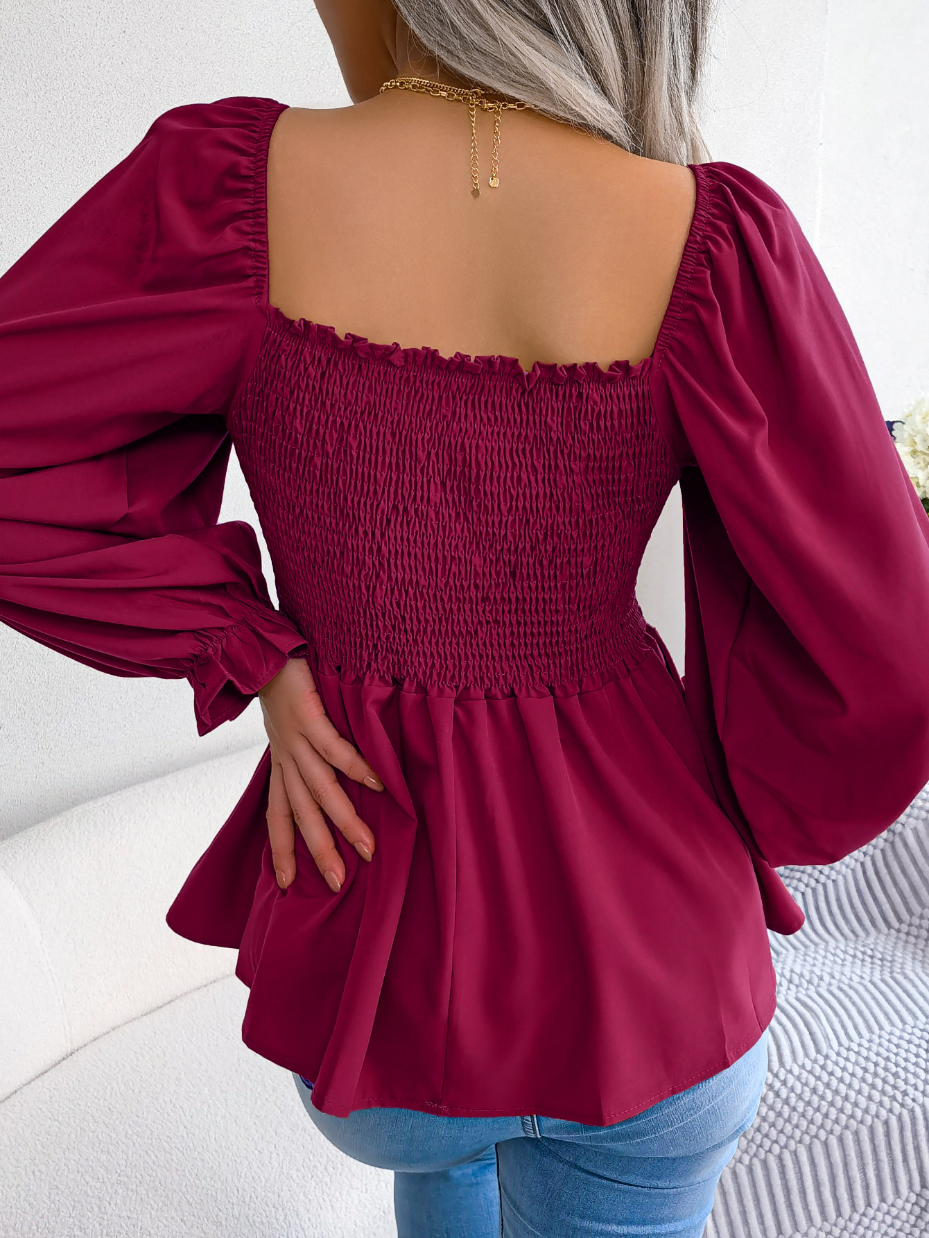 Women's Casual Ruffle Trim Square Neck Long Sleeve Chiffon Top
