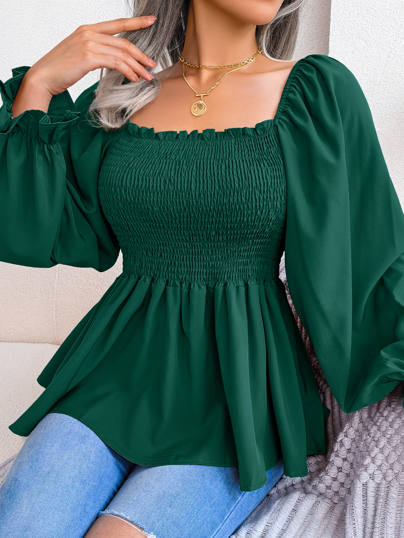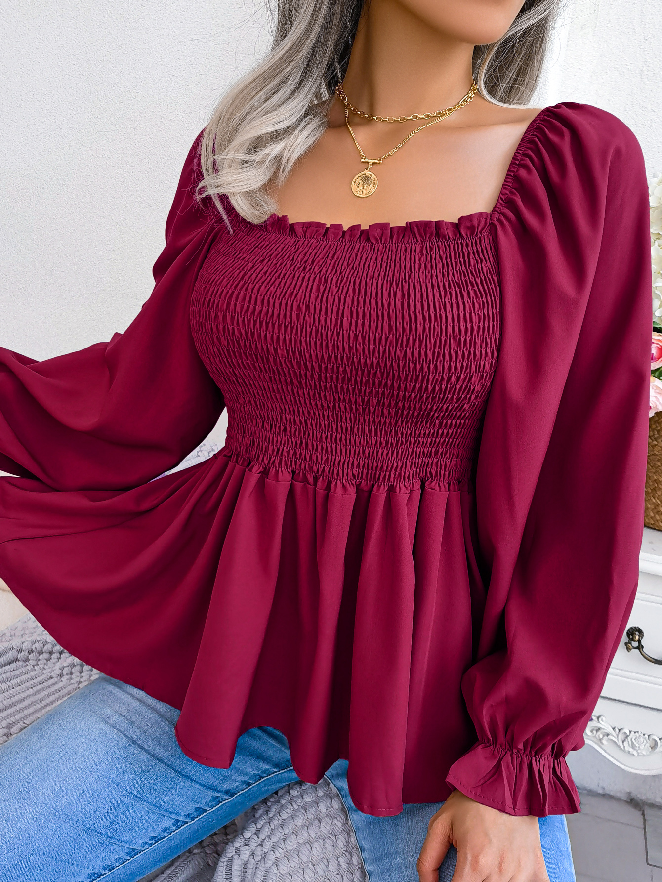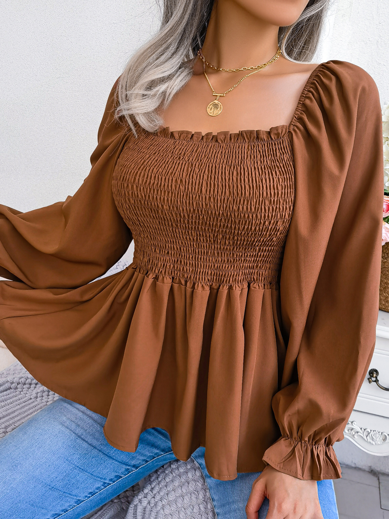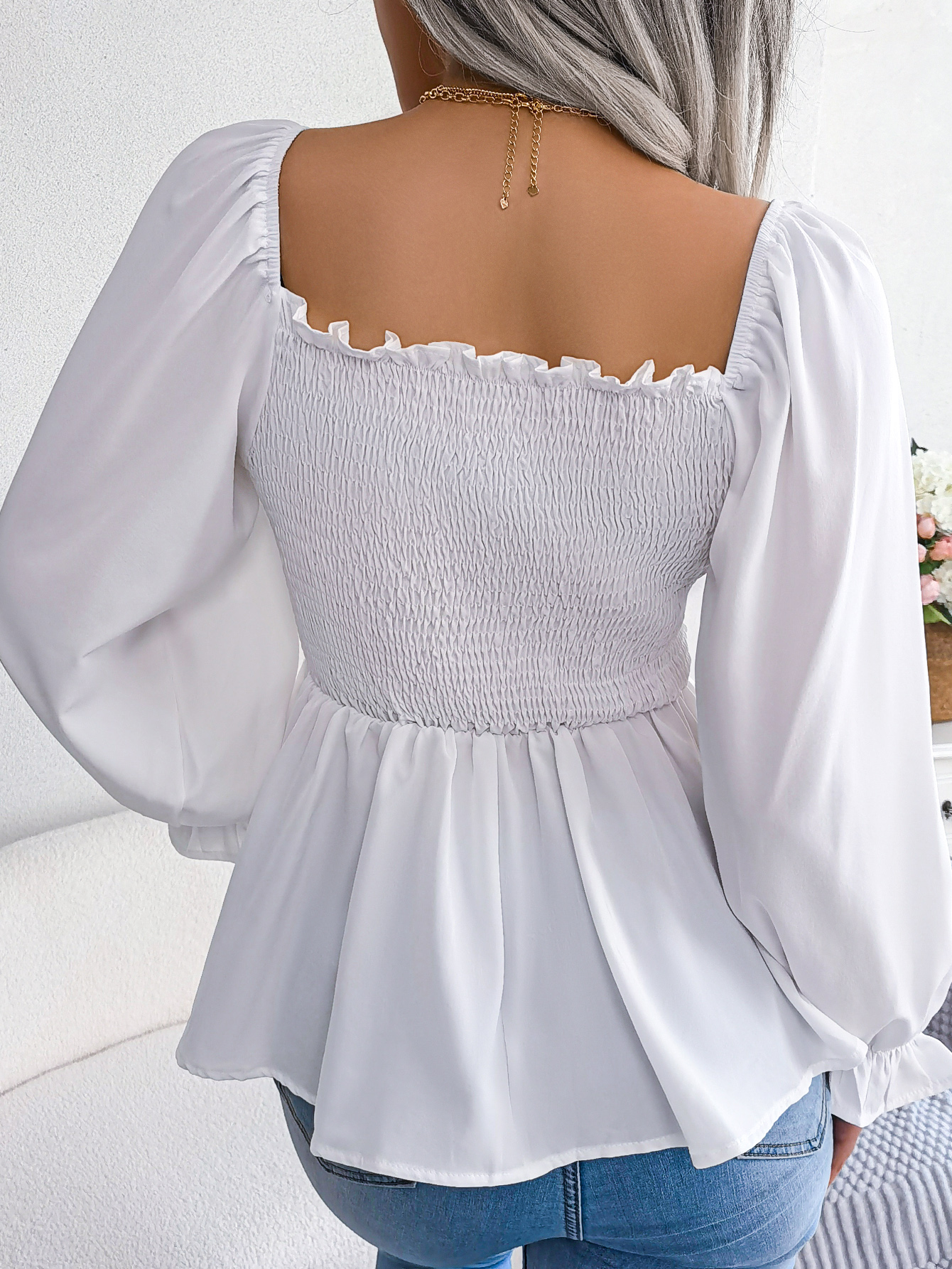 Women's Casual Ruffle Trim Square Neck Long Sleeve Chiffon Top