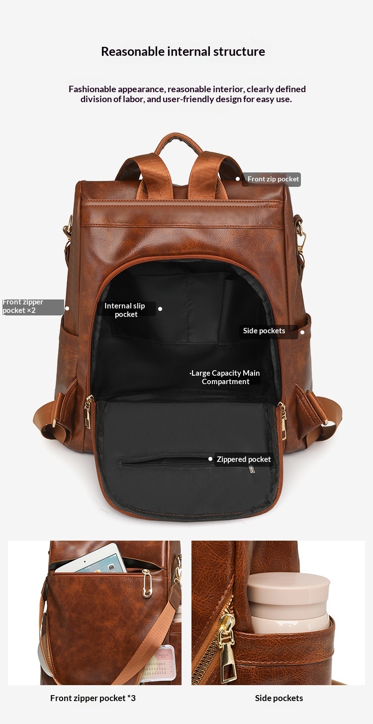 Internal bag structure: zippered hidden pocket, phone pocket, compartmentalized zippered pocket