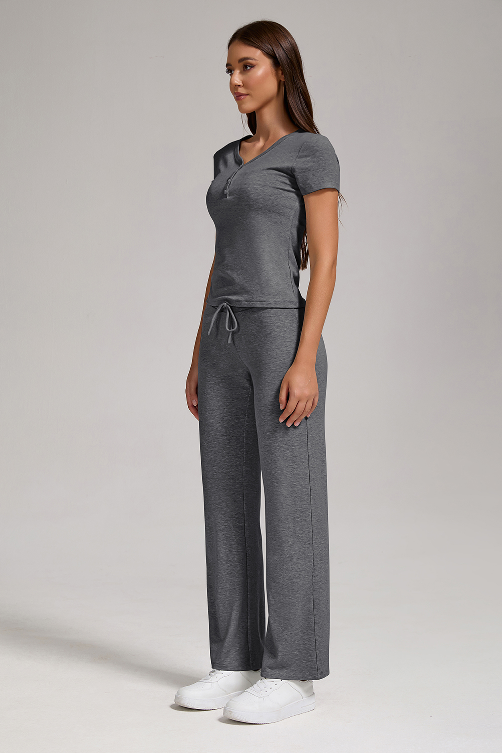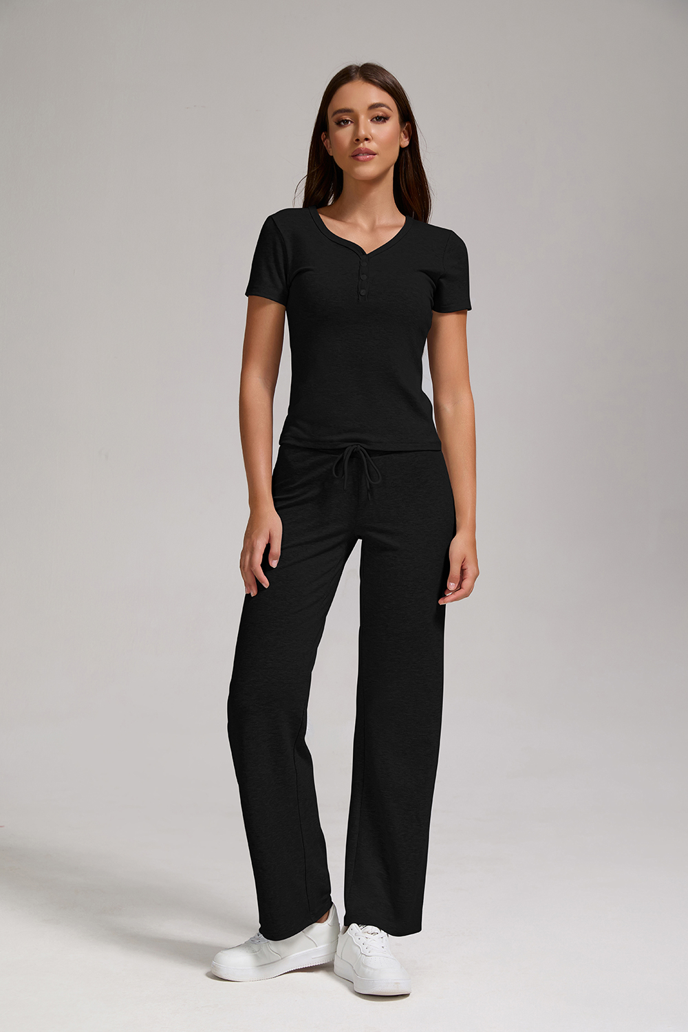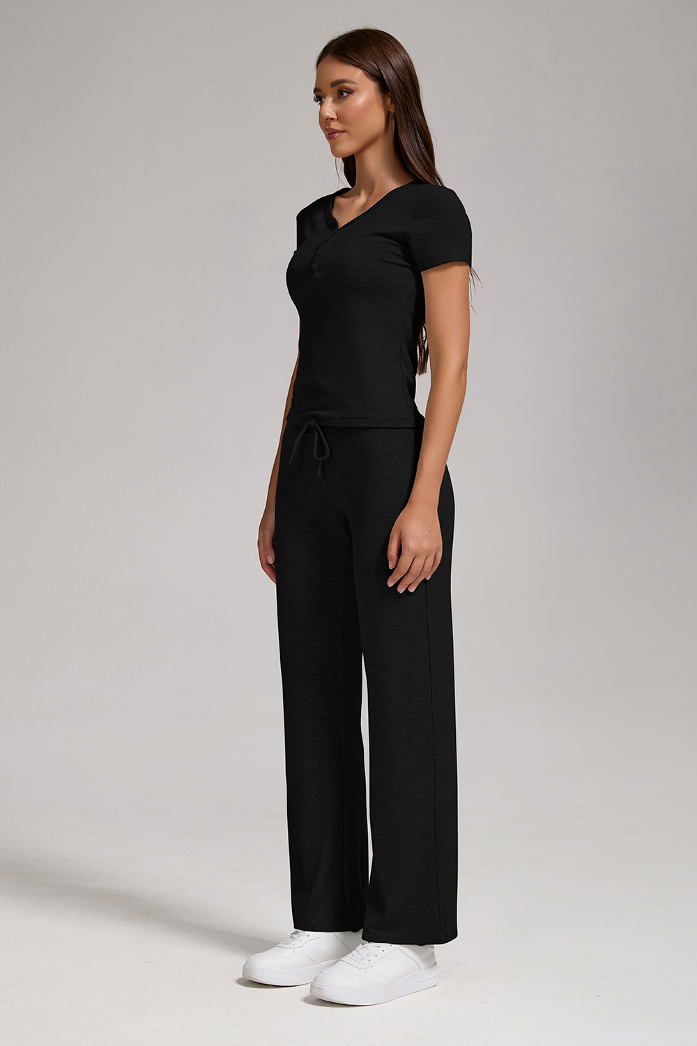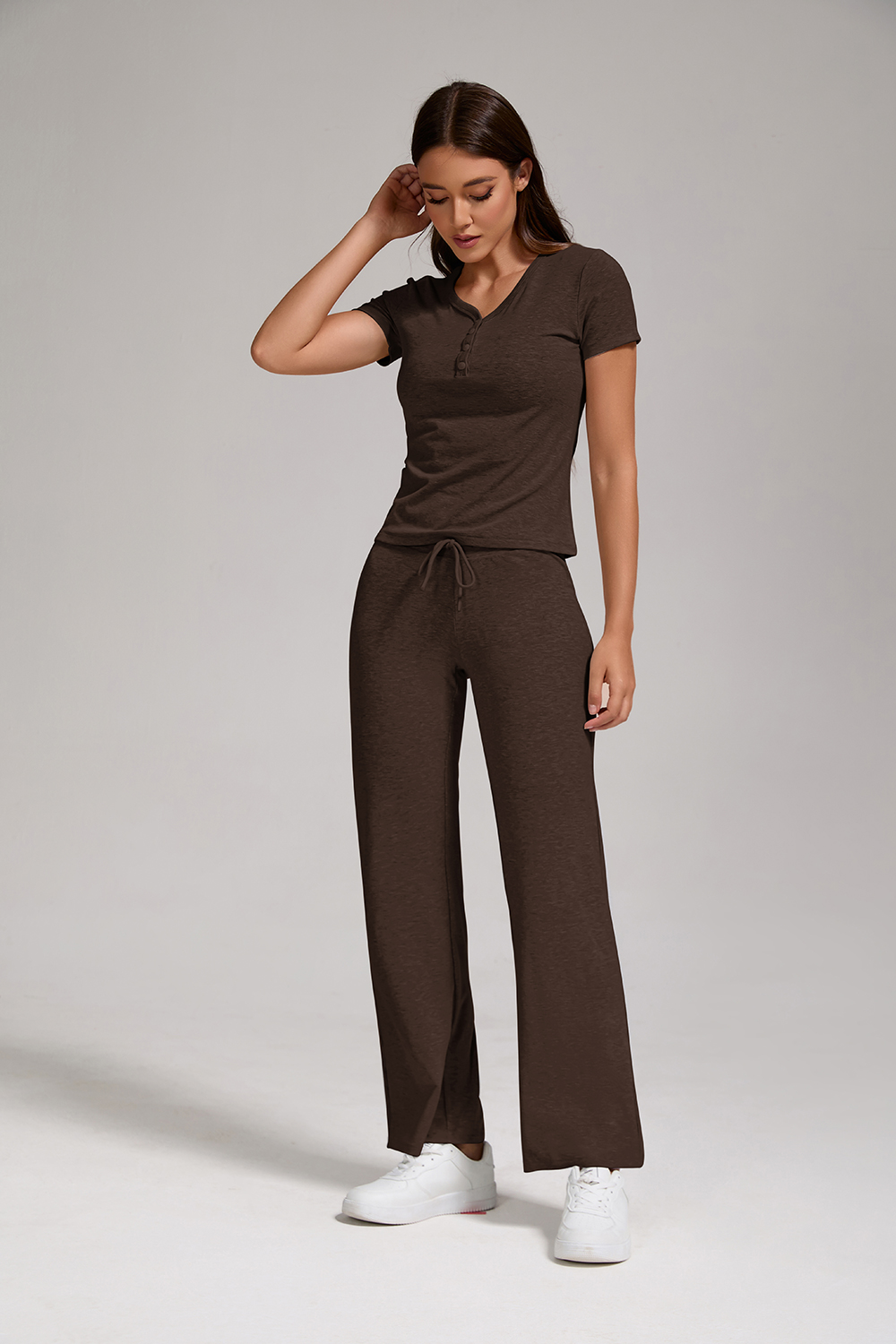 Women's Casual Sports Two-piece Set With V-neck Button, Short Sleeved, Low Waisted Flared Pants, Sportswear