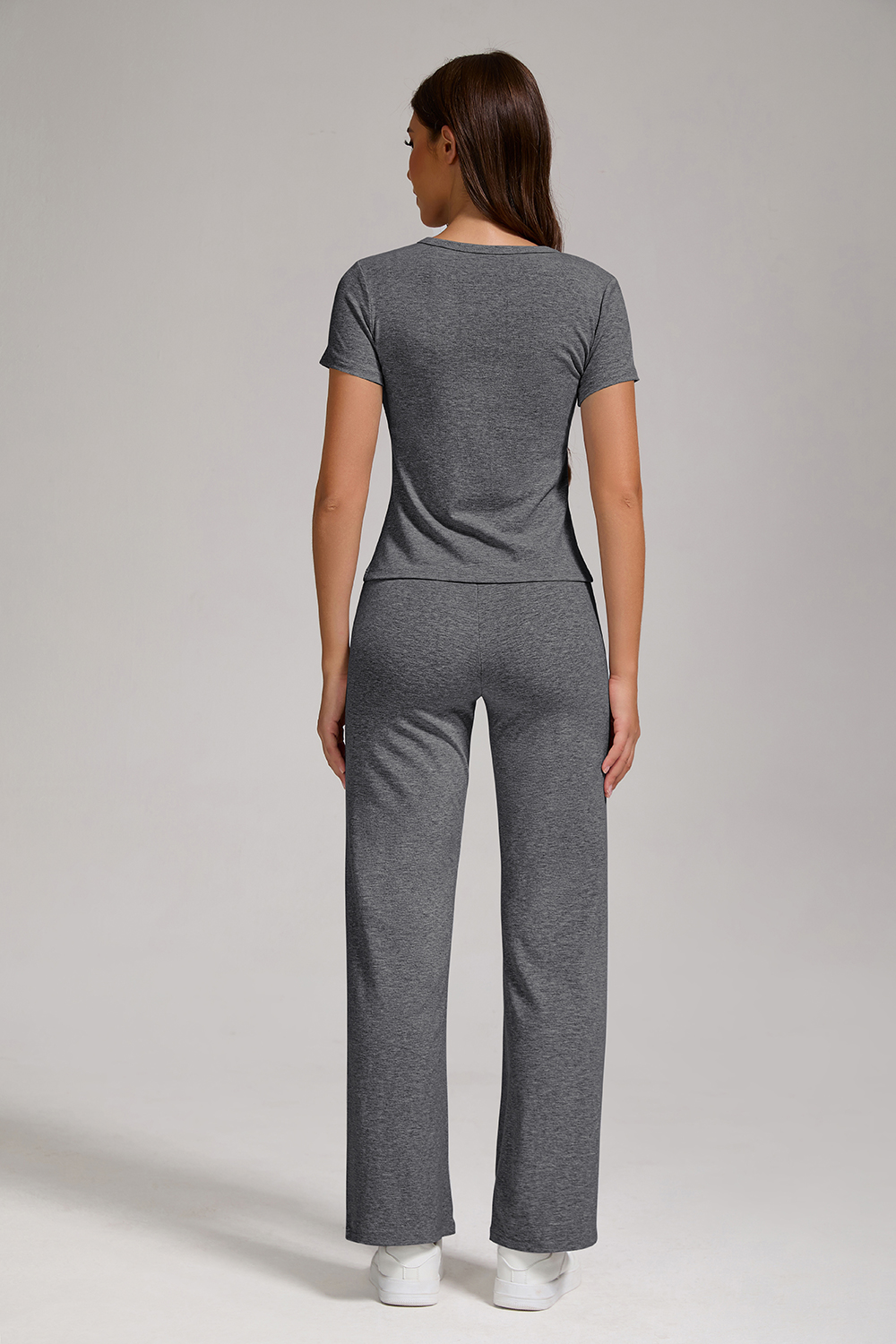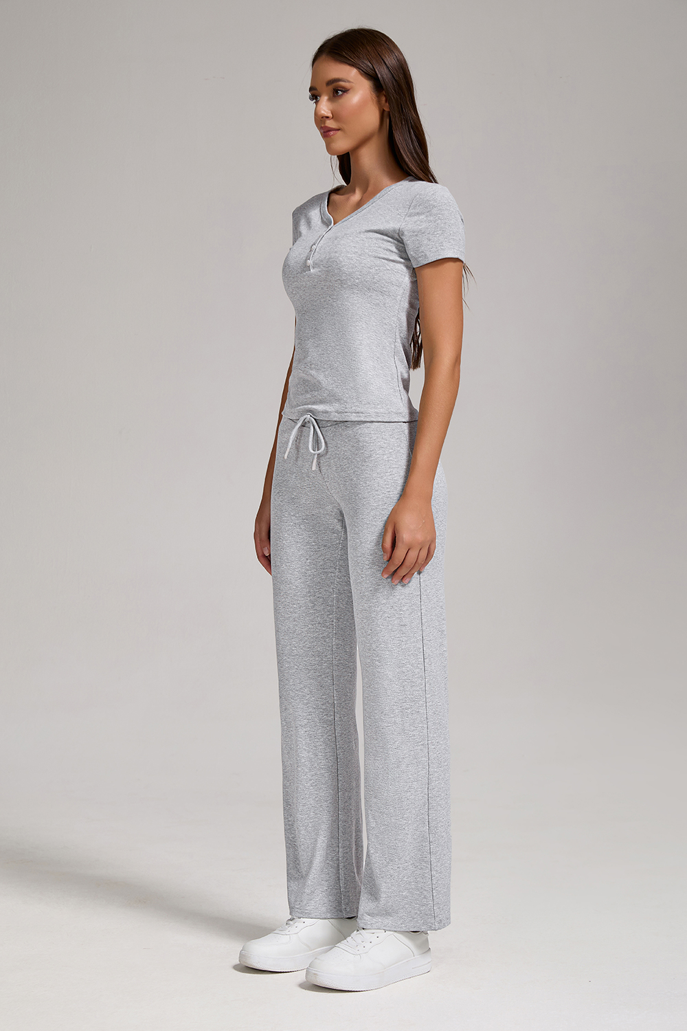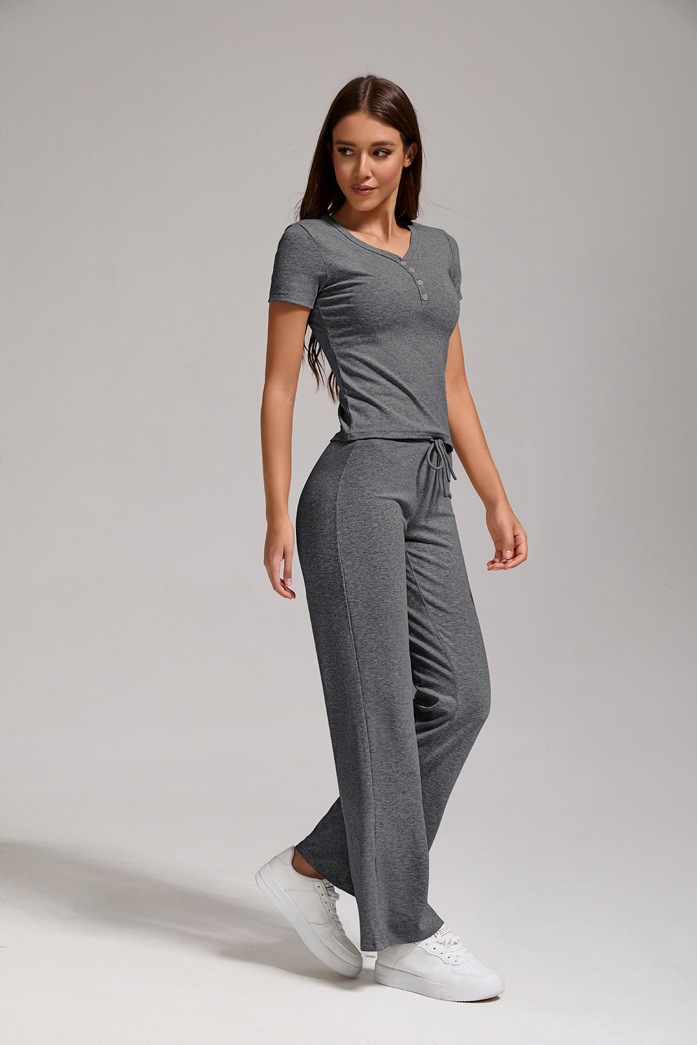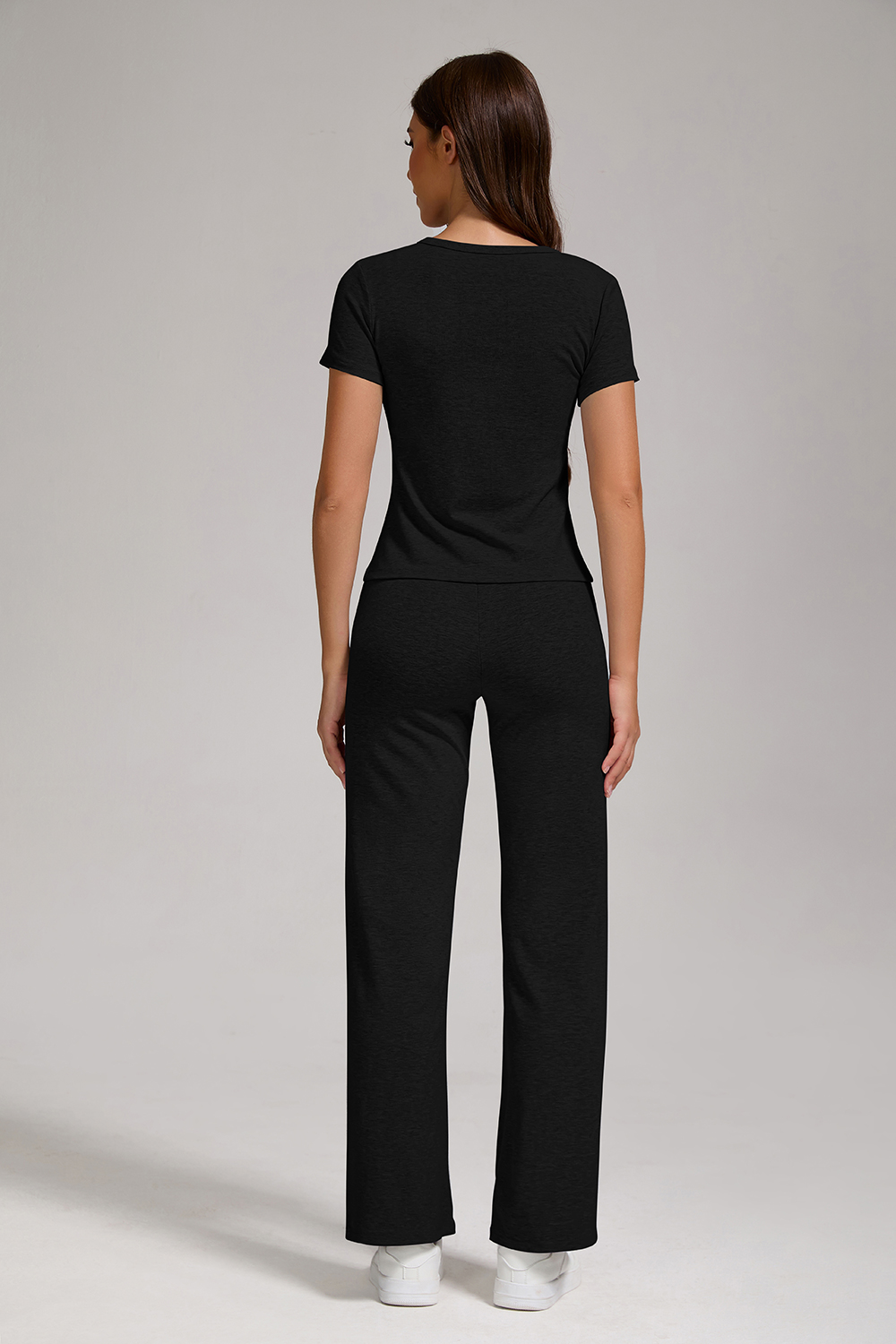 Women's Casual Sports Two-piece Set With V-neck Button, Short Sleeved, Low Waisted Flared Pants, Sportswear