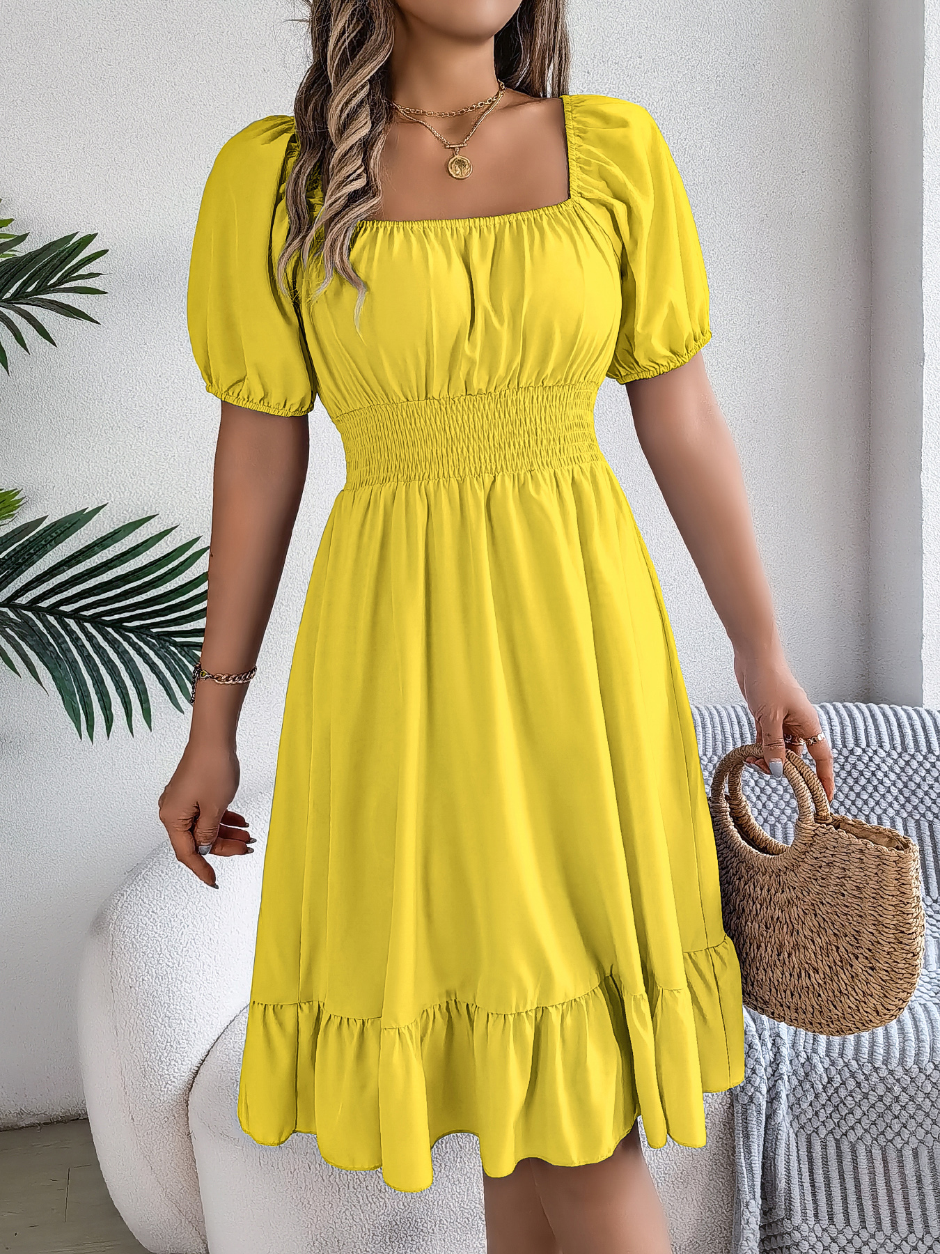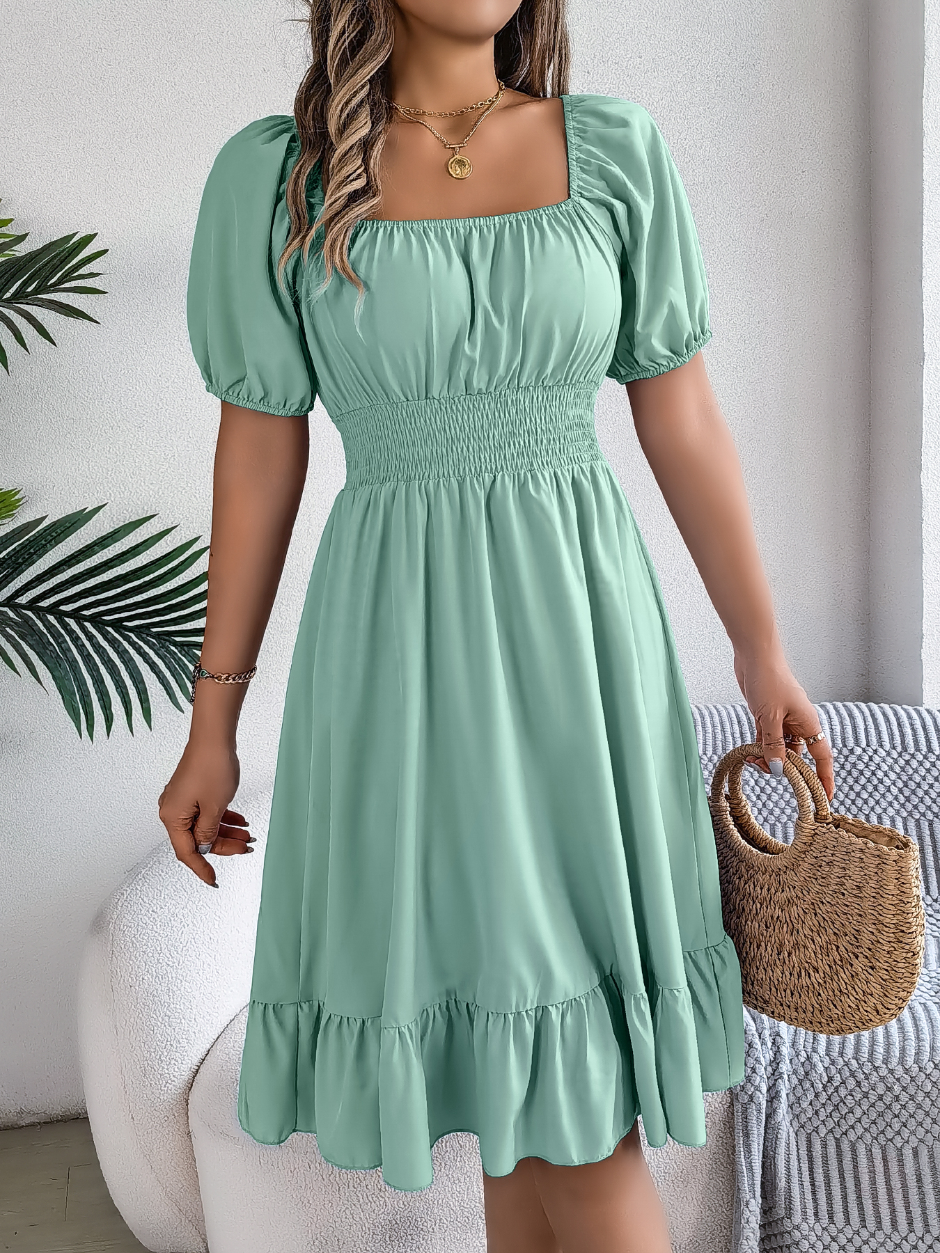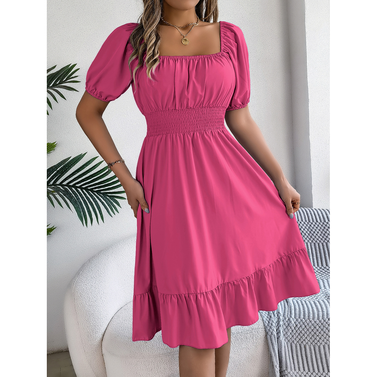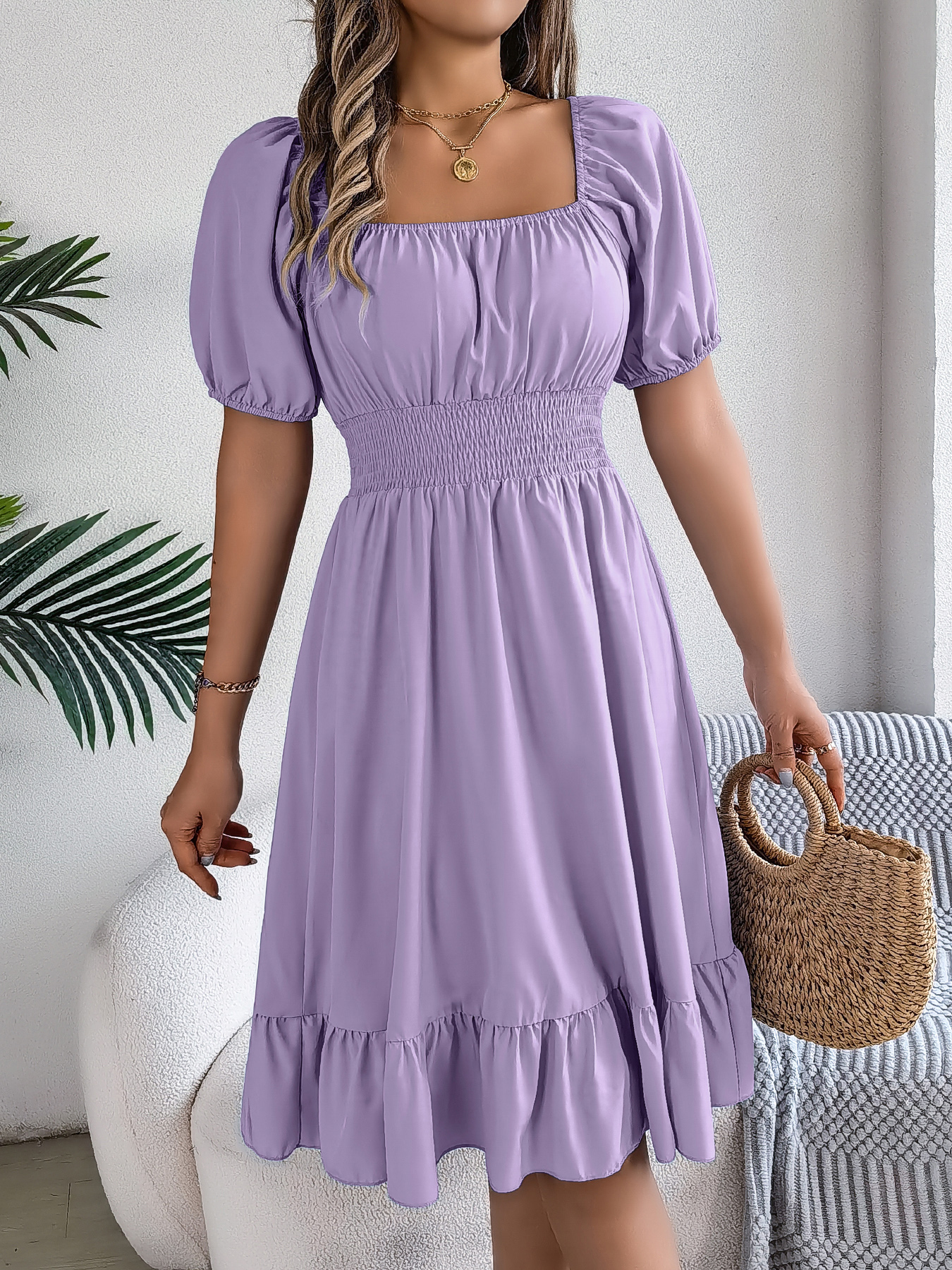 Women's Casual Square Neck Short Sleeve Tie Waist Ruffle A-Line Dress