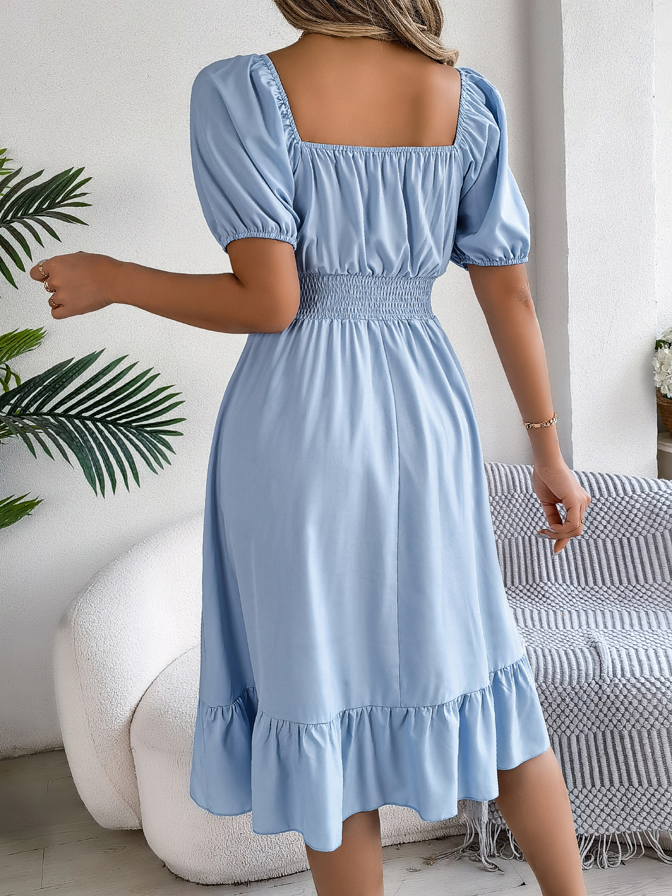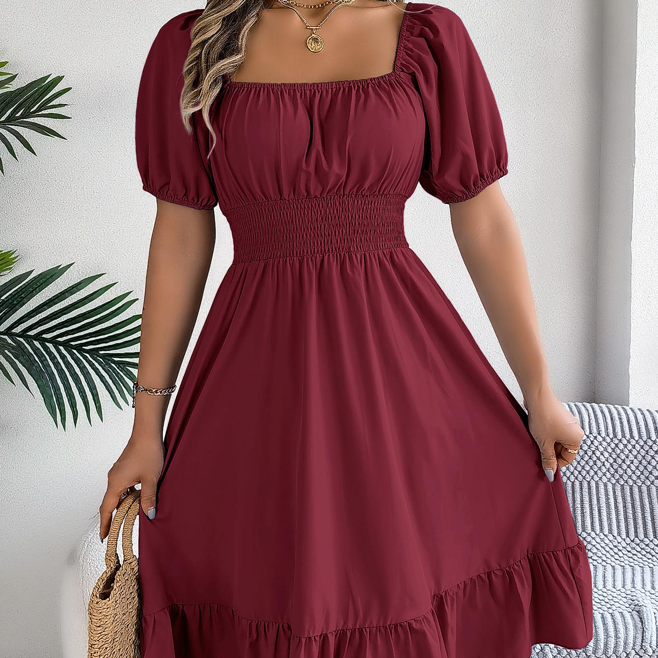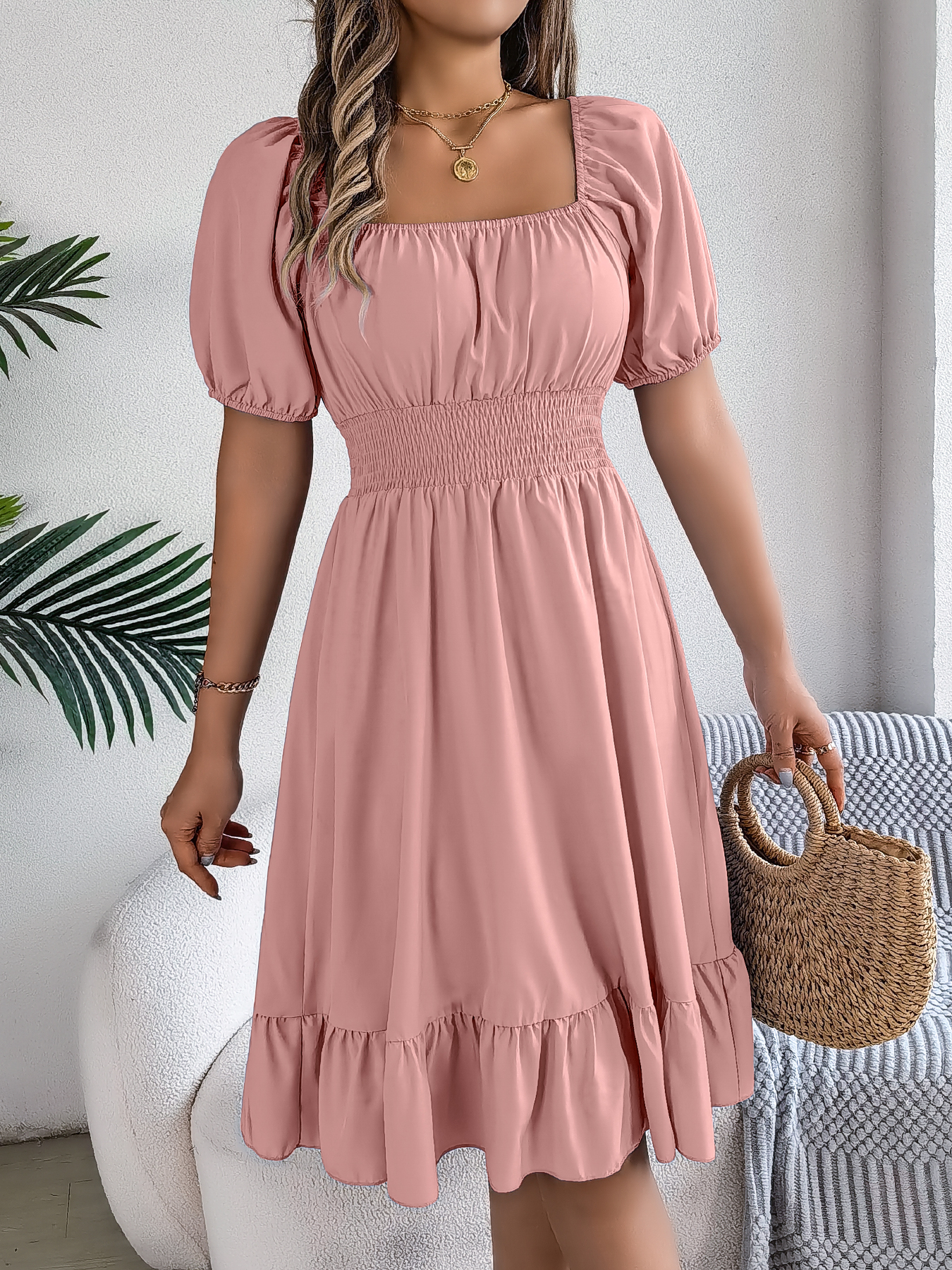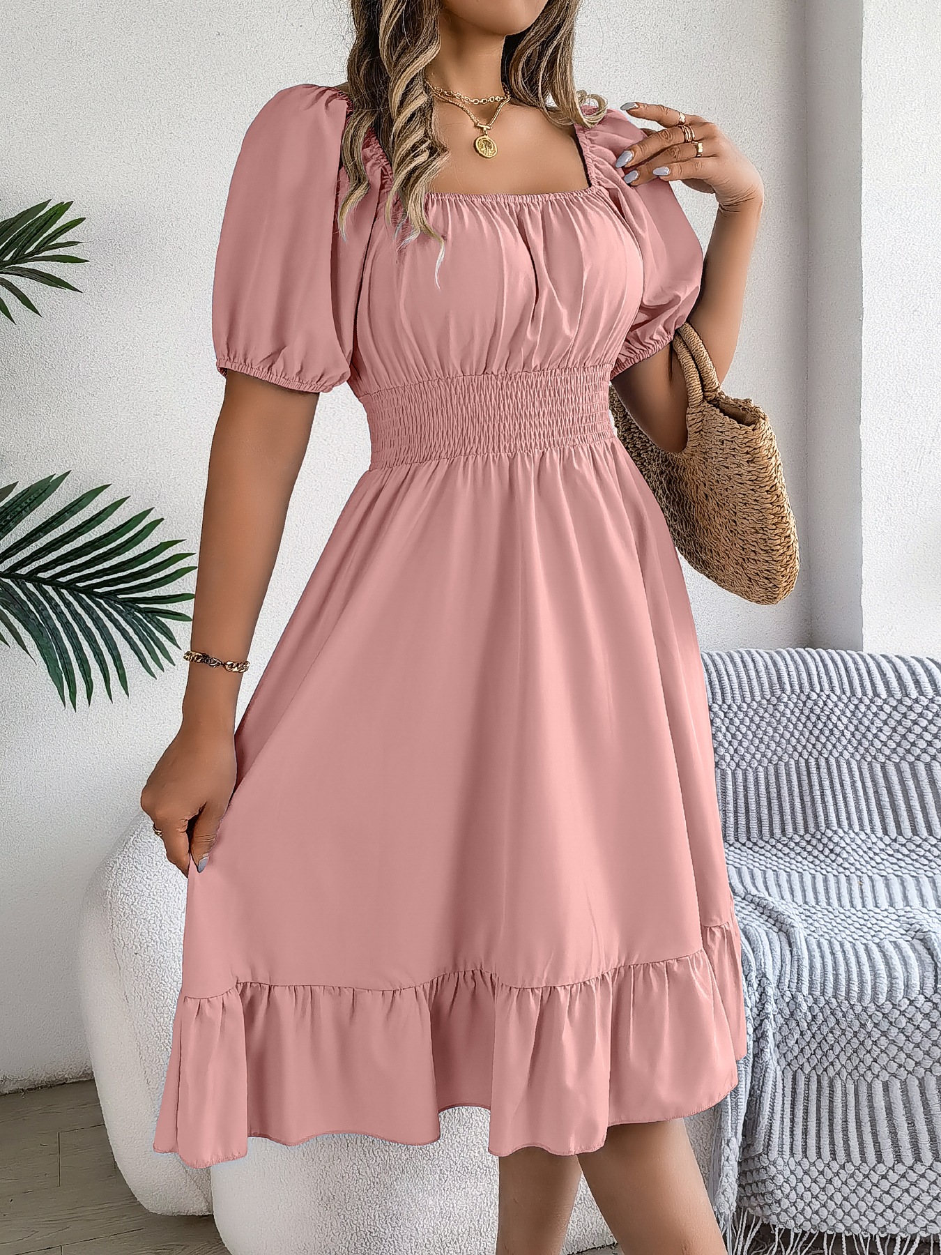Women's Casual Square Neck Short Sleeve Tie Waist Ruffle A-Line Dress