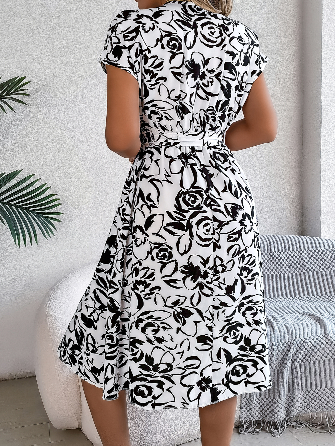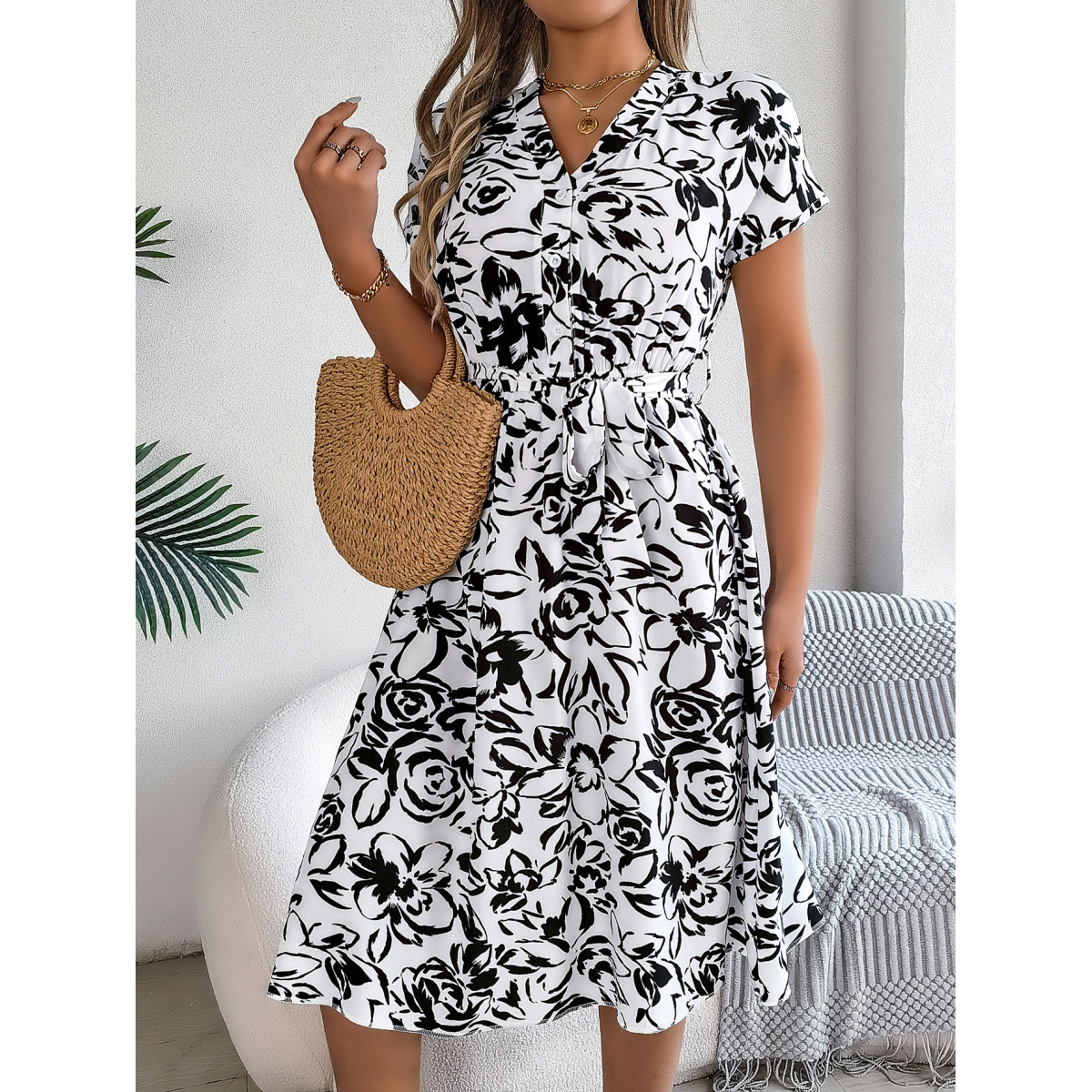 Women's Casual V Neck Button Batwing Sleeve Floral Print Flowy Dress