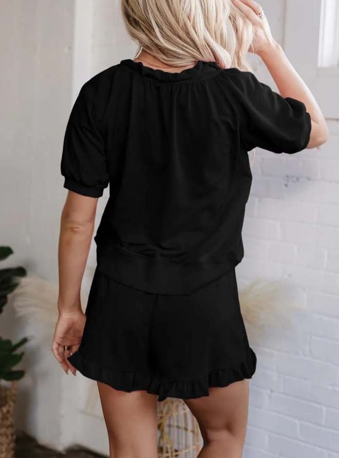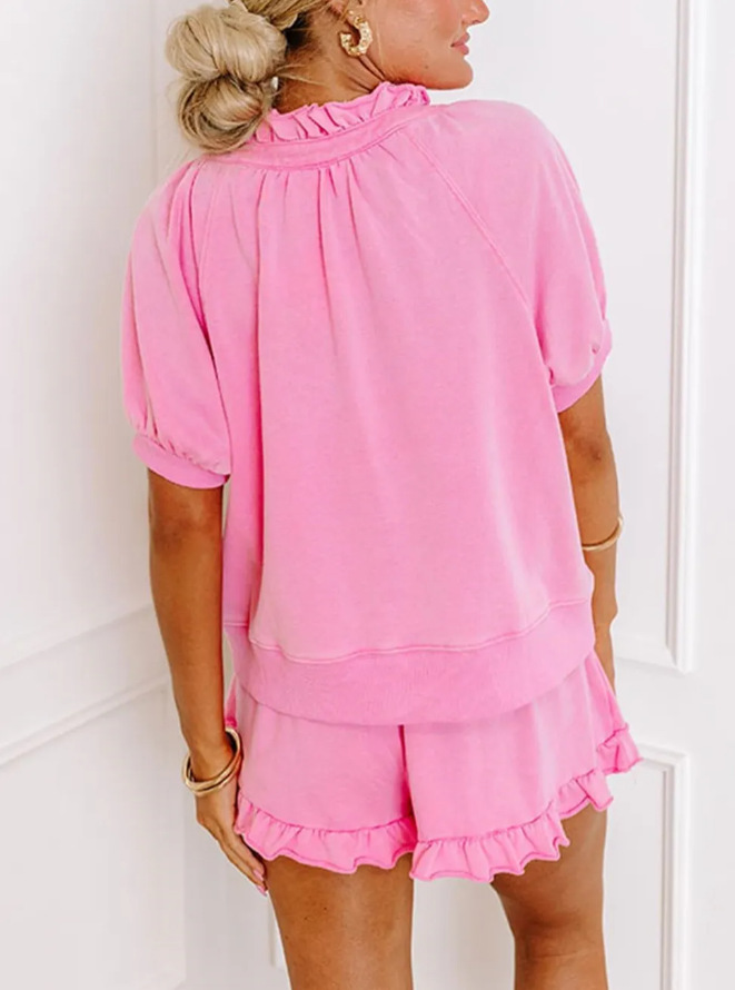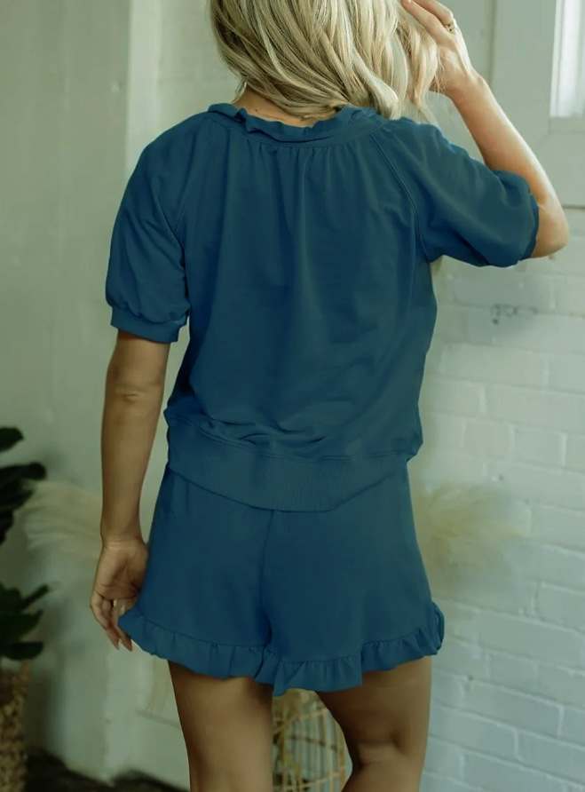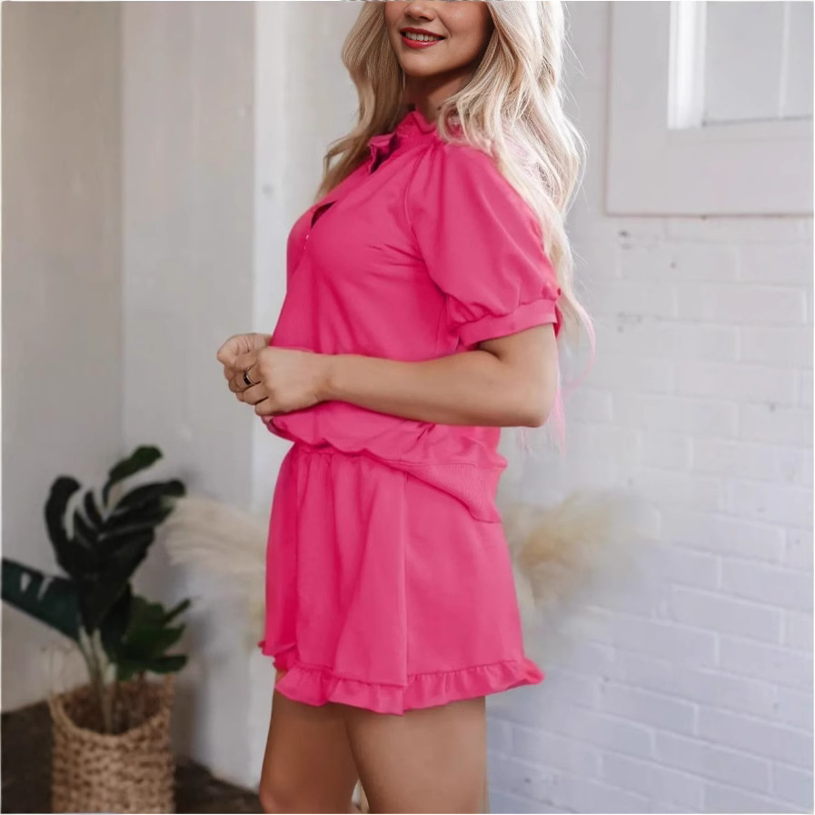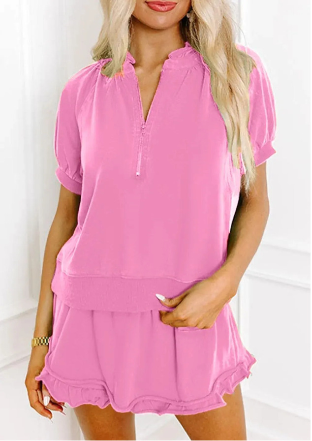 Womens Casual Zippered Fashion Solid-Color Short-Sleeve Two-Piece Set
