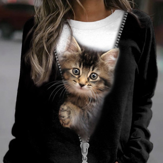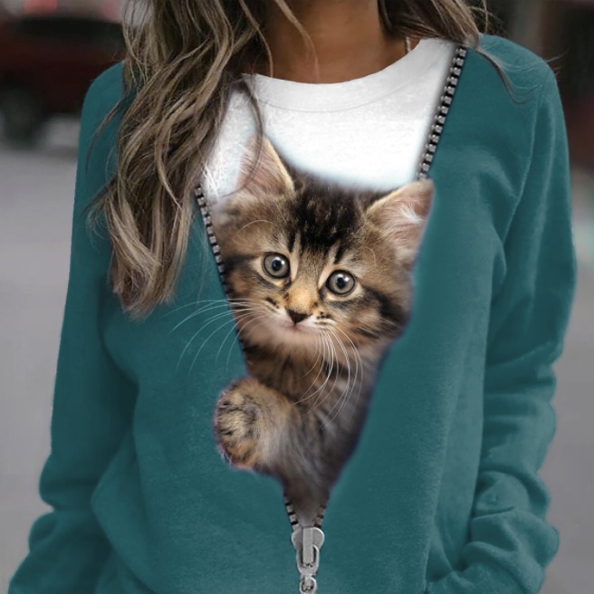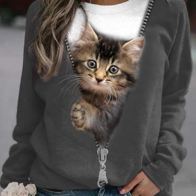 Women's Cat Basic Printed Round Neck Regular Pullover