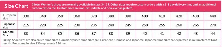 Sizes: 35, 36, 37, 38, 39, 40—custom-made items are non-returnable and non-exchangeable; 41—custom-made items are non-returnable and non-exchangeable; 42—custom-made items are non-returnable and non-exchangeable; 43—custom-made items are non-returnable and non-exchangeable; 44—custom-made items are non-returnable and non-exchangeable