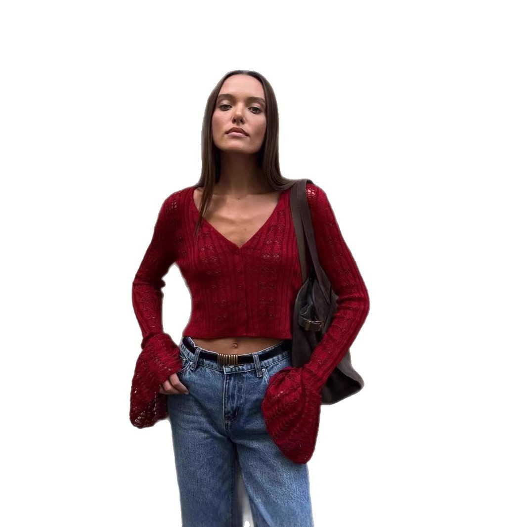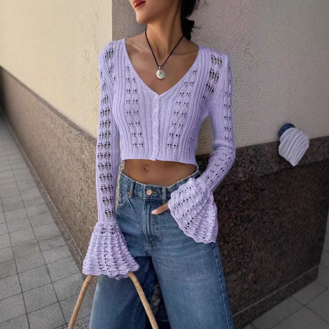 Women's Clothes Sexy Cutout Bell Sleeve Solid Color Short Knitted Top