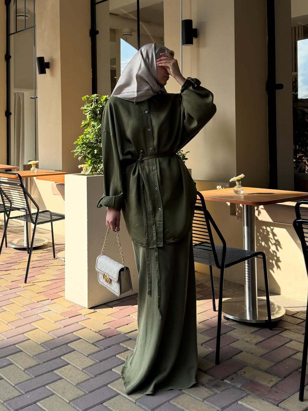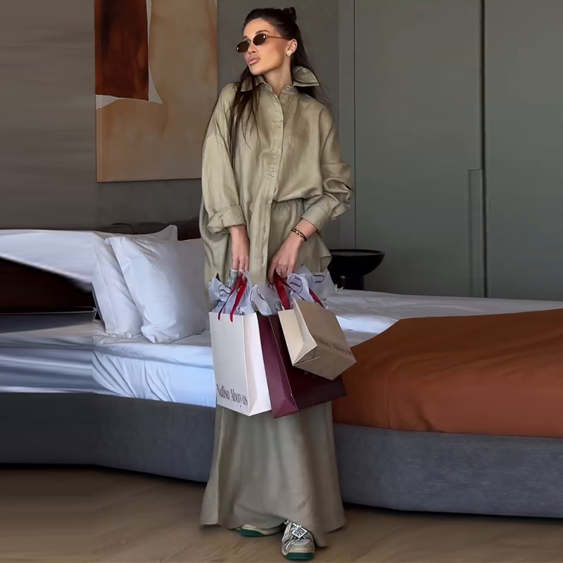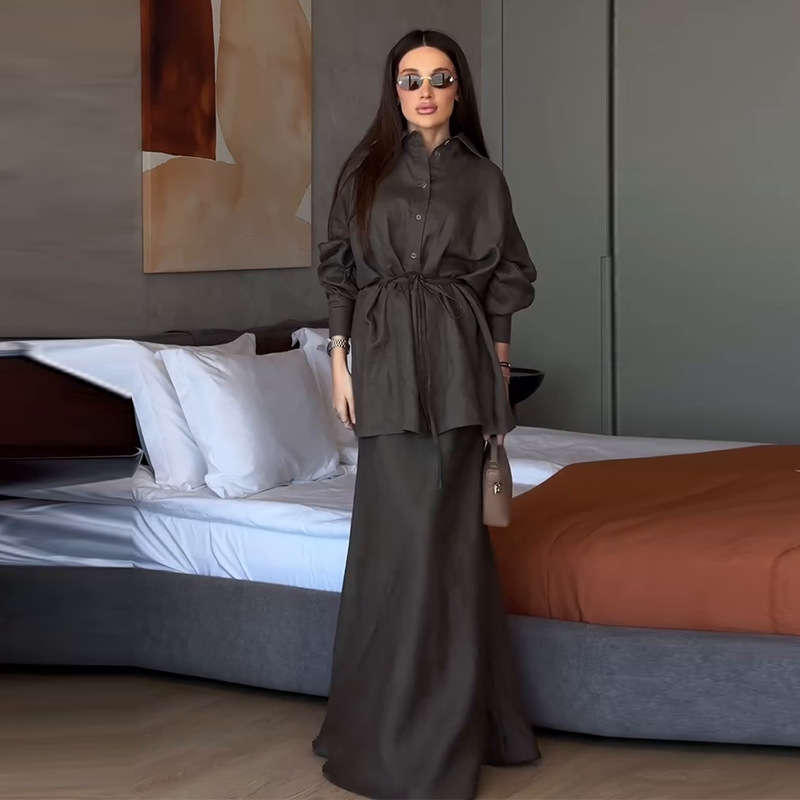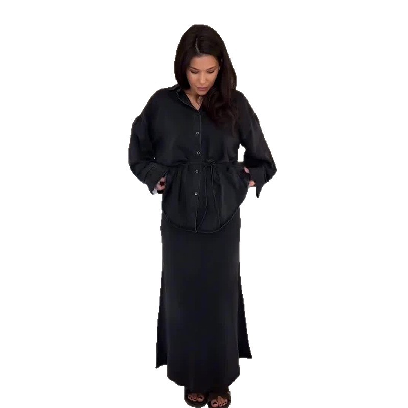 Women's Clothing Belt Waist-controlled Long Sleeves Denim Long Skirts Two-piece Set