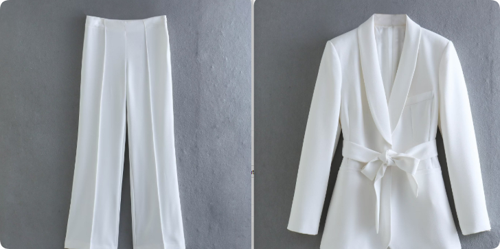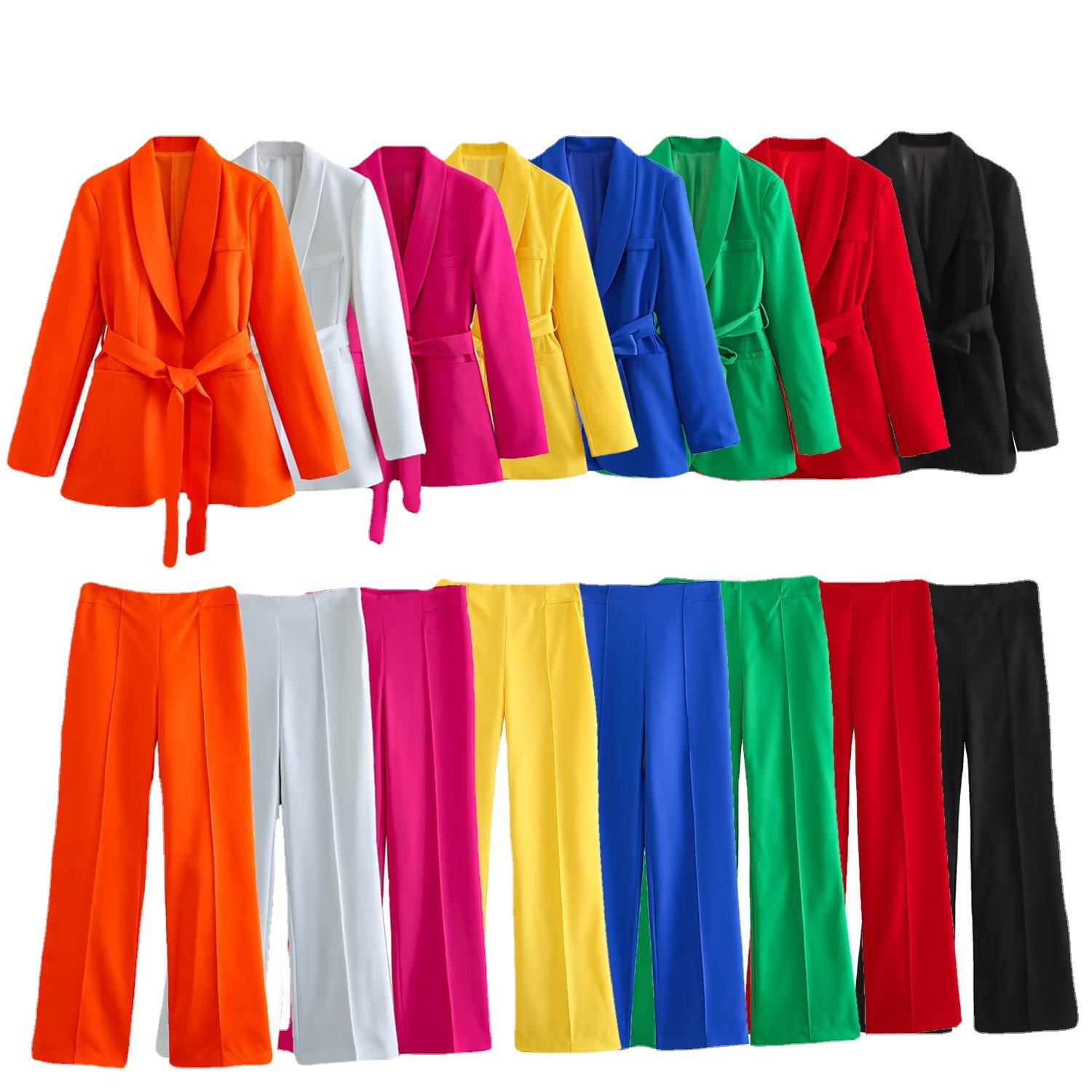 Color: white suit, white pants, Rose red suit, Rose red pants, orange suit, orange pants, yellow suit, yellow pants, blue suit, blue pants, green suit, green pants, red suit, red pants, black suit, black pants