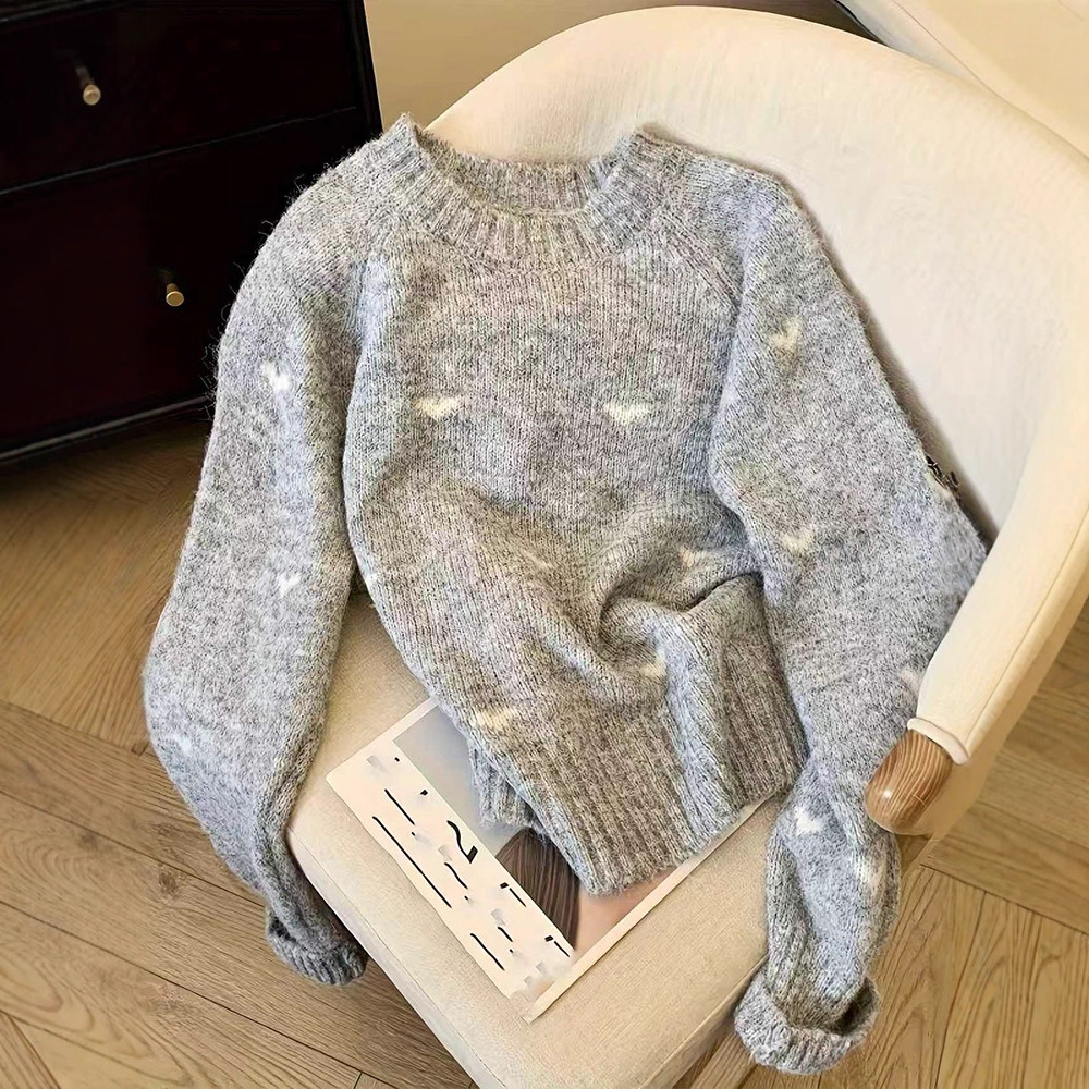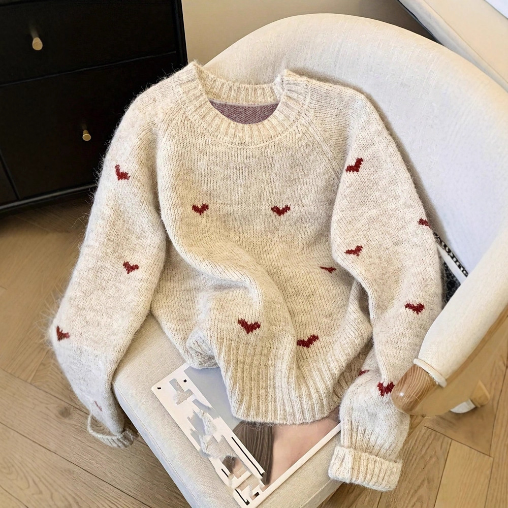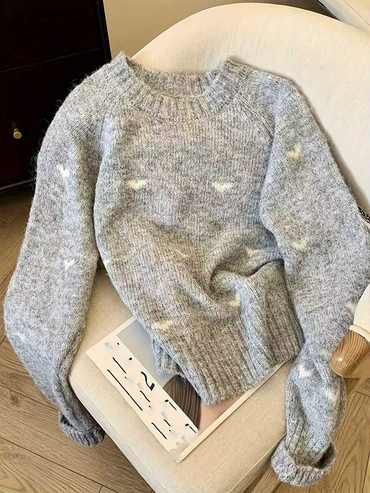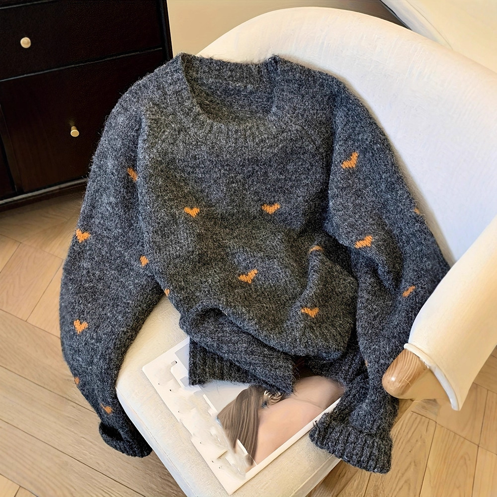 Women's Comfortable Sweater With Heart Pattern Long-Sleeved Crew-Neck Pullover