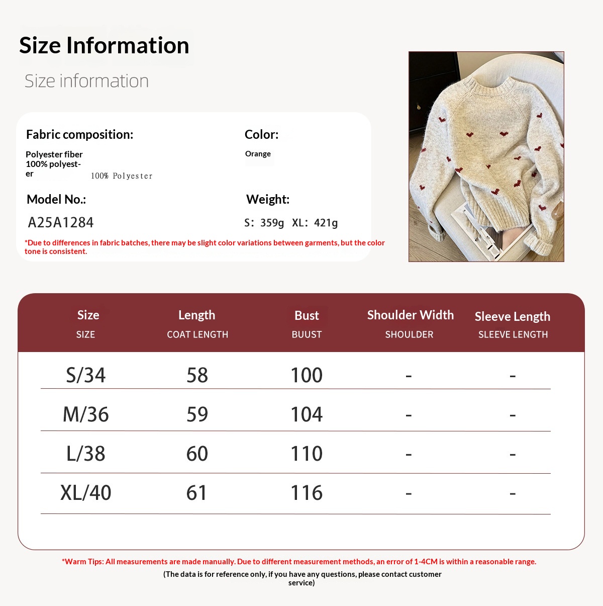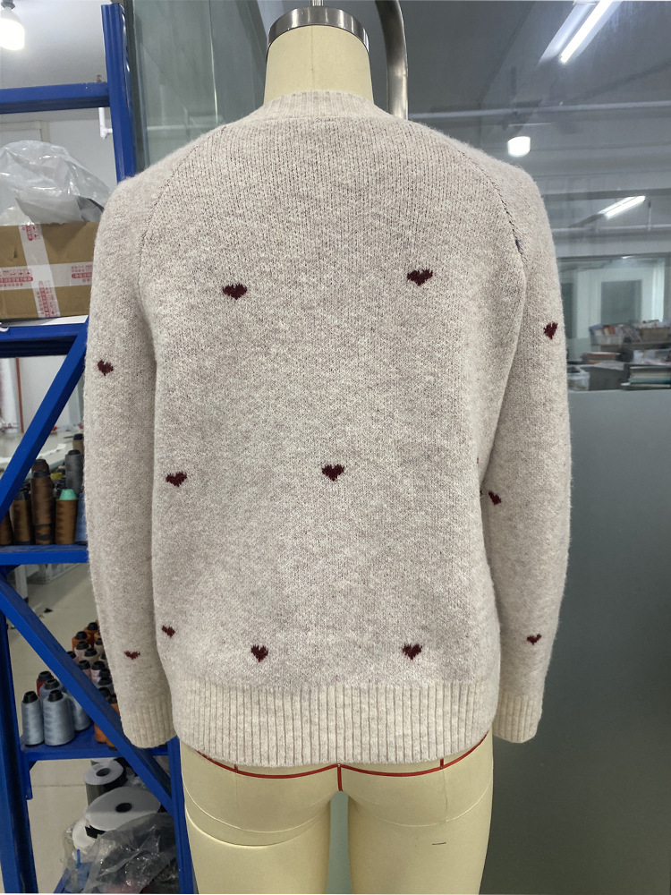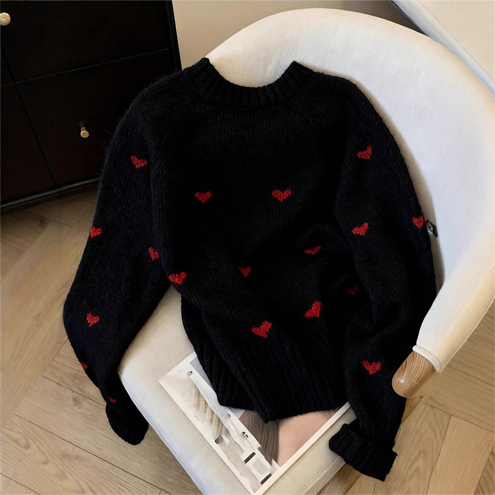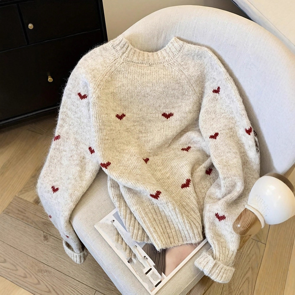 Women's Comfortable Sweater With Heart Pattern Long-Sleeved Crew-Neck Pullover