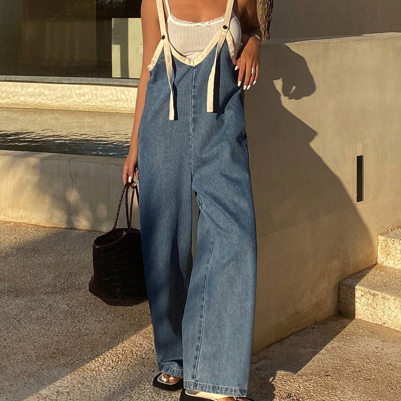 Women's Contrasting Casual Loose Denim Overalls