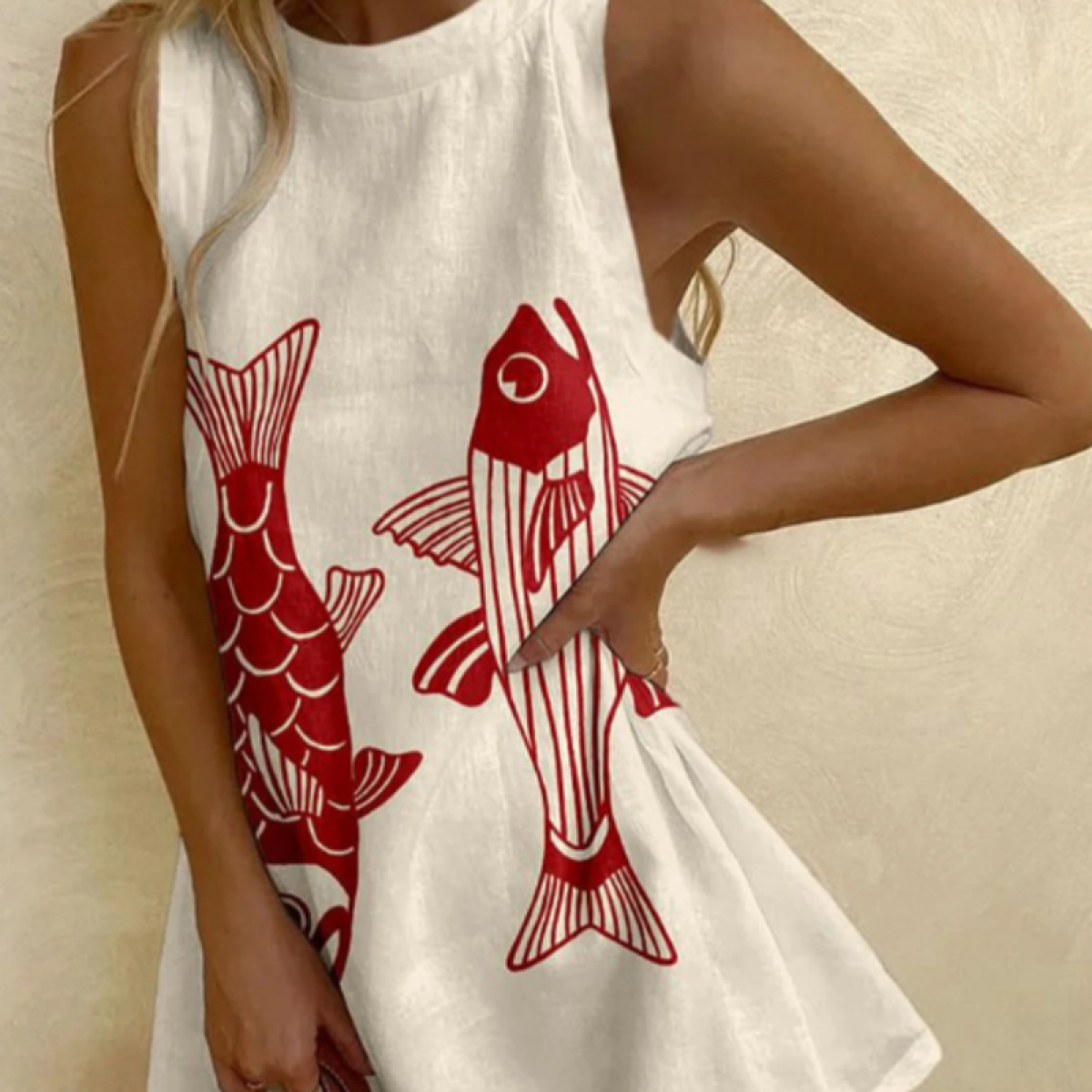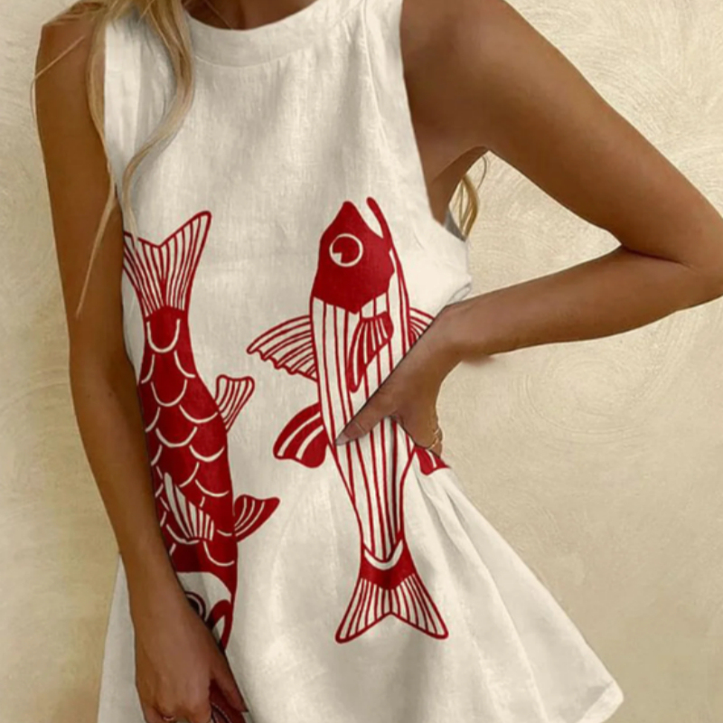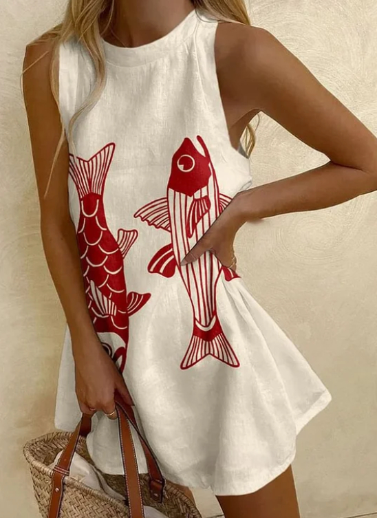 Women's Cotton & Linen Fish Print Wave Edge Mini Dress