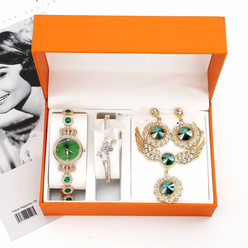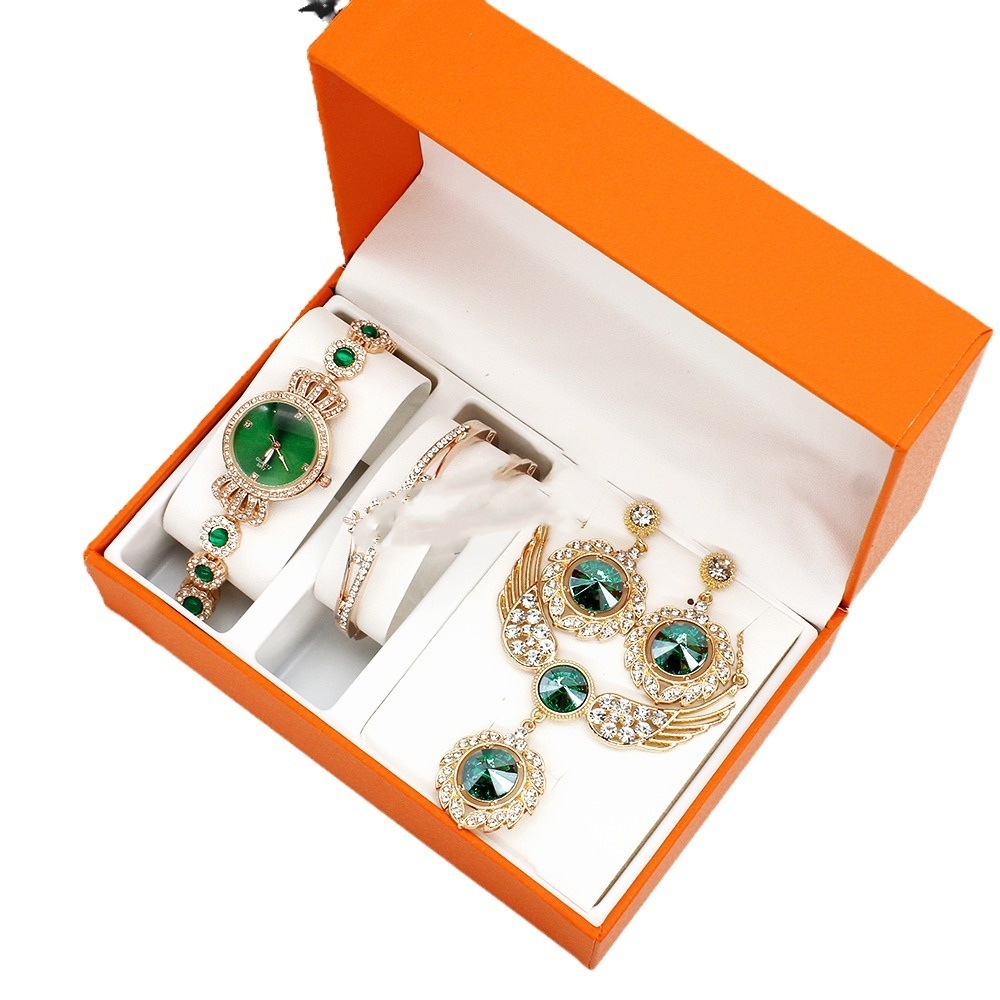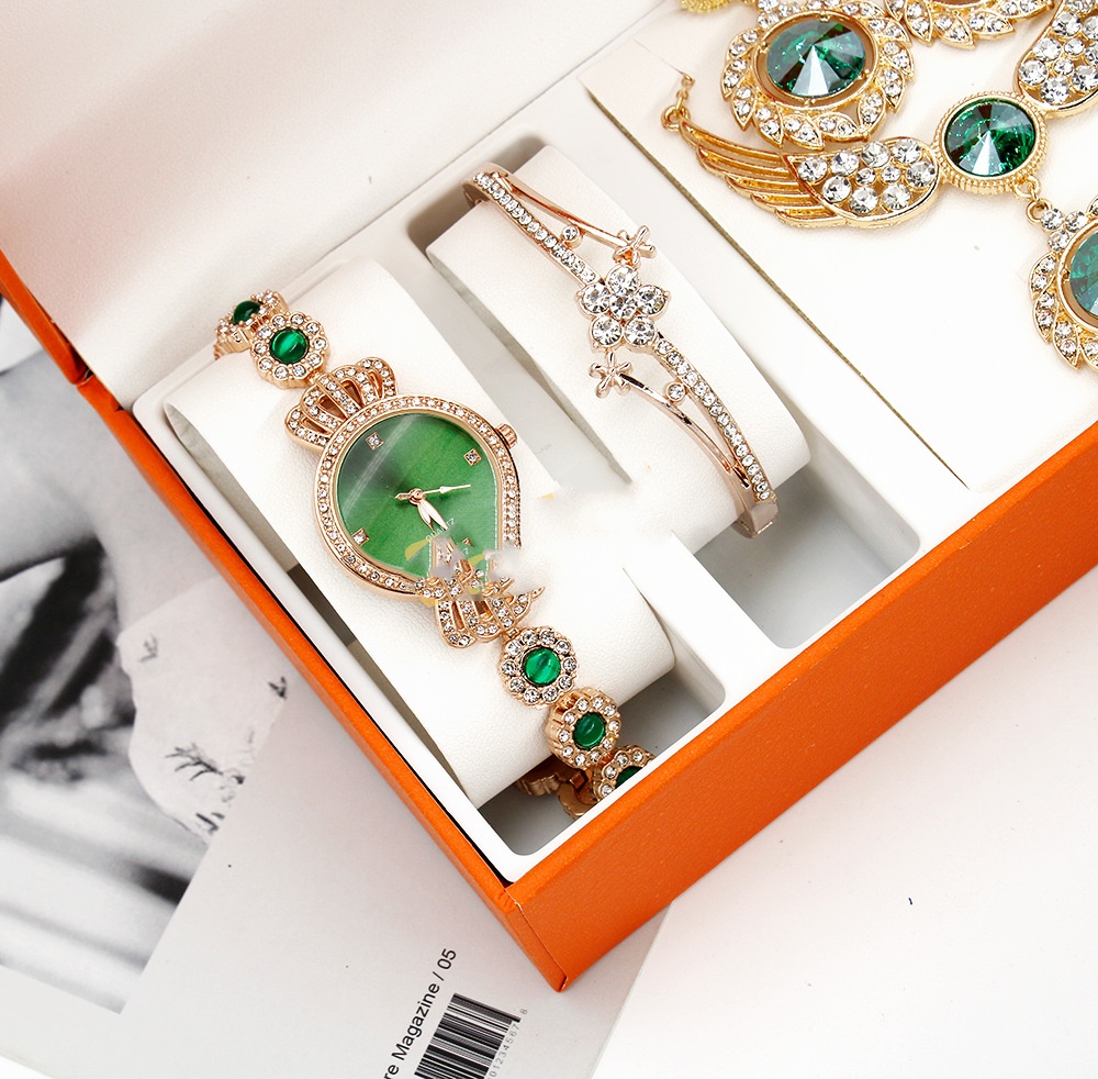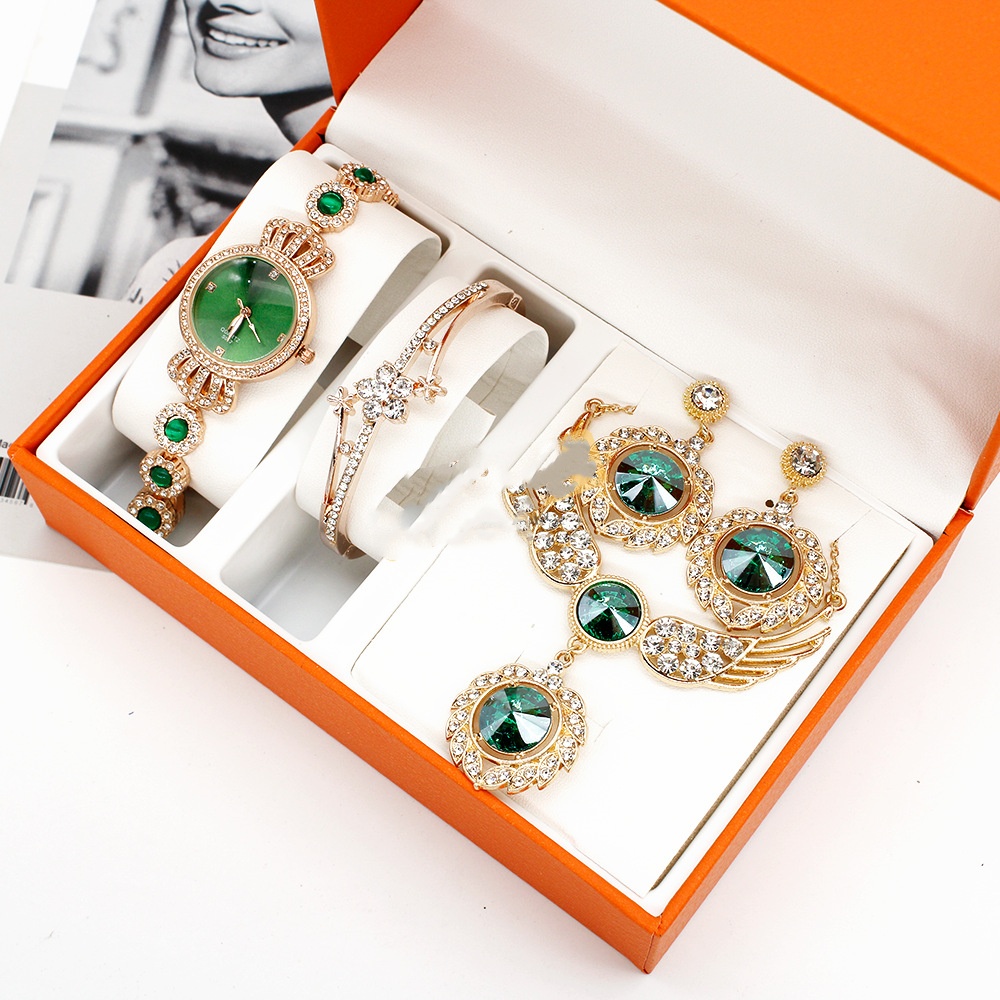 Color: green surface inlaid diamond watch bracelet wings necklace earrings box, rose gold watch/rose gold watch