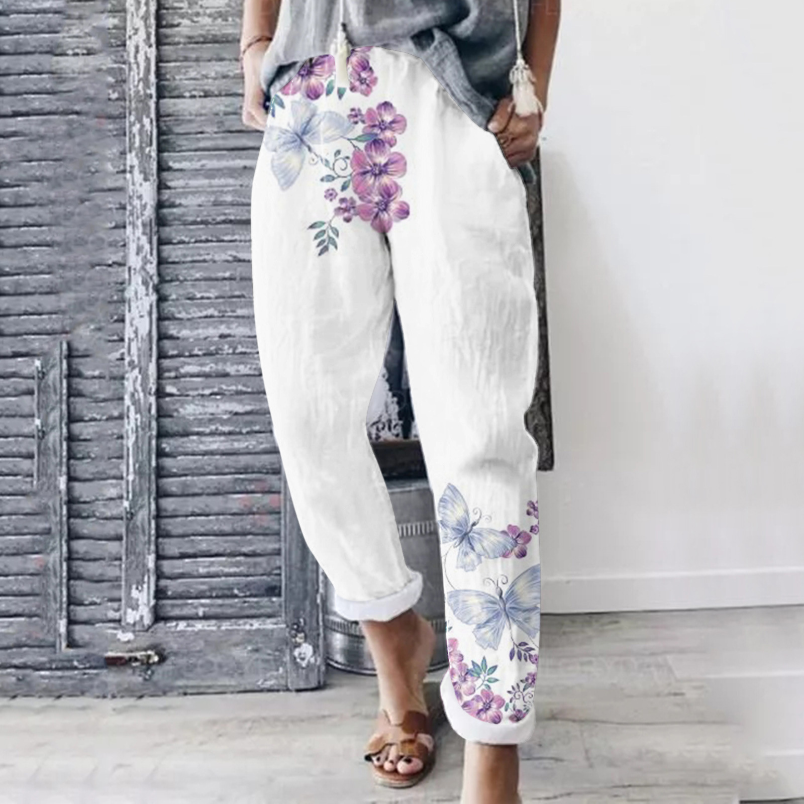 Color: white, butterfly print, feather print, yellow flower, light blue, blue flower