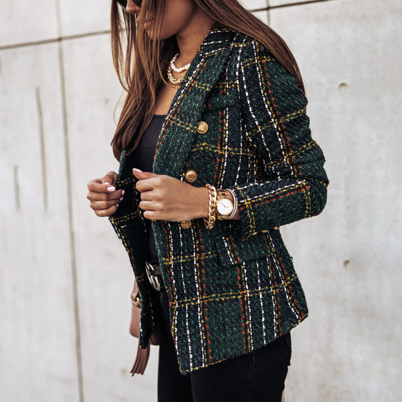 Women's Elegant Checkered Long Sleeve Blazer - Double-Breasted Printed Trench Coat for Fall/Winter, Office & Casual Jacket