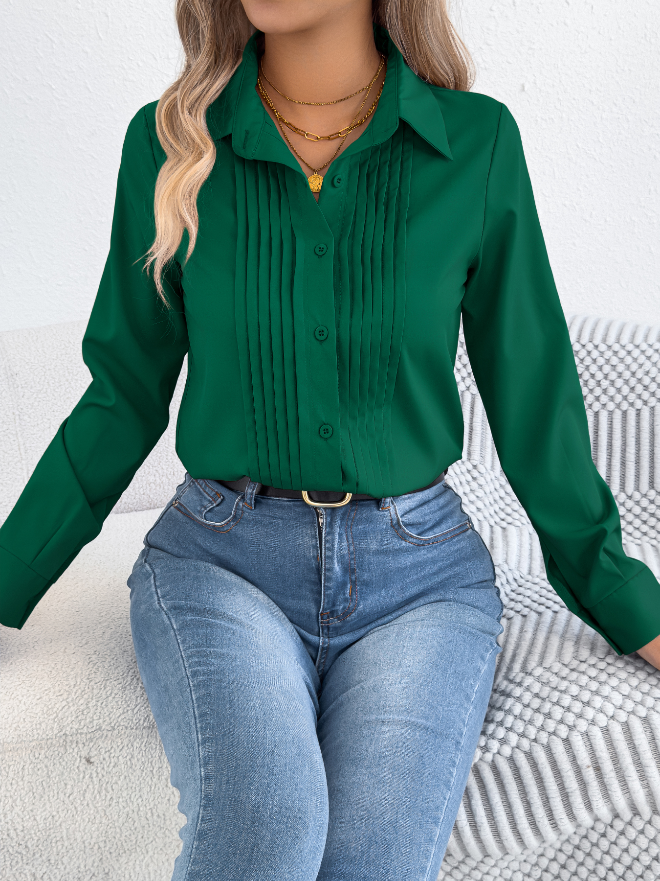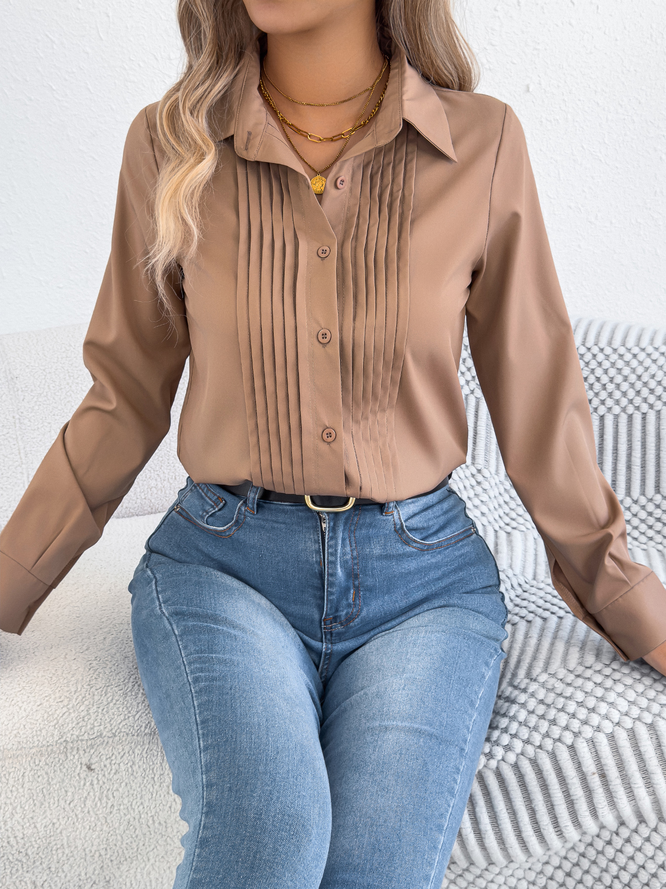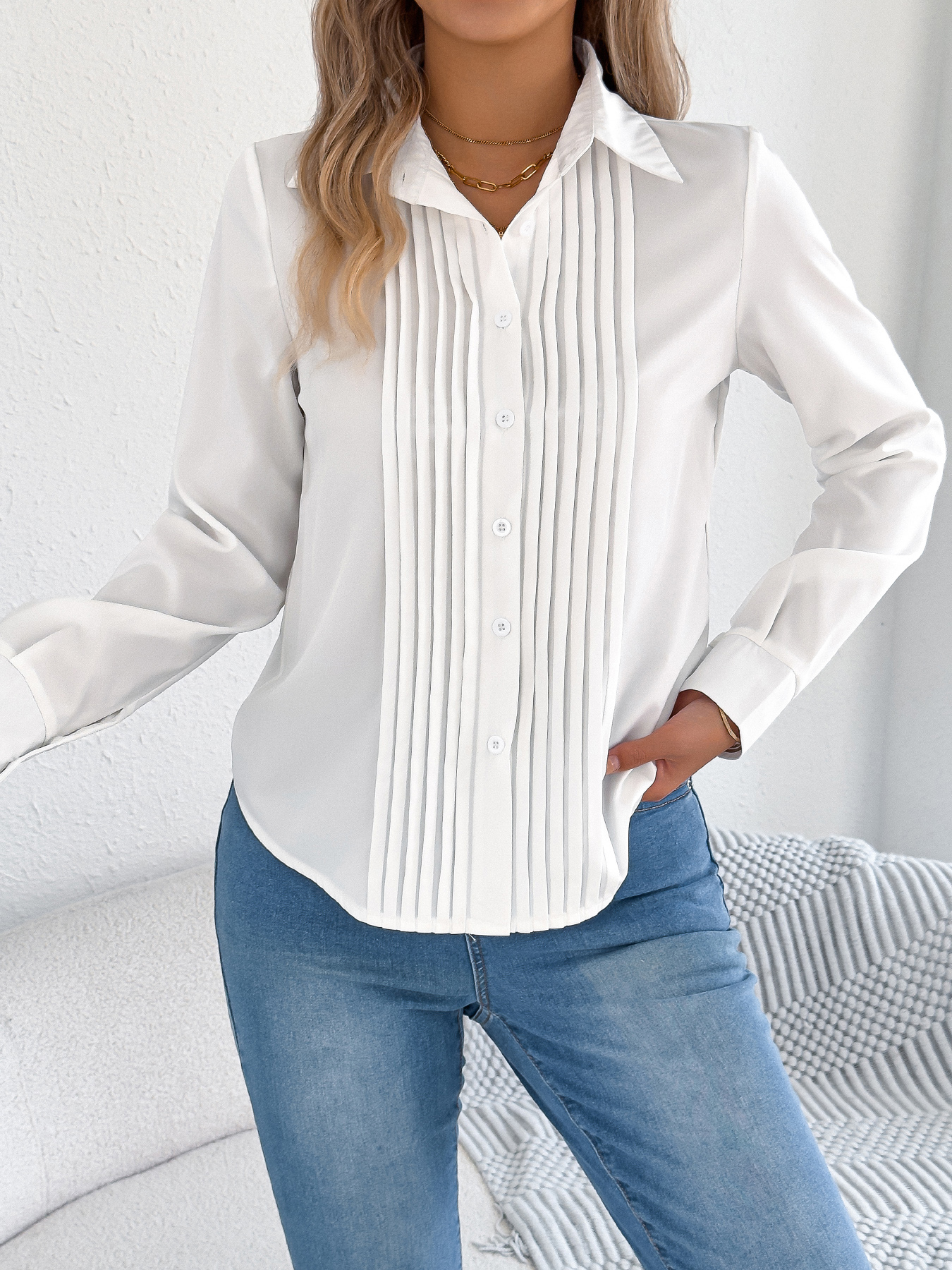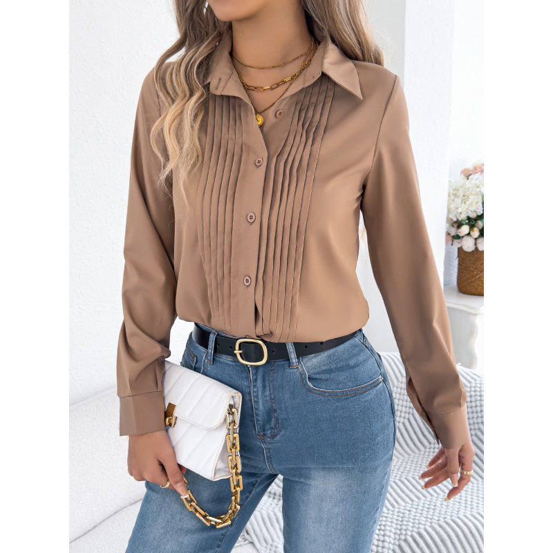 Women's Elegant Crinkled Solid Color Button Long Sleeve Office Shirt