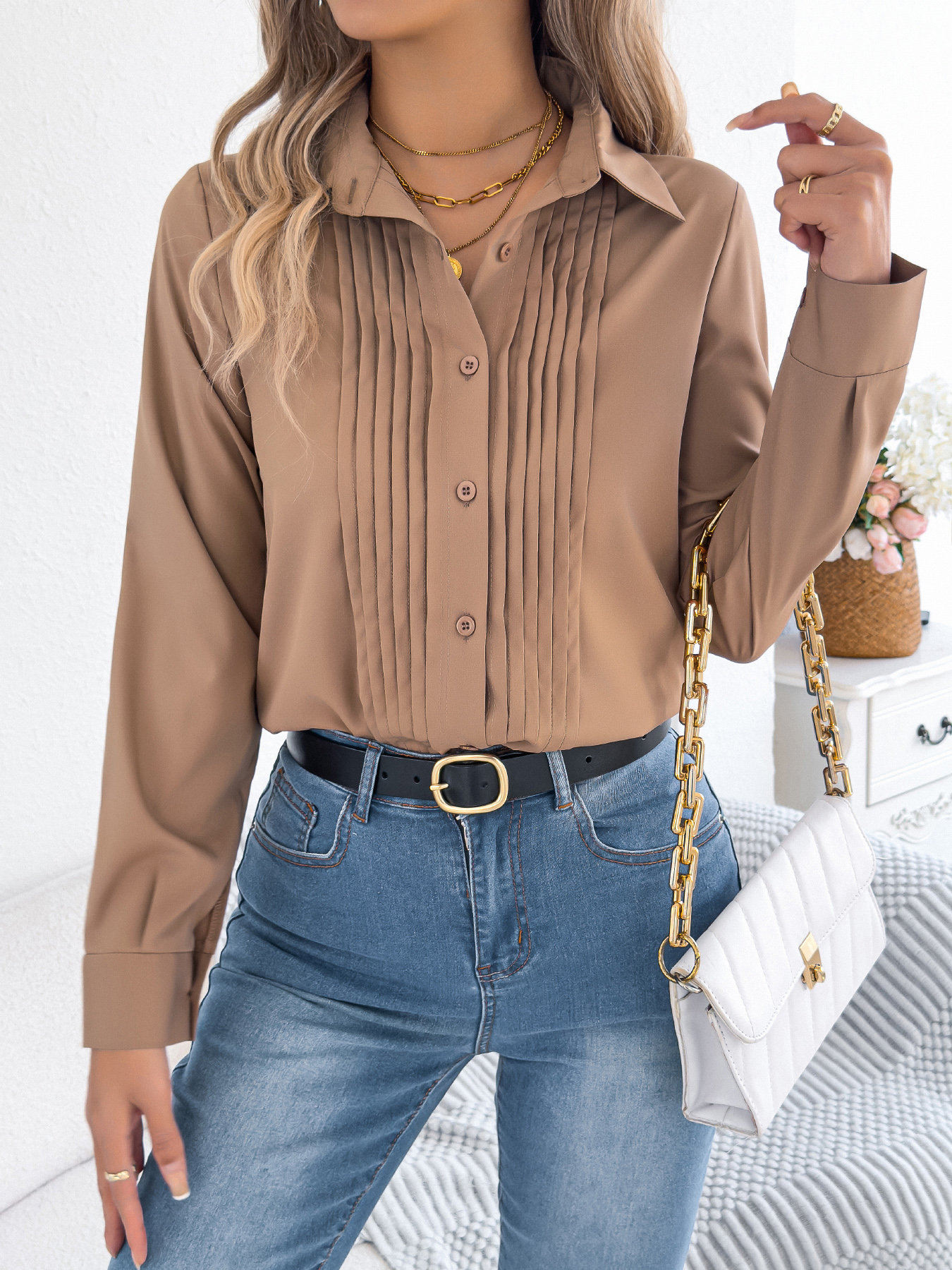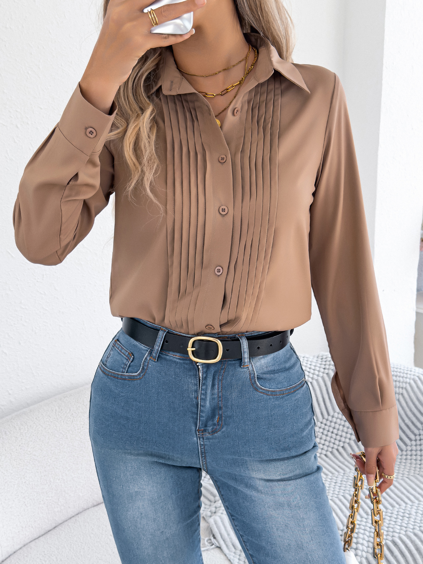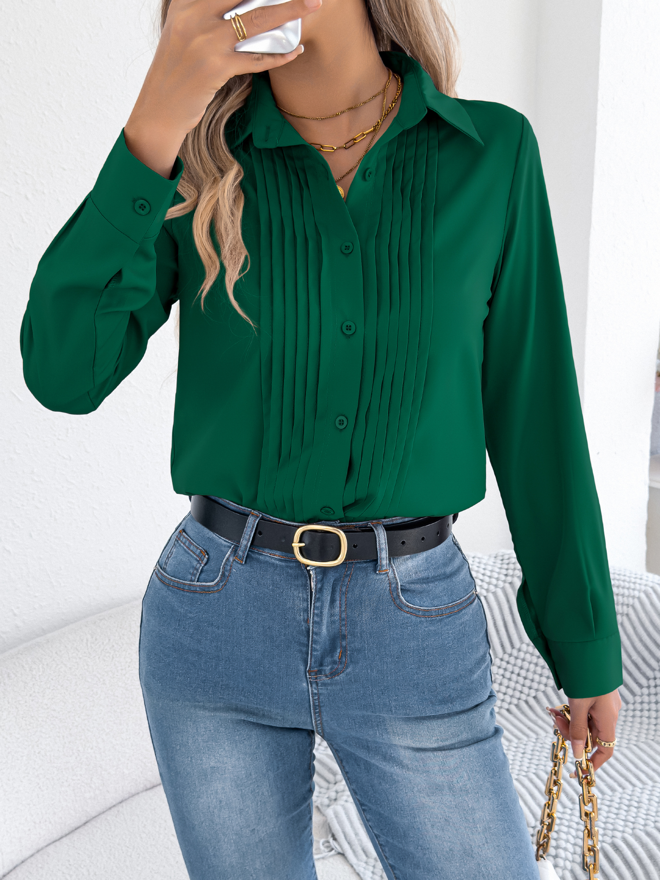 Women's Elegant Crinkled Solid Color Button Long Sleeve Office Shirt