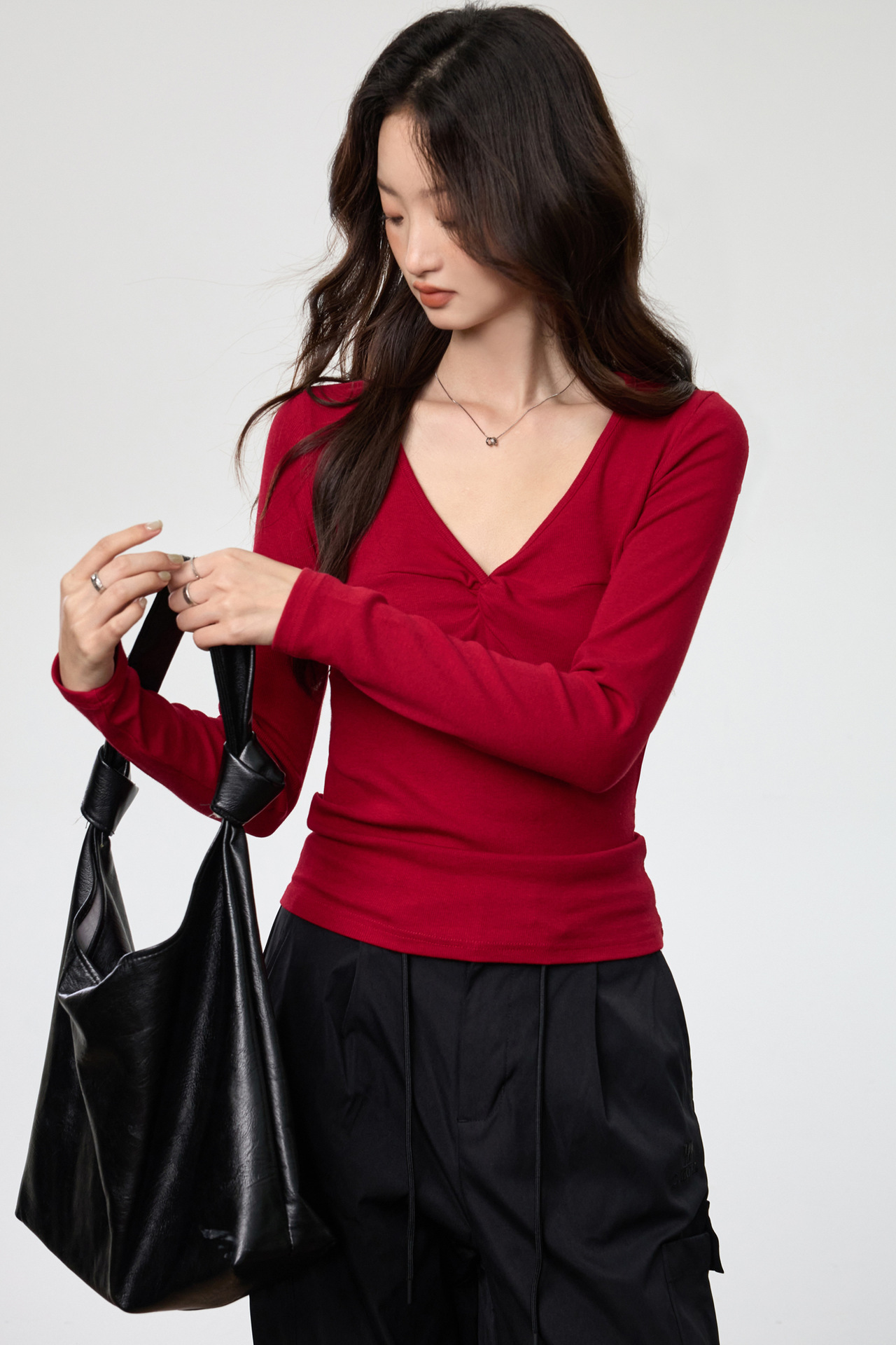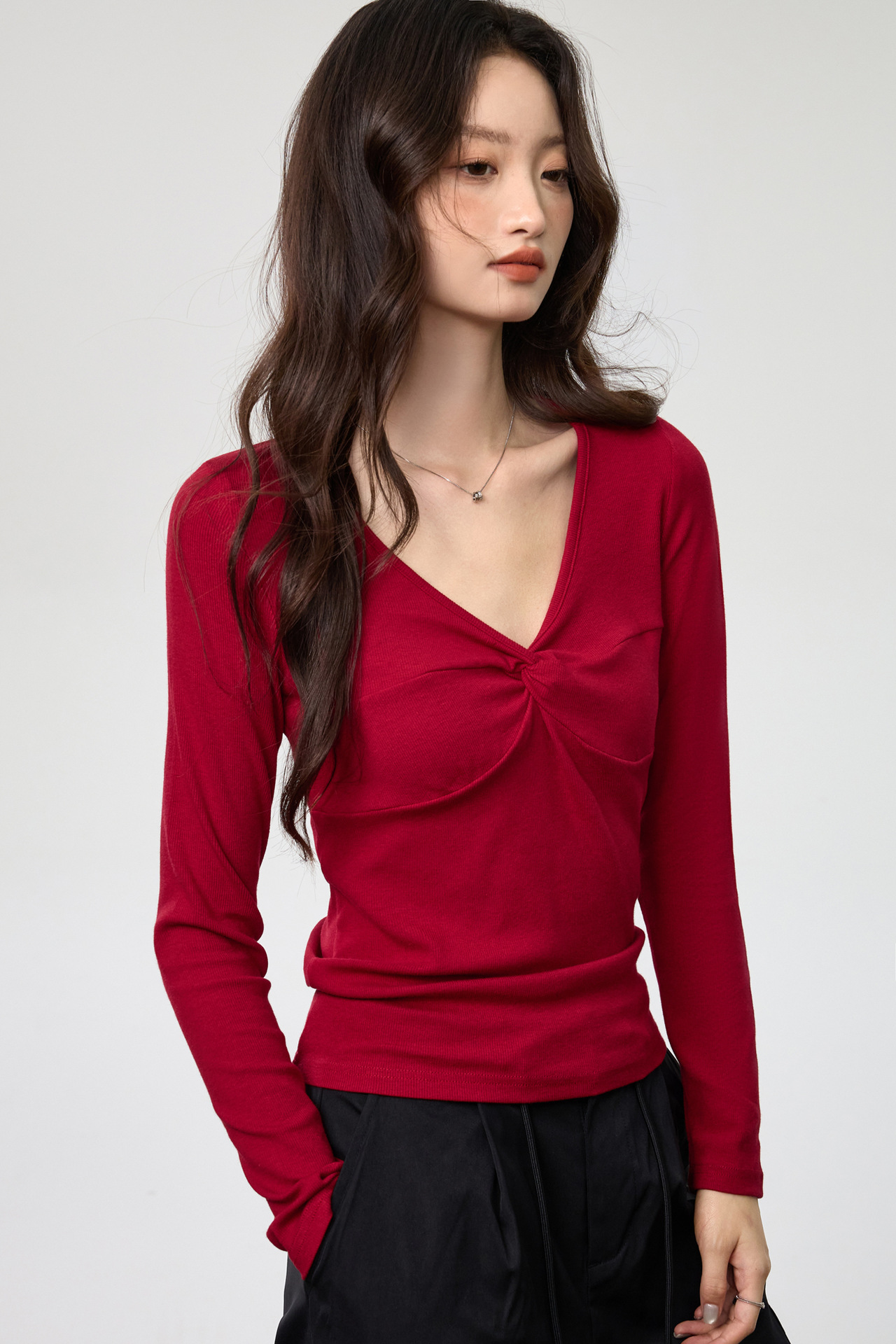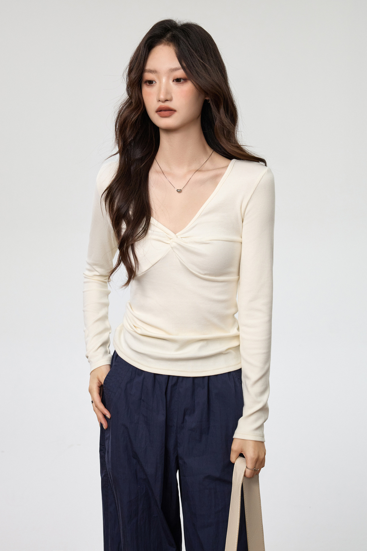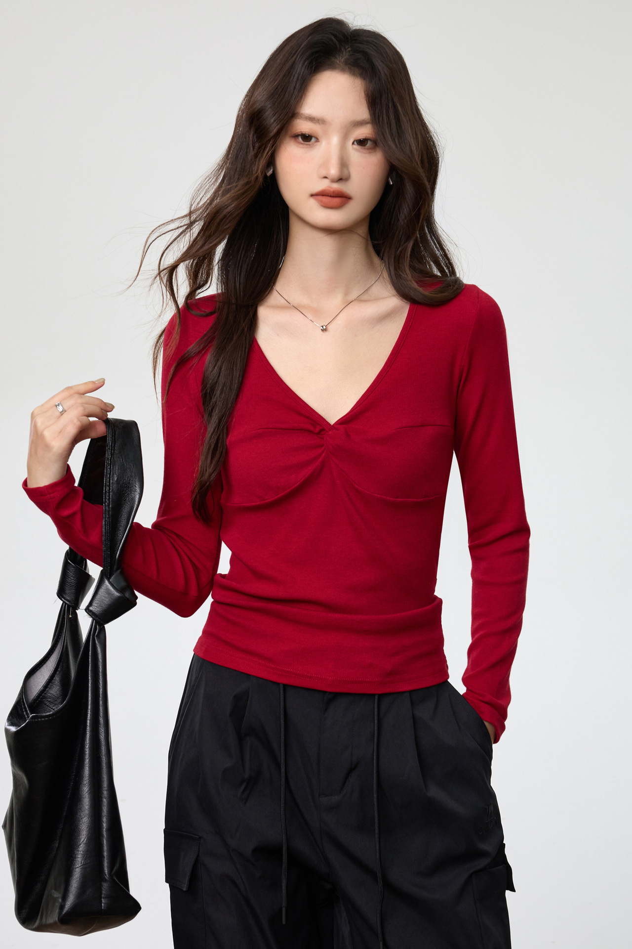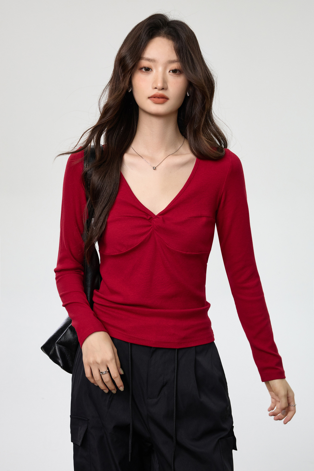 Fashion Elements: V-neck, Solid Color, Bow, Slim