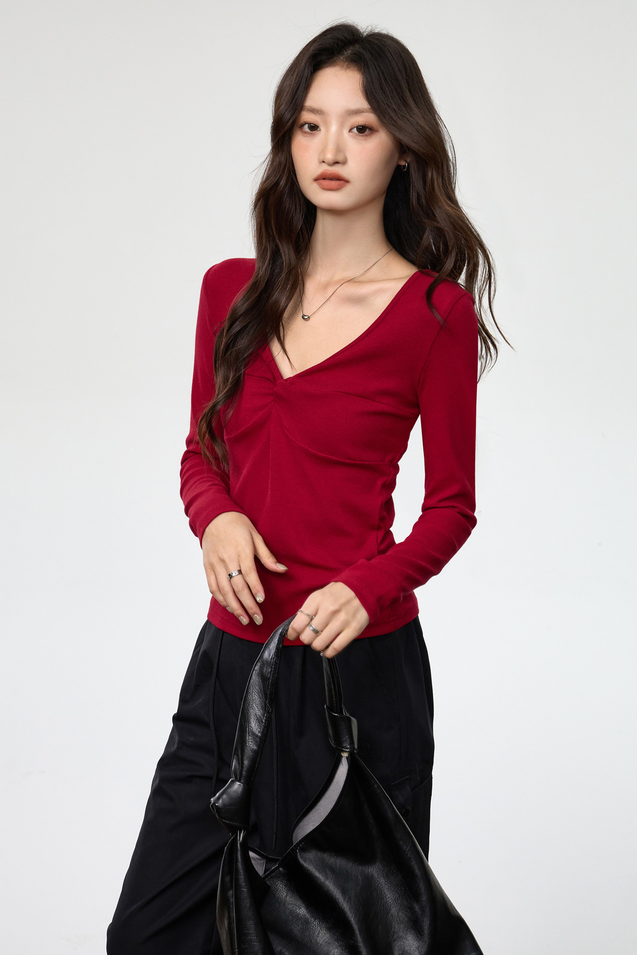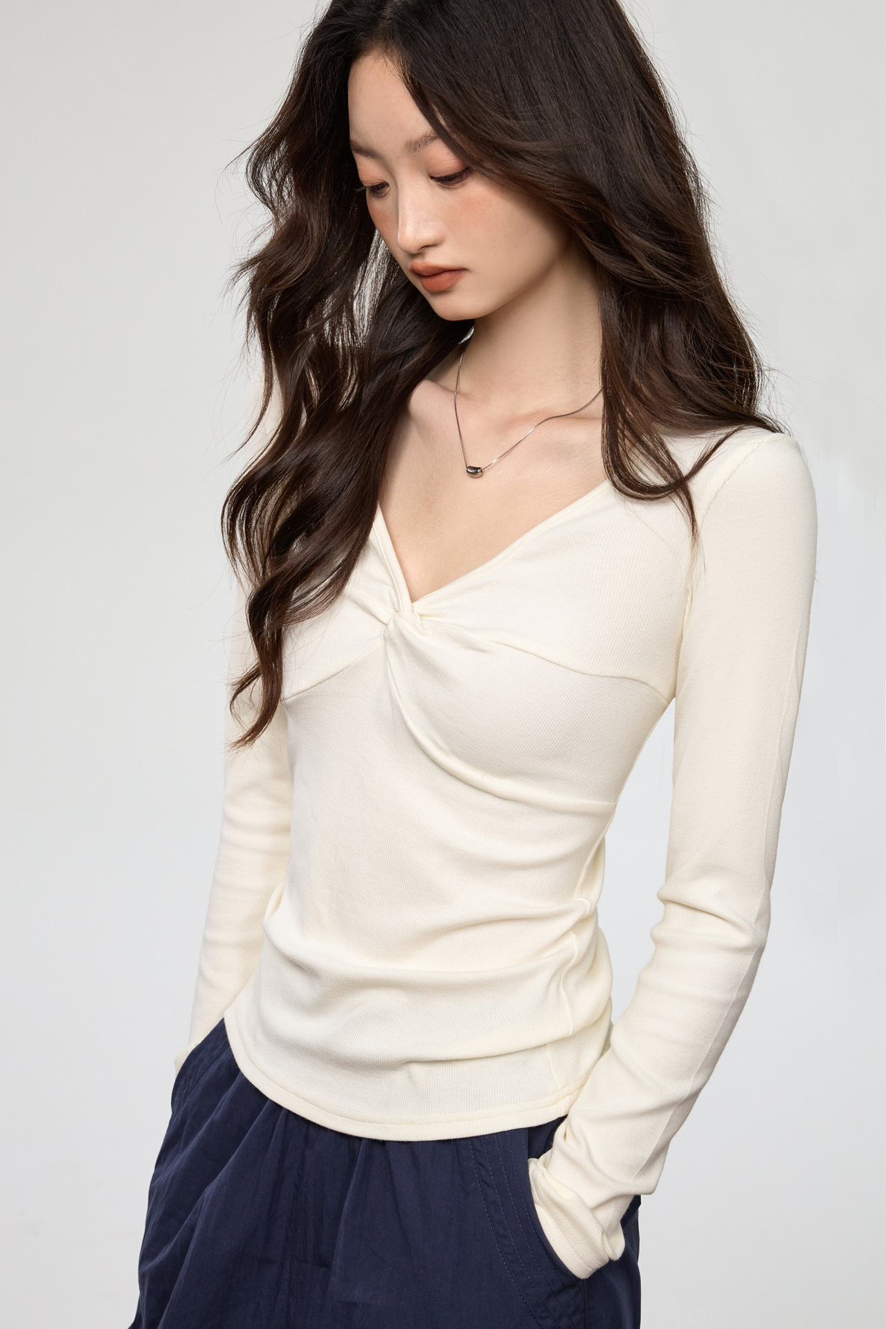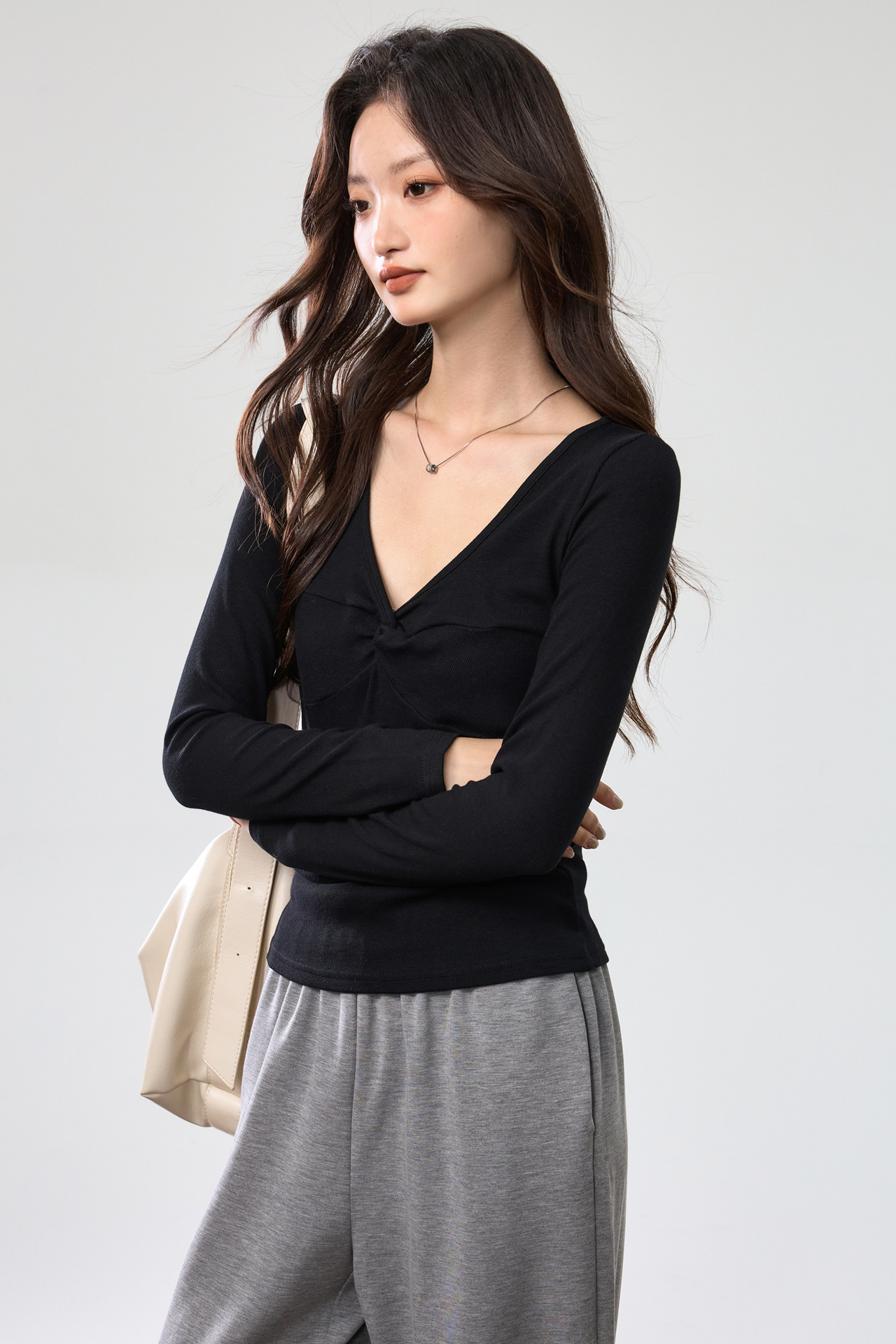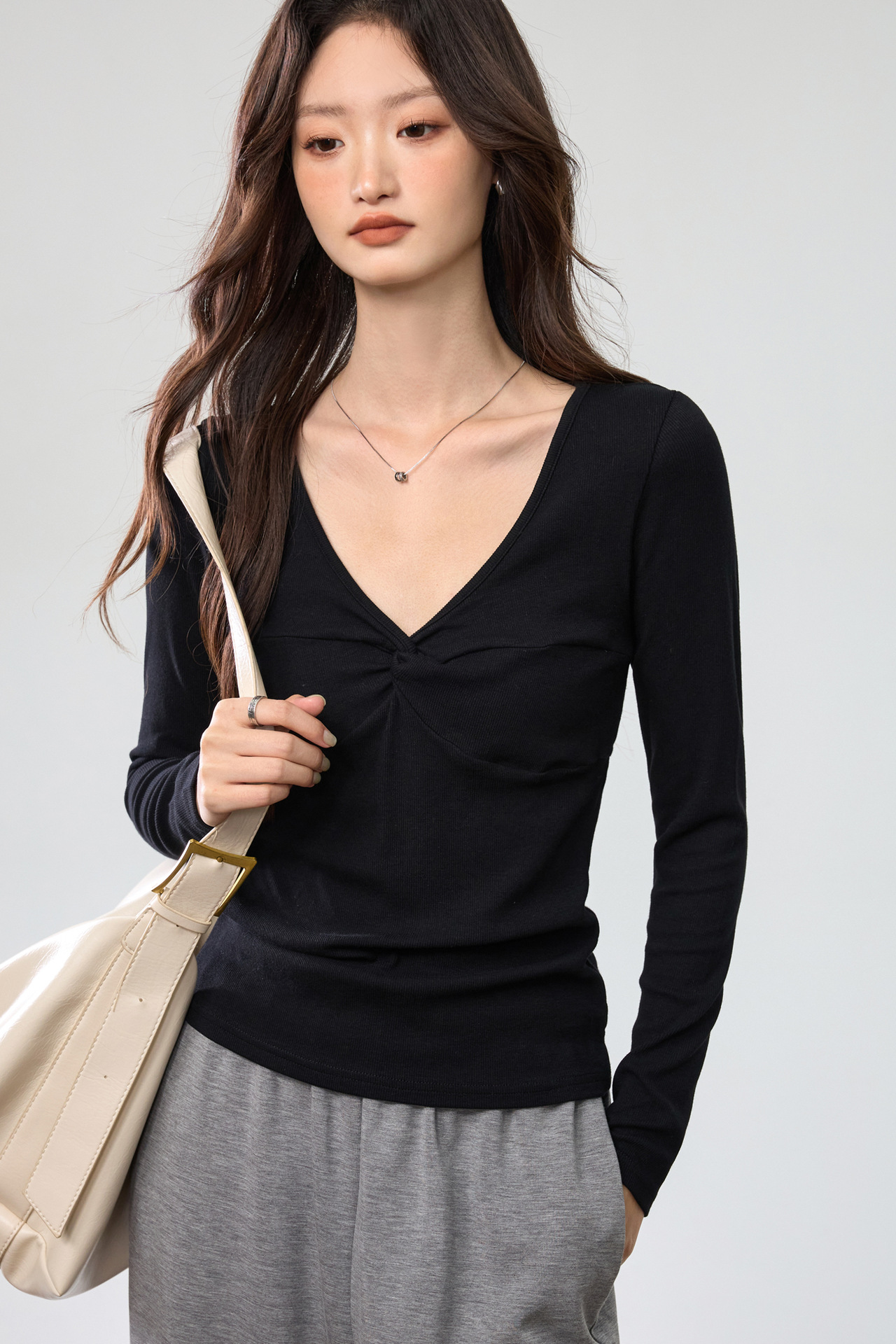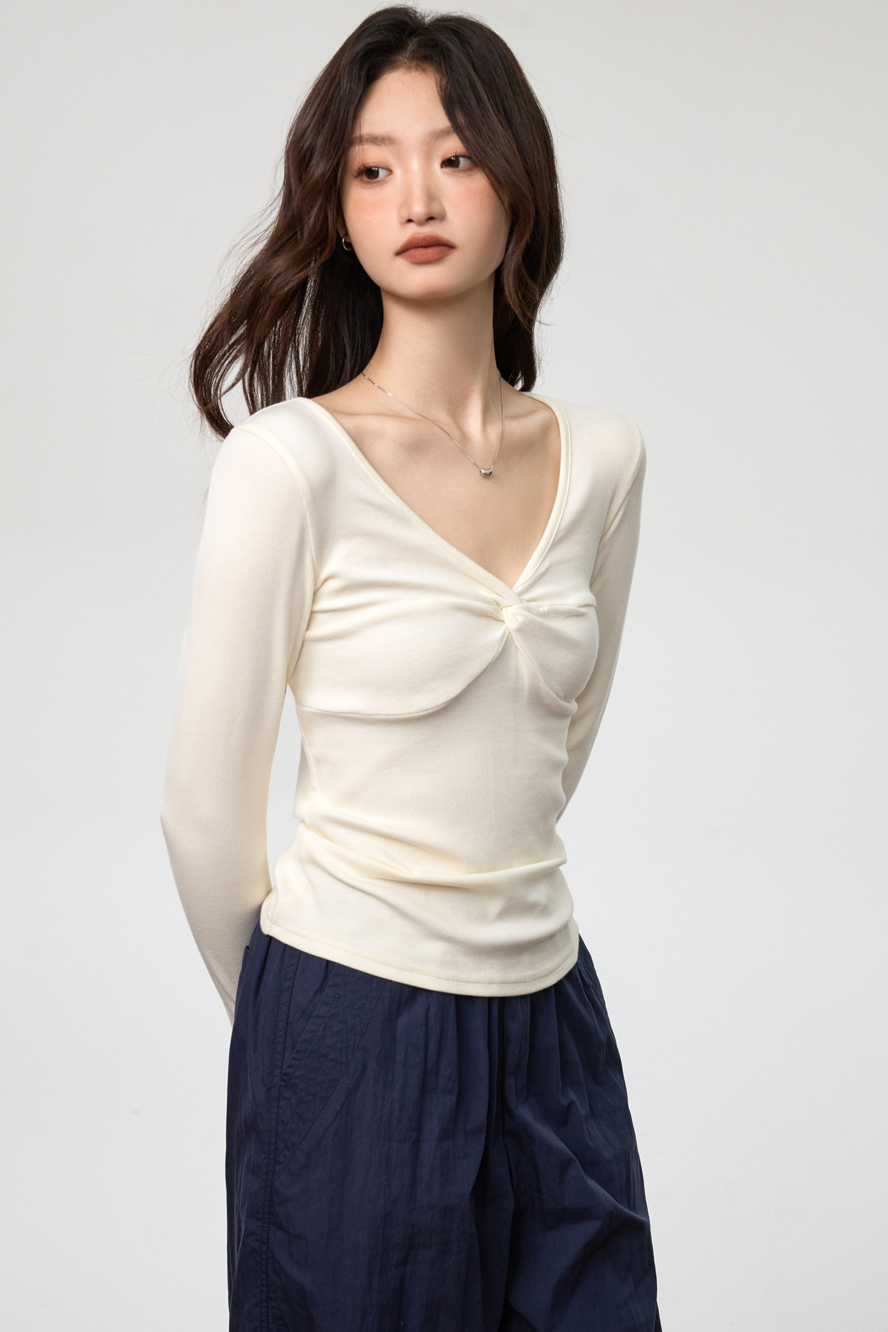 Fashion Elements: V-neck, Solid Color, Bow, Slim