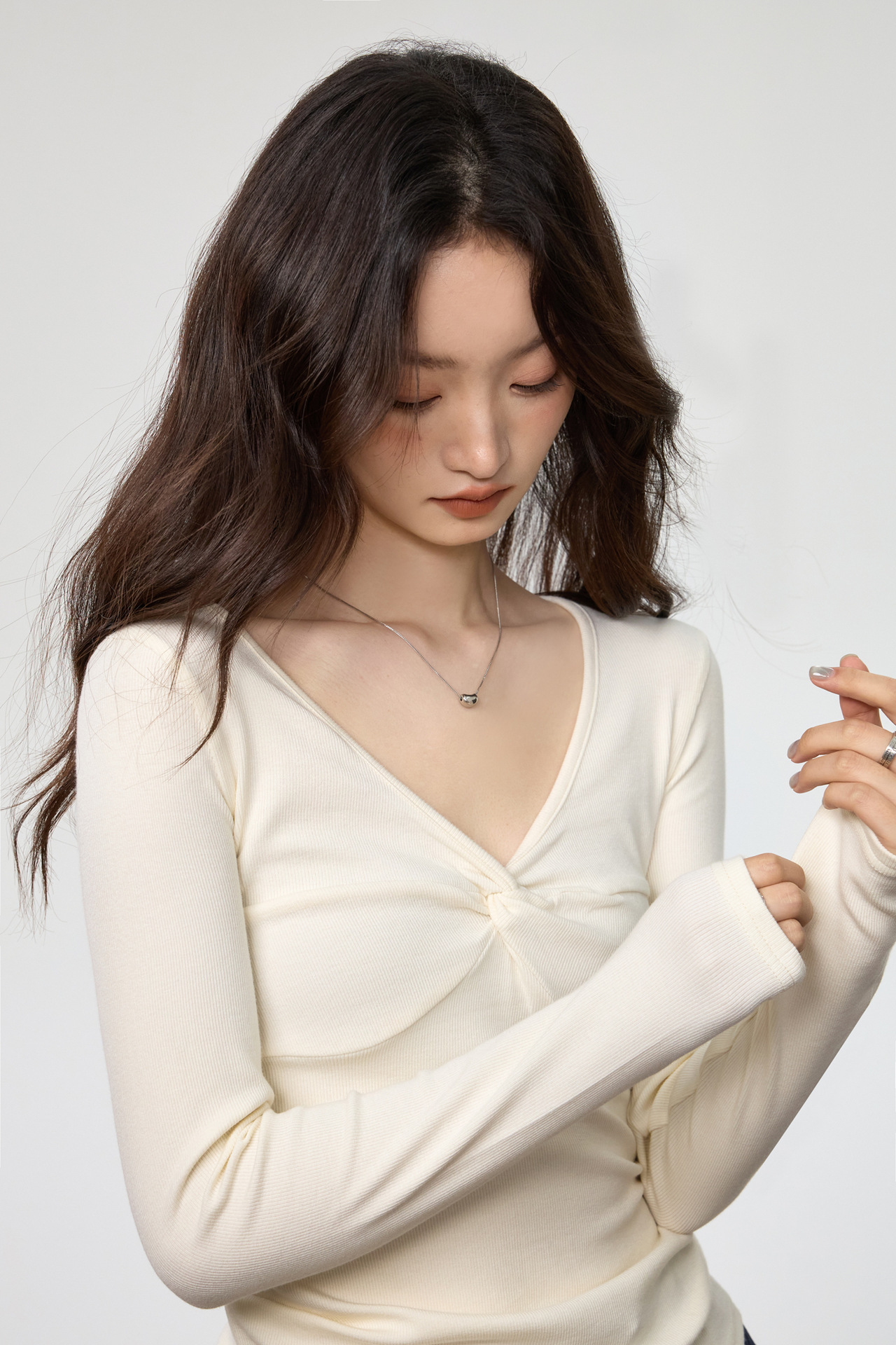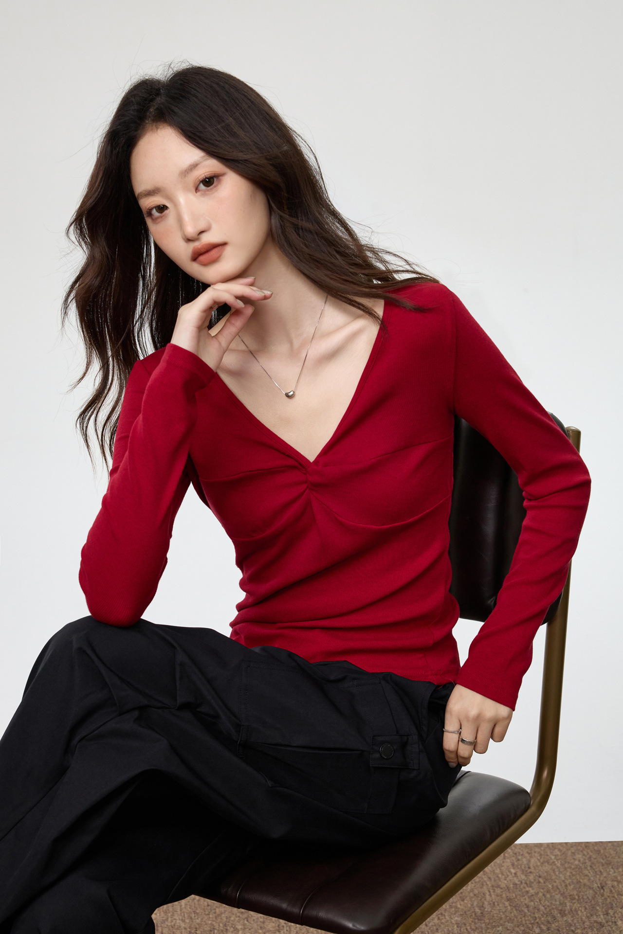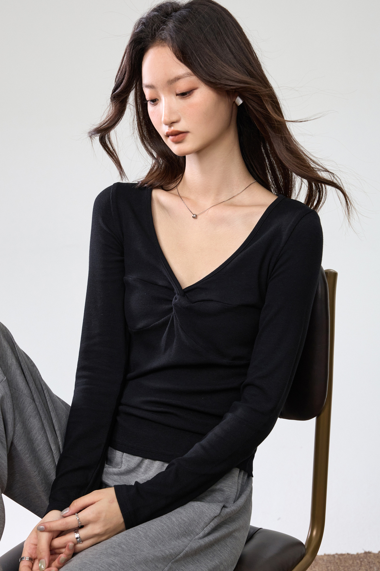 Women's Elegant Deep V-neck Knot Long Sleeve Top
