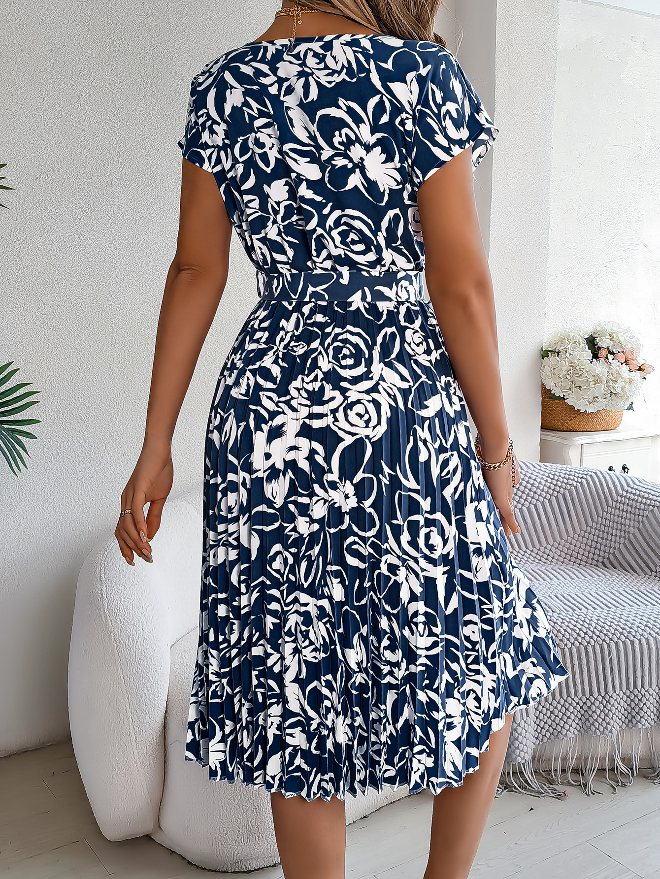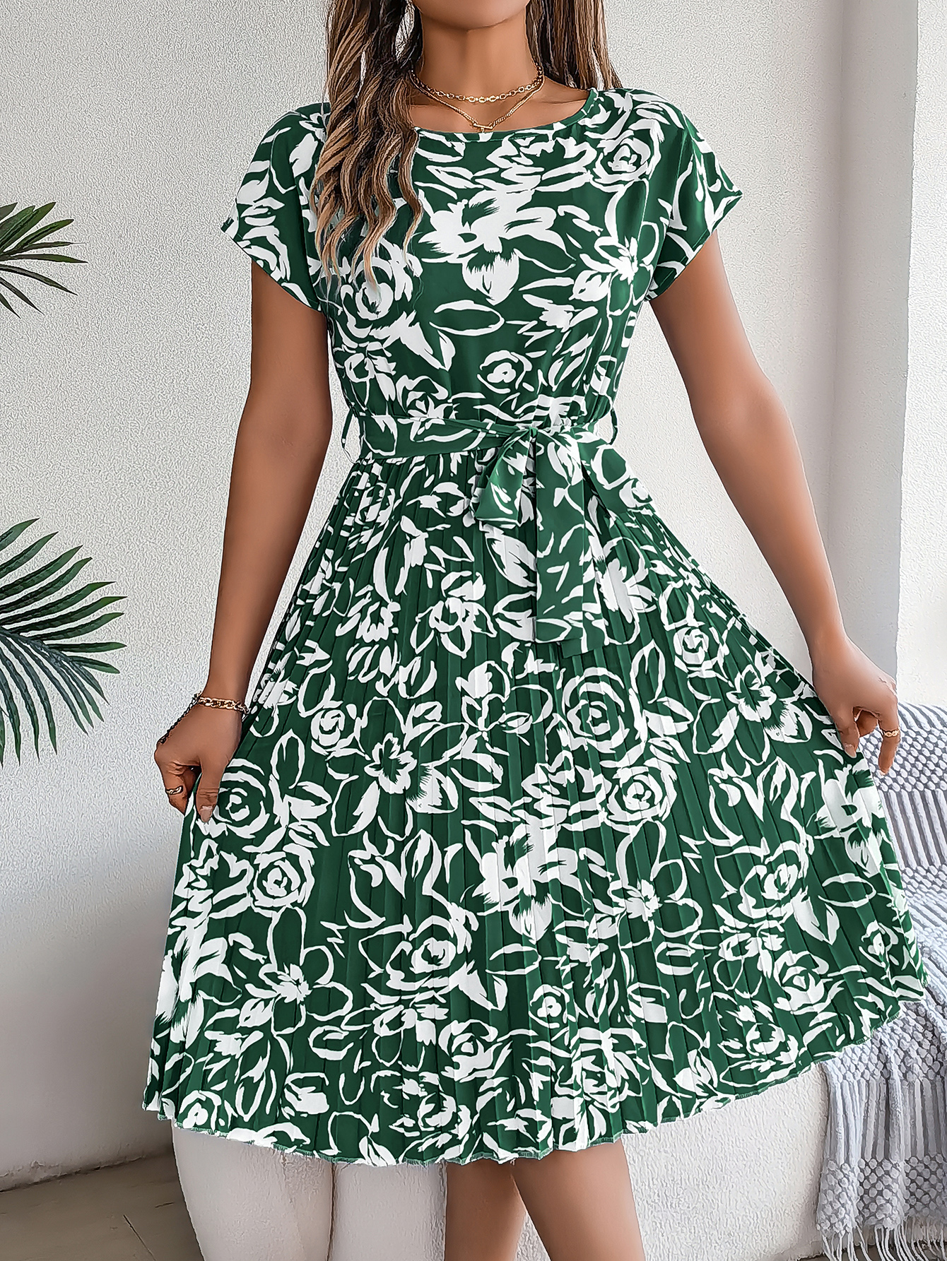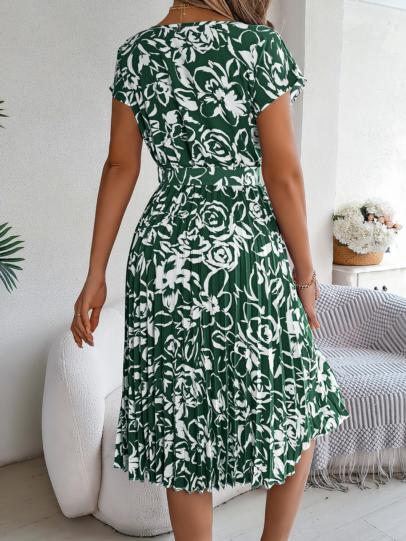 Women's Elegant Floral Print Short Sleeve Flowy Pleated Dress