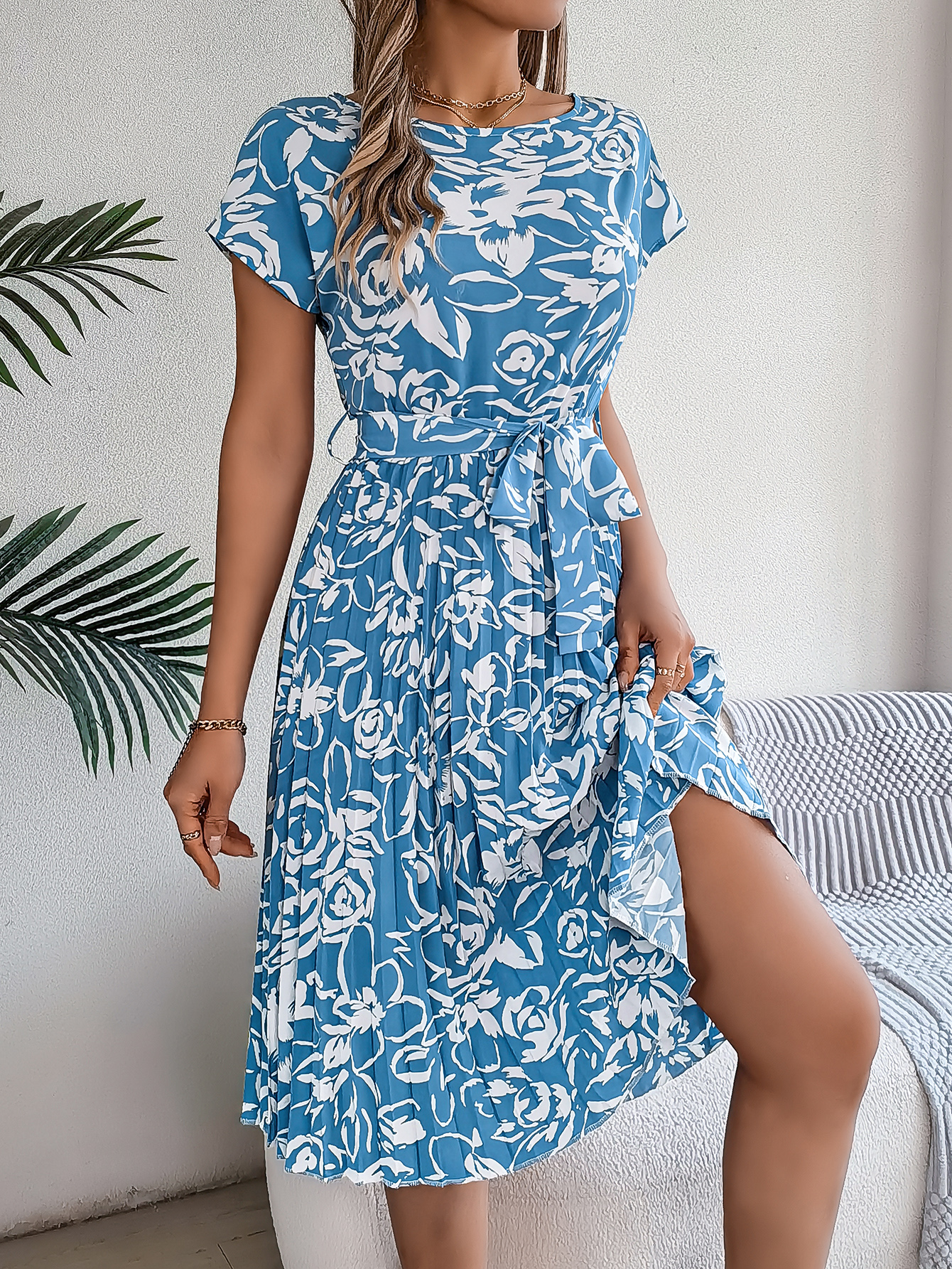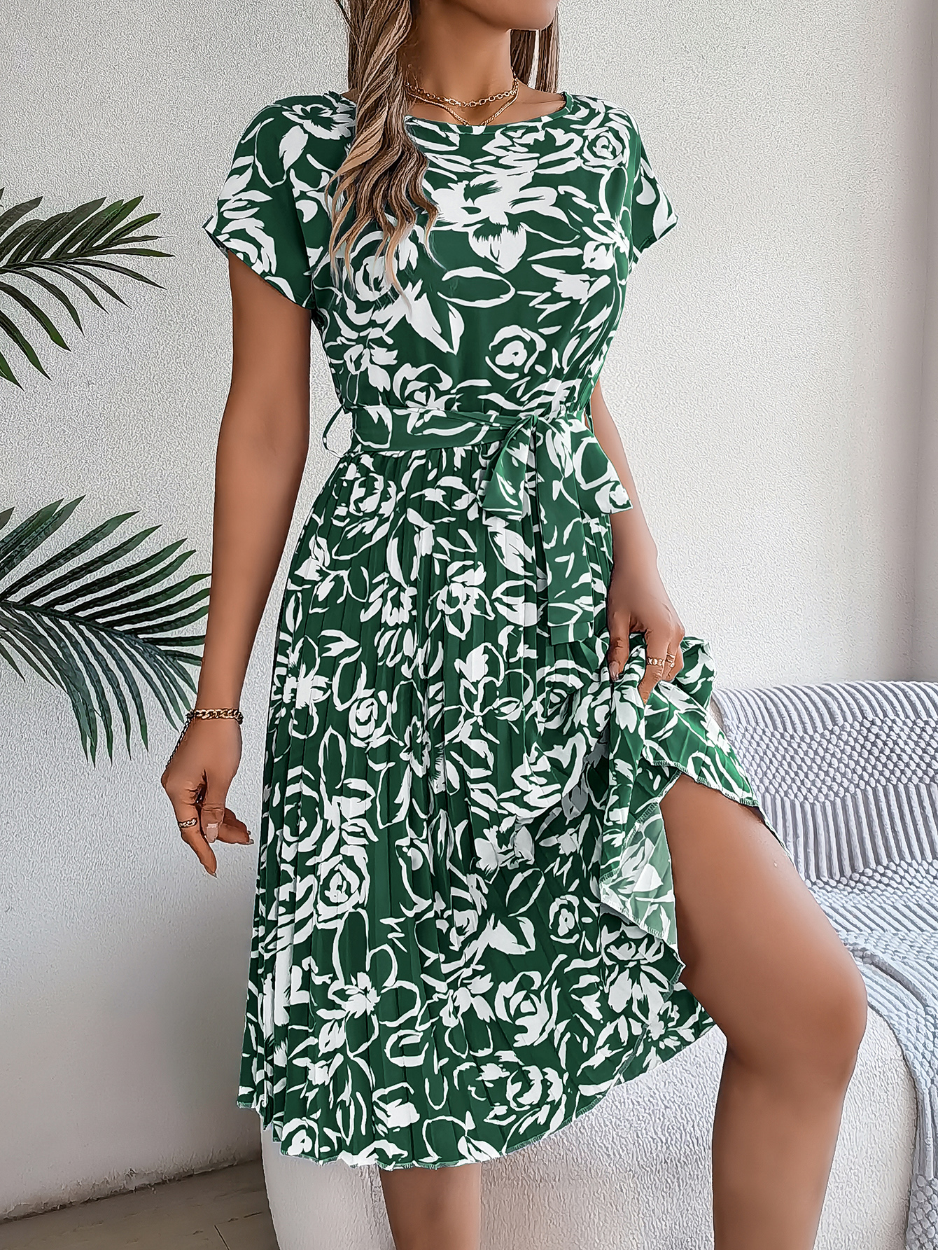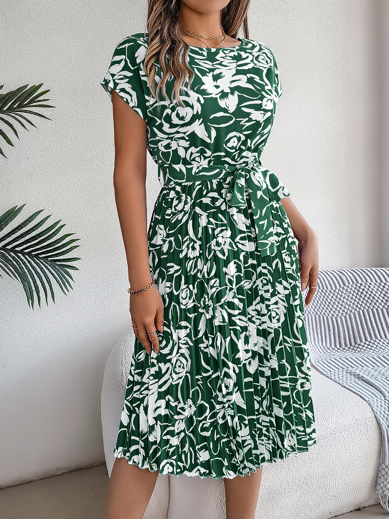 Women's Elegant Floral Print Short Sleeve Flowy Pleated Dress
