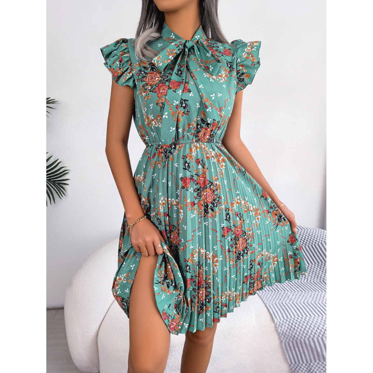 Women's Elegant Floral Print Tie Waist Flowy Pleated Skirt