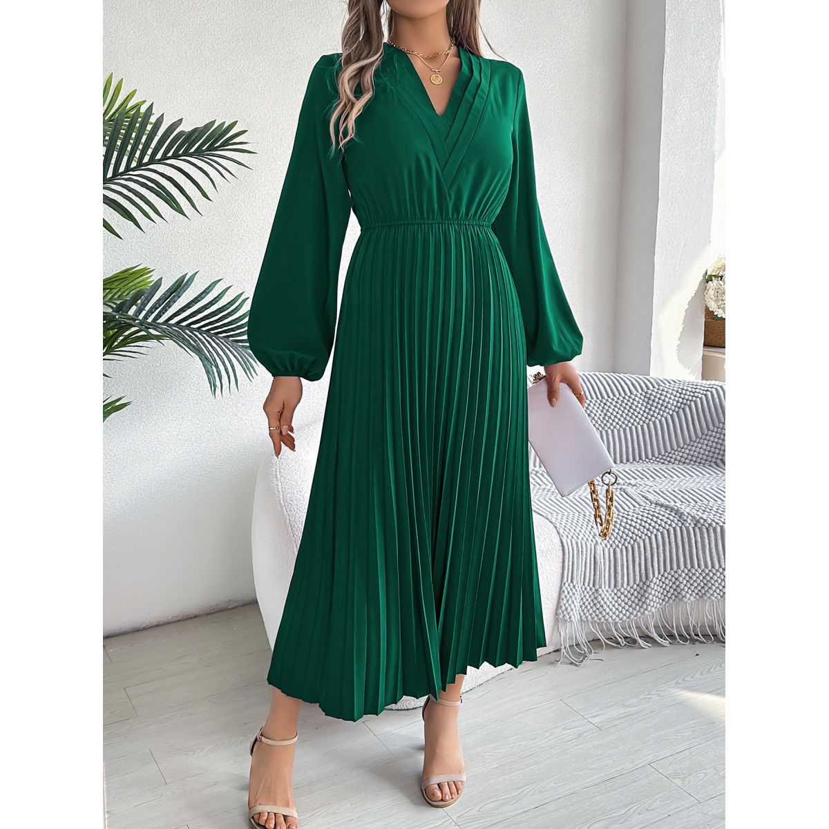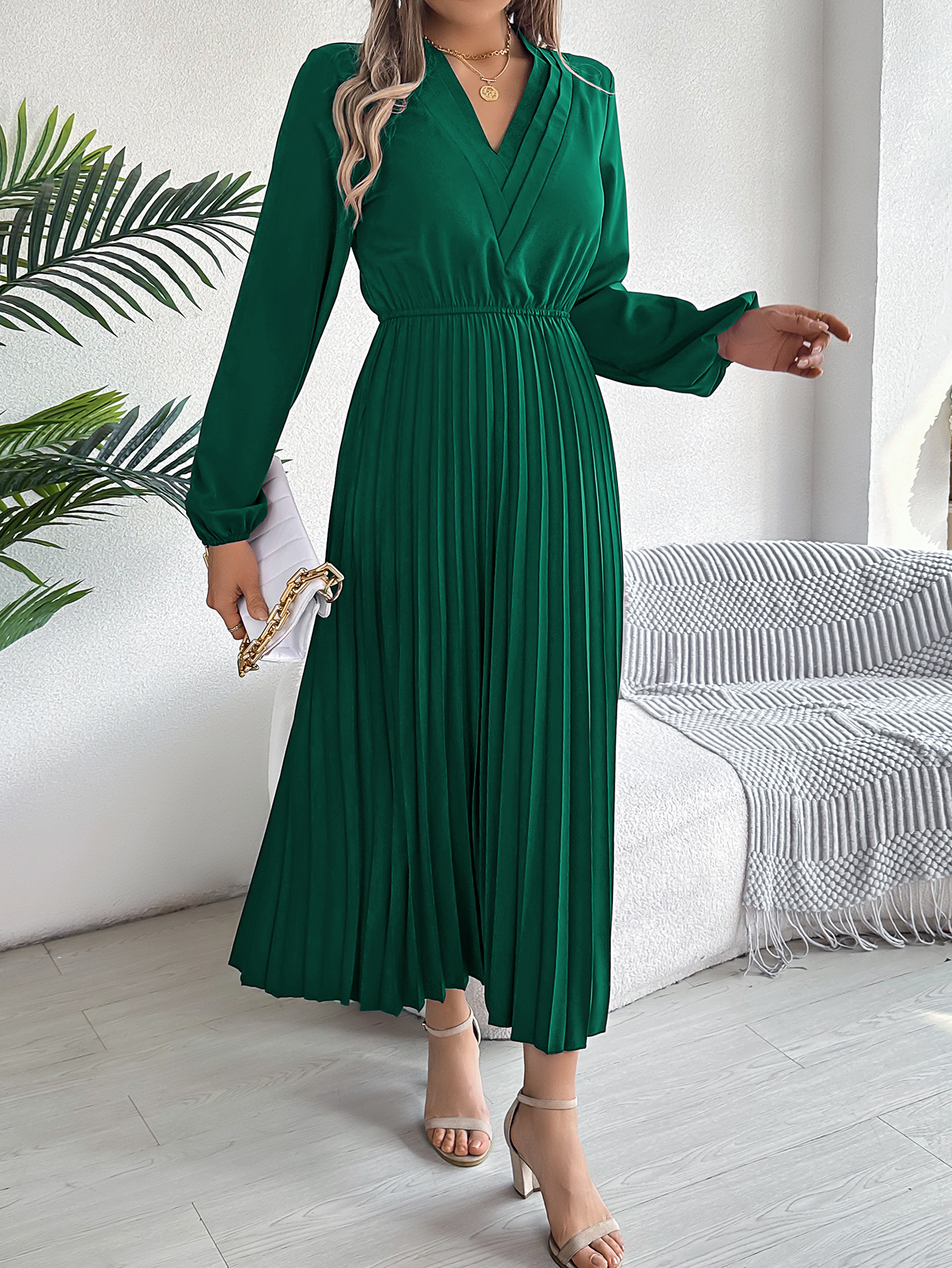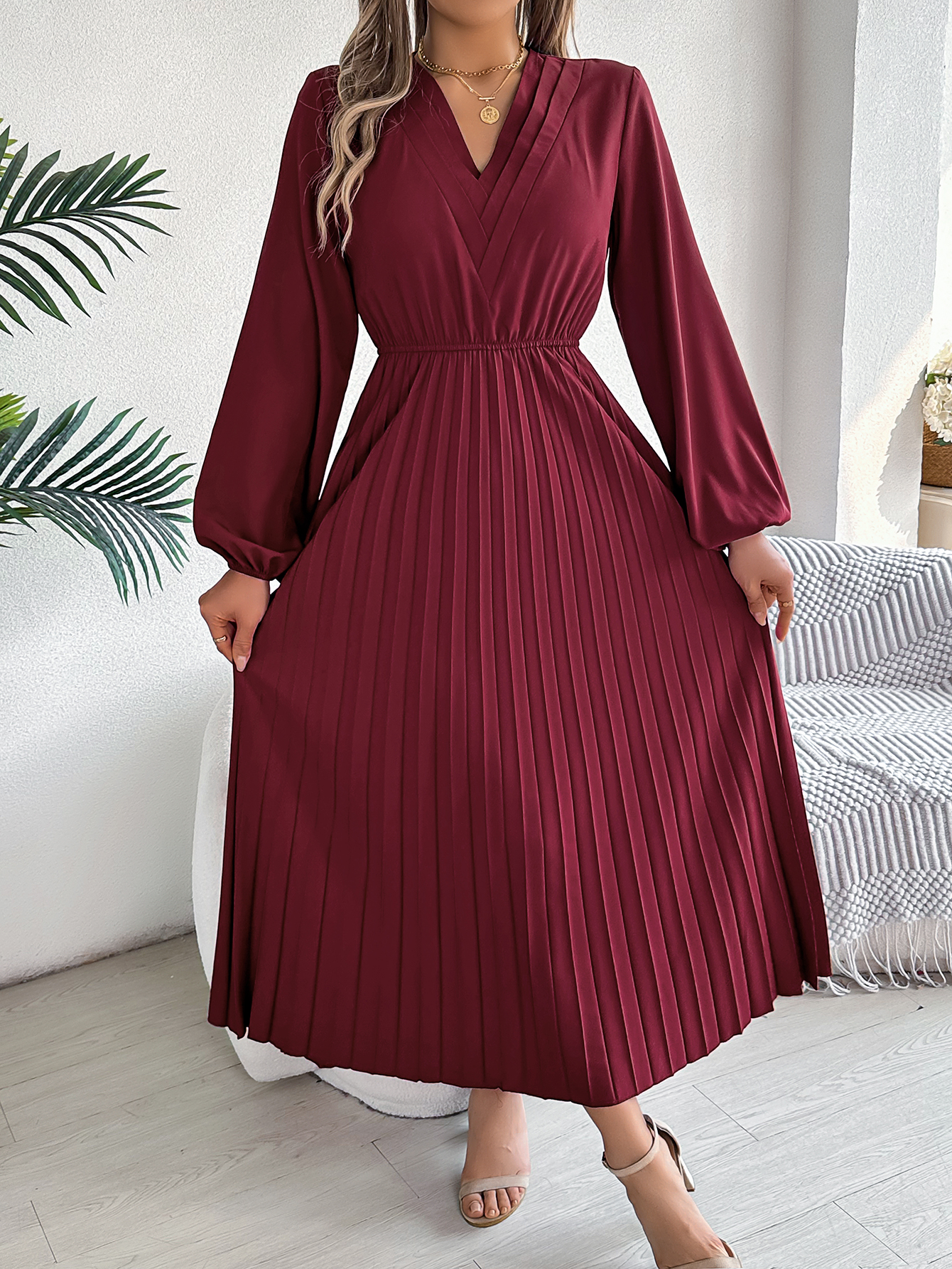 Women's Elegant Triple V Neck Long Sleeve Tie Waist Pleated Maxi Dress