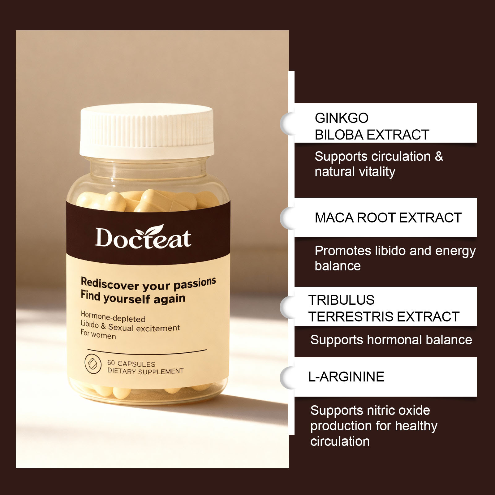 Ingredients: Ginkgo biloba extract, Macaca root extract, Tribulus terrestris extract, L- arginine.