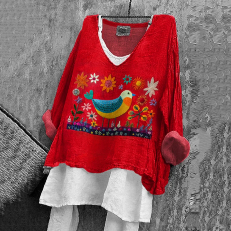 Women's Ethnic Flower And Bird Art Print Cotton And Linen Shirt