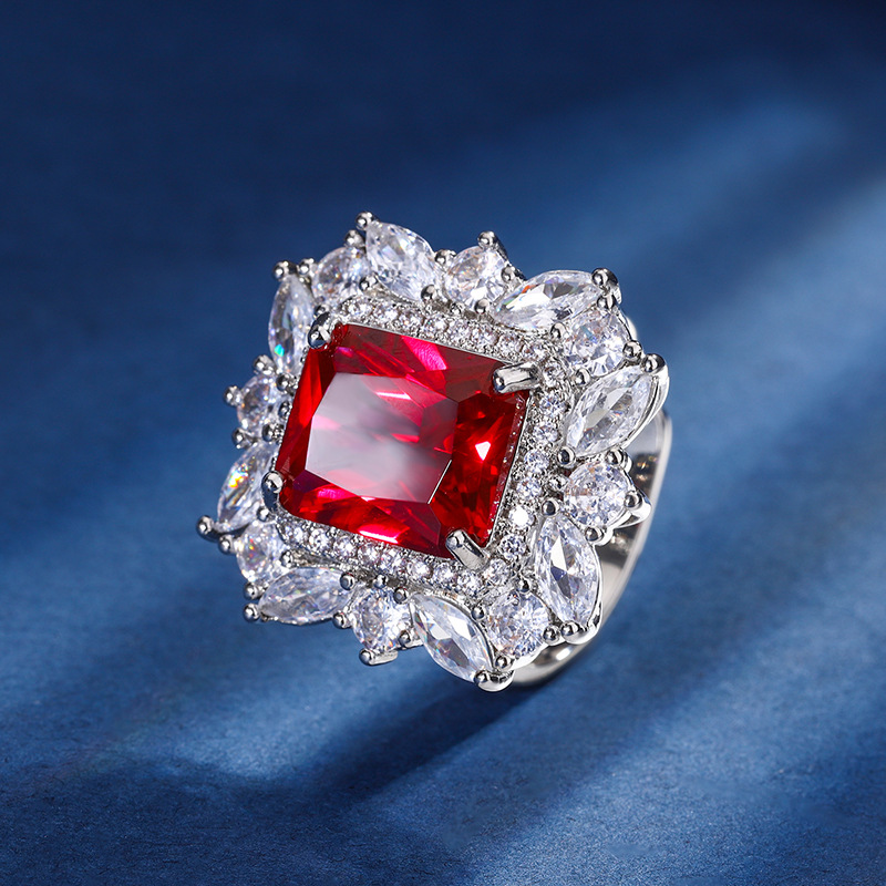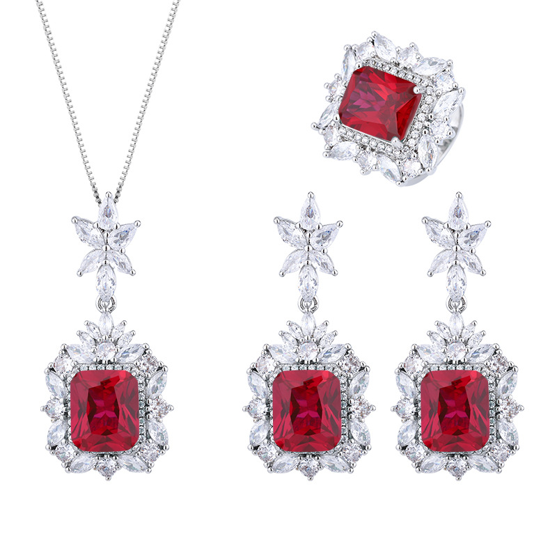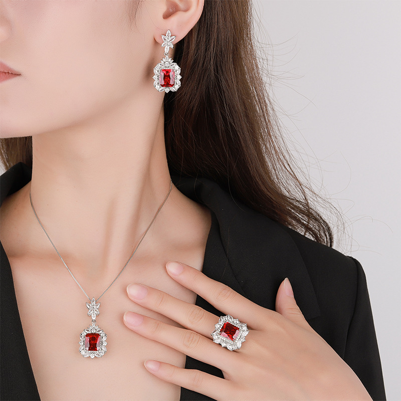Color: red corundum pendant with chain, red corundum ring, red corundum stud earrings
