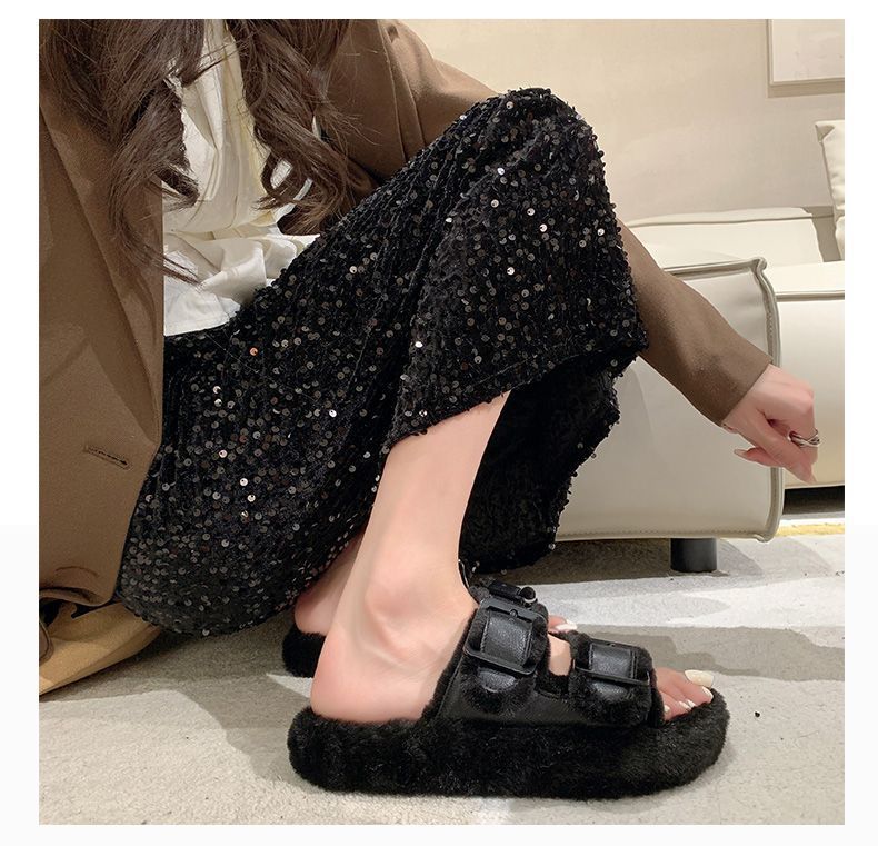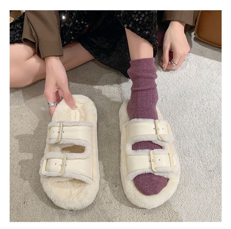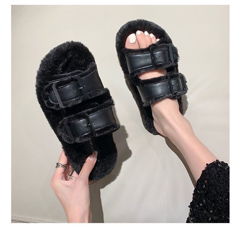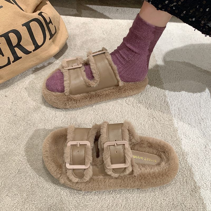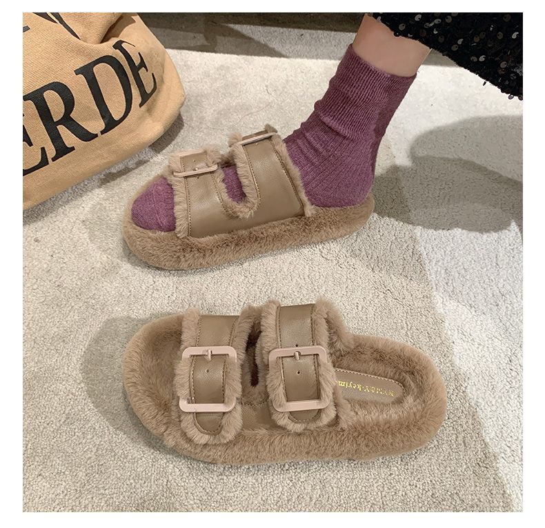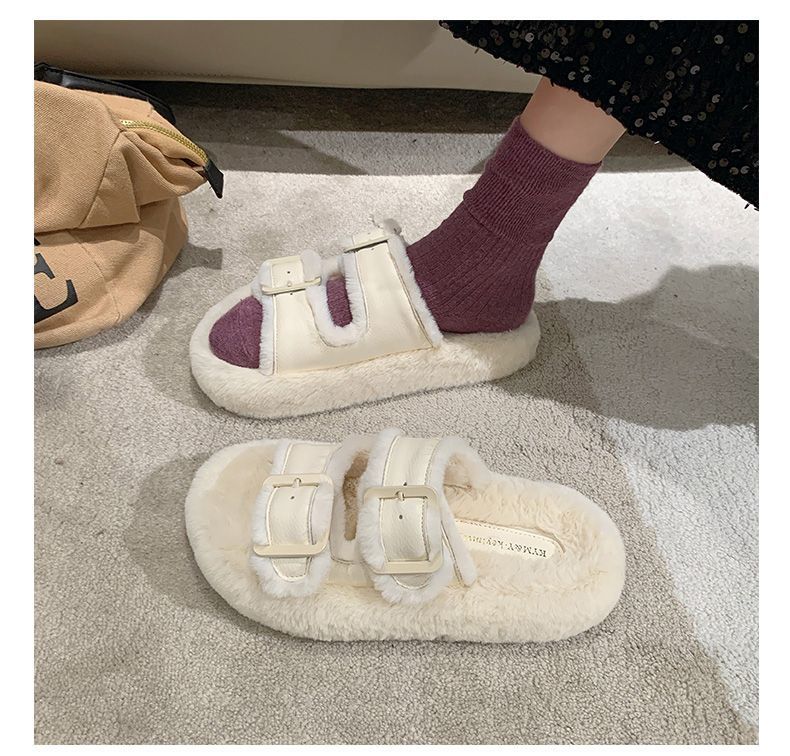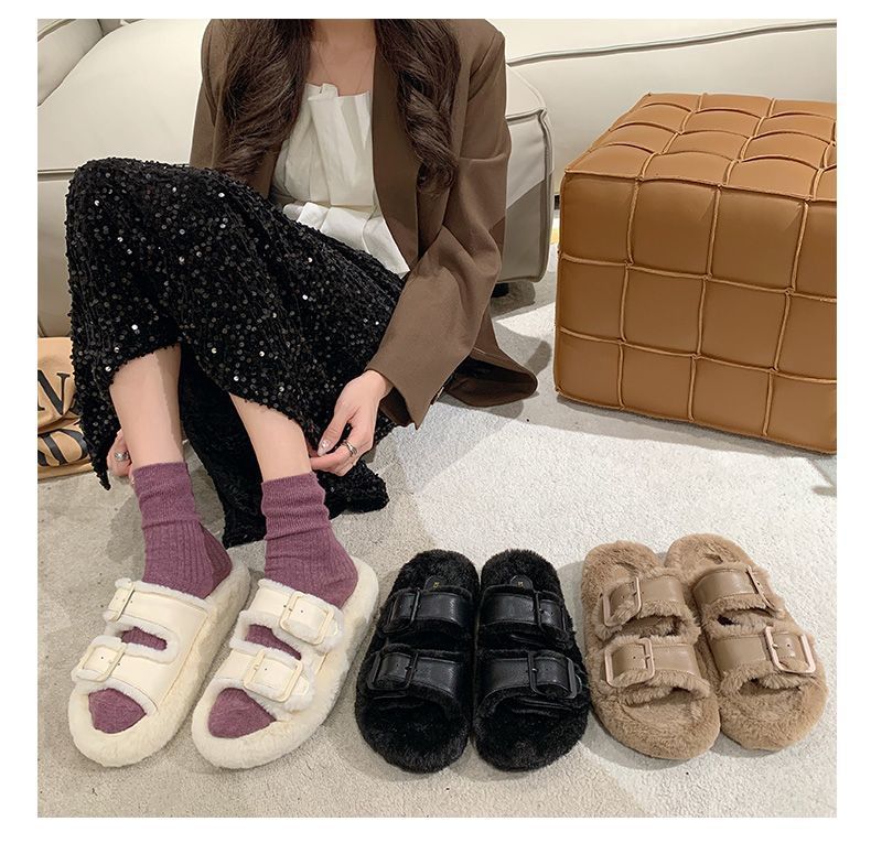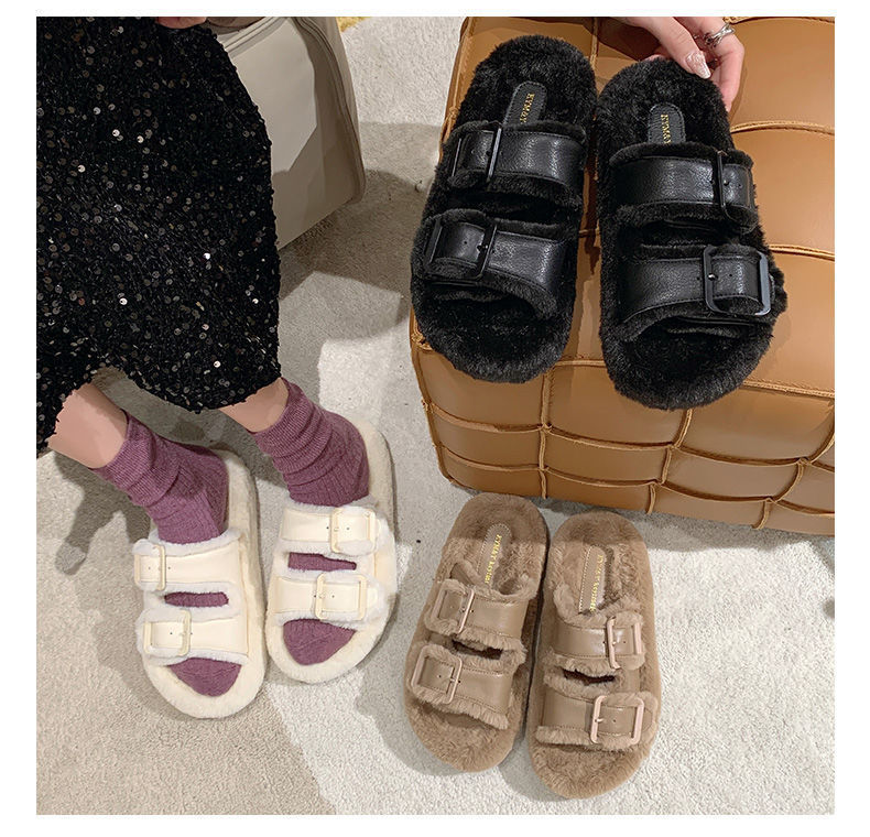 Women's Fashion All-match Furry Fleece-lined Belt Buckle Cotton Slippers