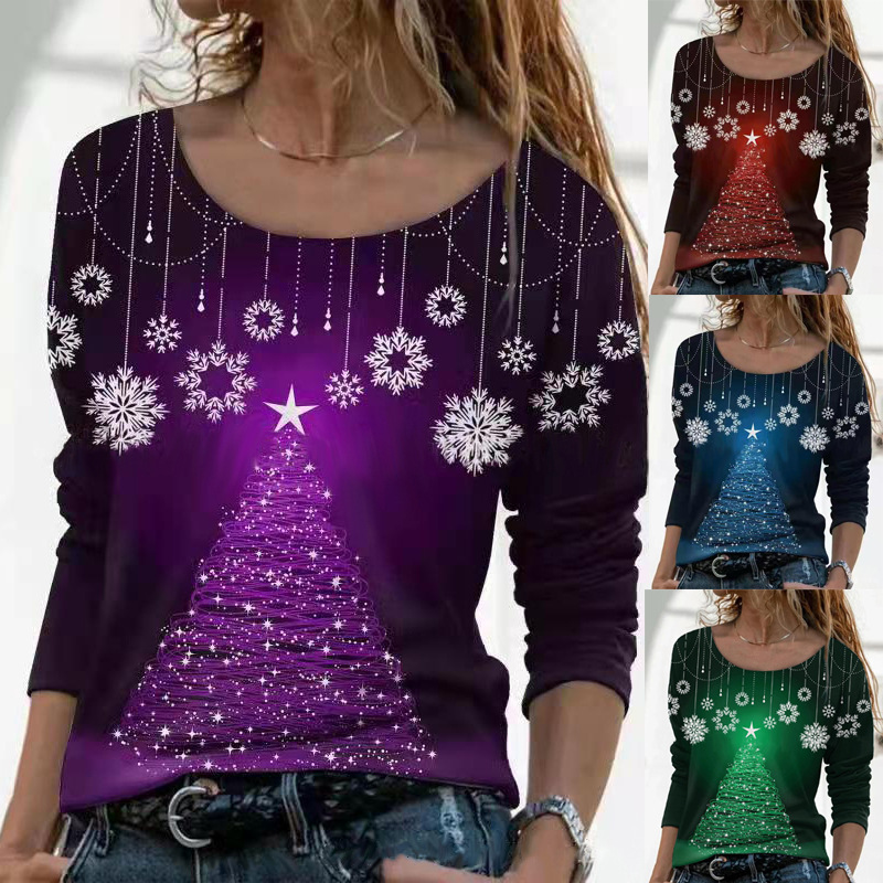 Women's Fashion Christmas Floral Theme Loose Printed Crew Neck Top