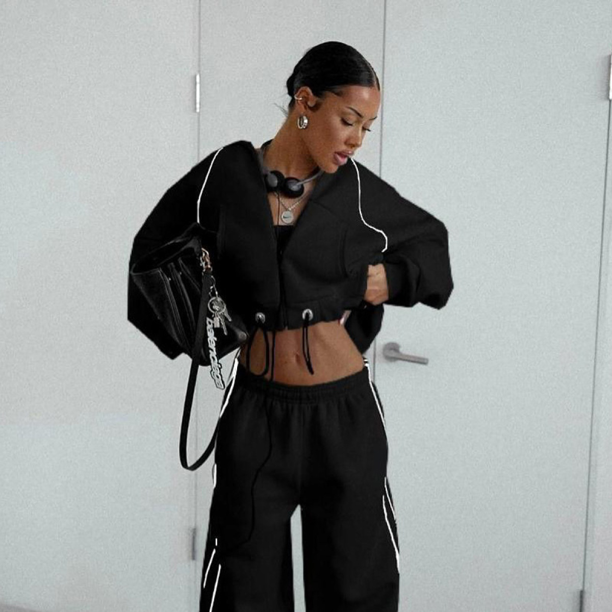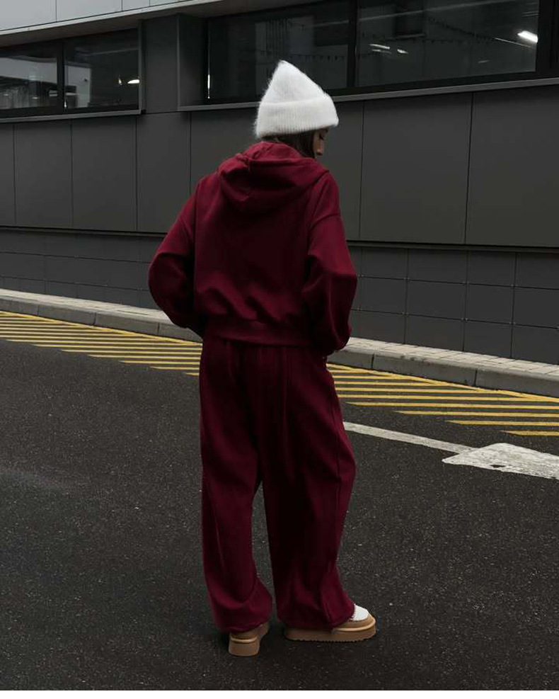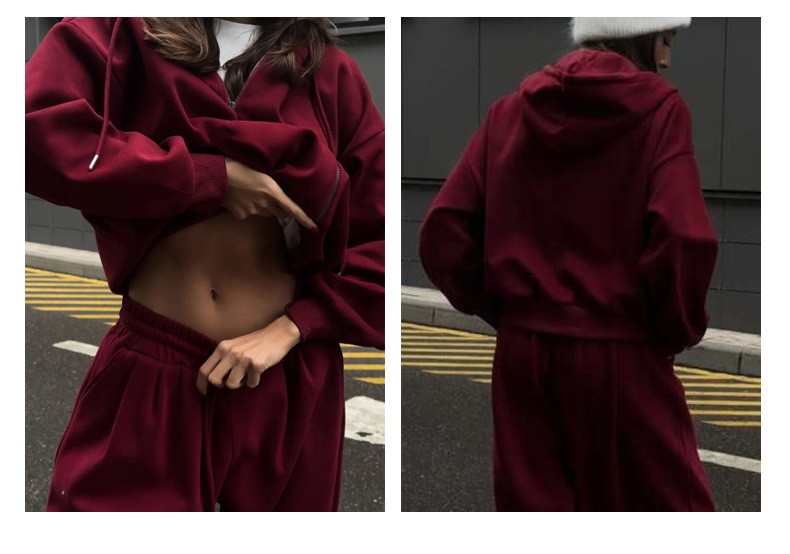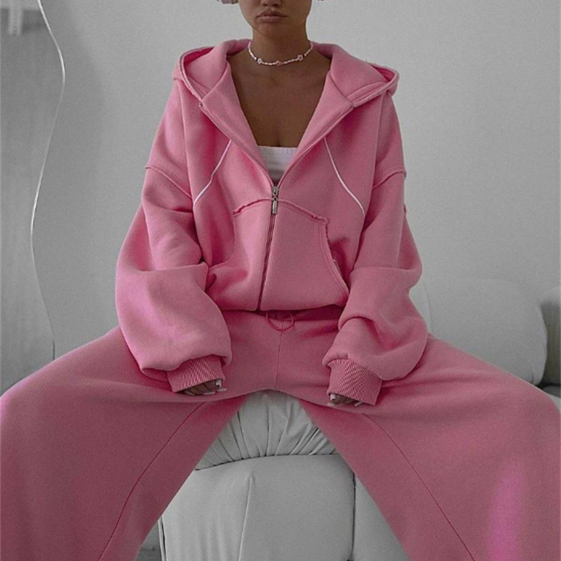 Womens Fashion Color-block Lined Hooded Zip-up Top And Pants Casual Loose-fitting Set