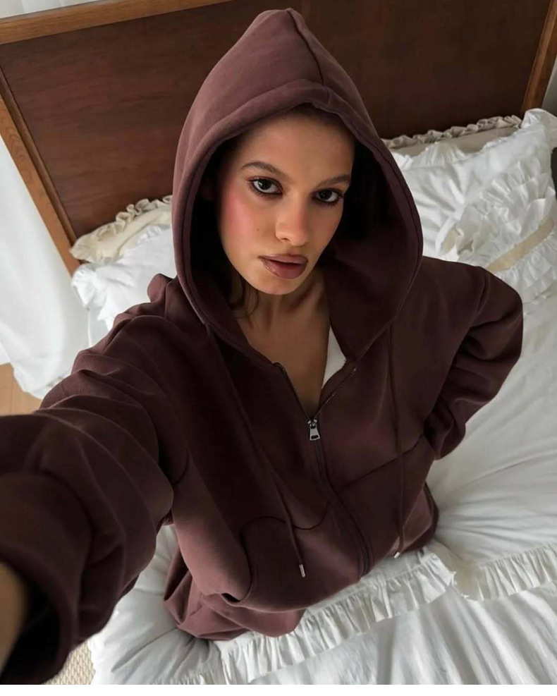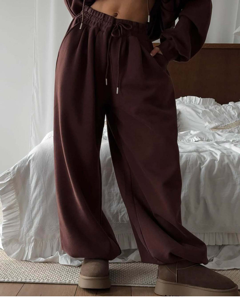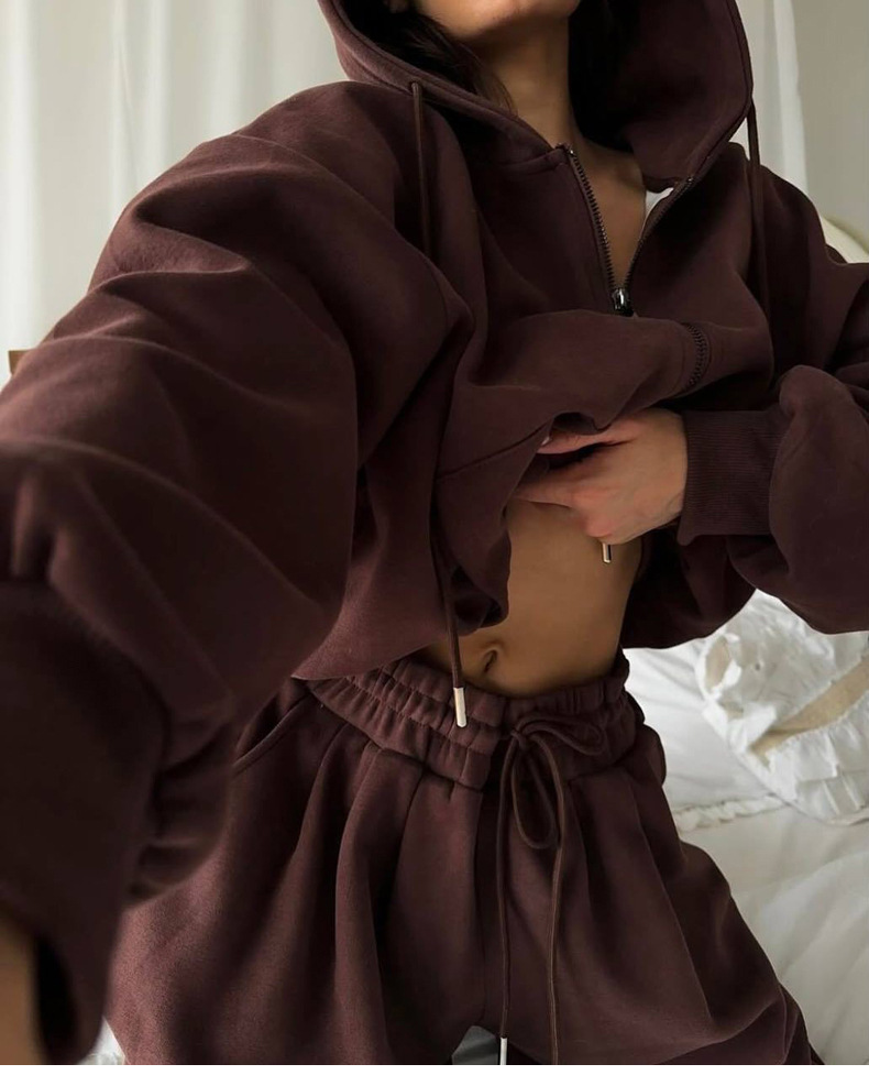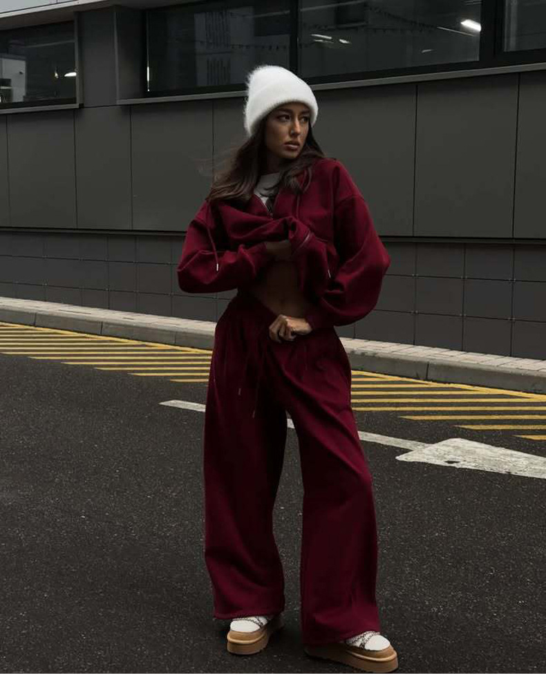 Womens Fashion Color-block Lined Hooded Zip-up Top And Pants Casual Loose-fitting Set