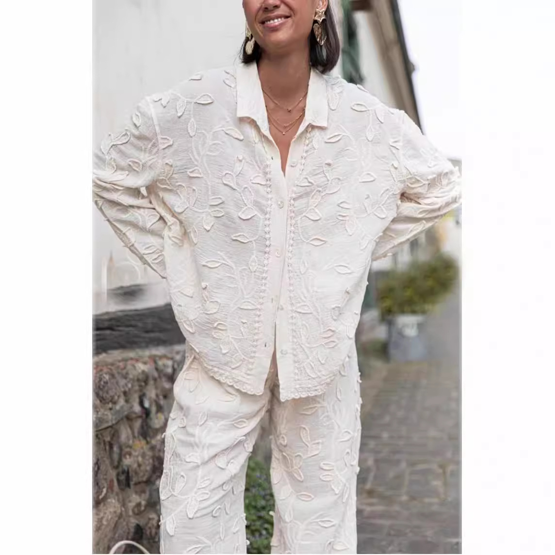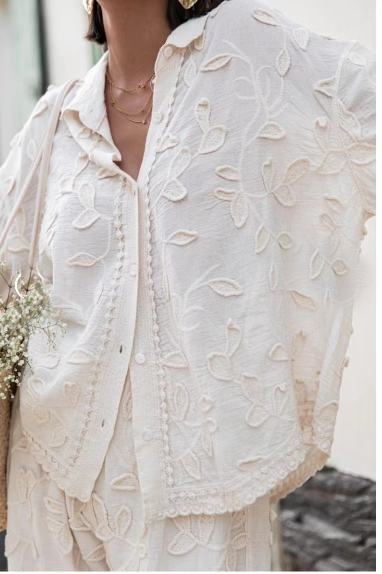 Color: white top, white pants, white suit