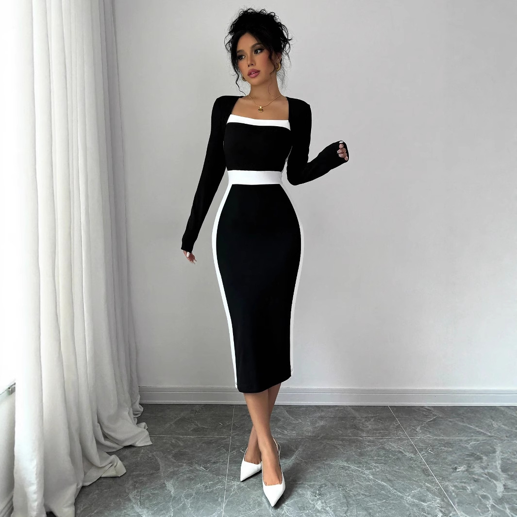 Women's Fashion Elegant Slim Fit Square Collar Long Sleeve Narrow Stitching Temperament Dress