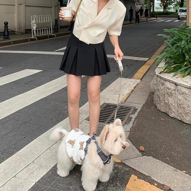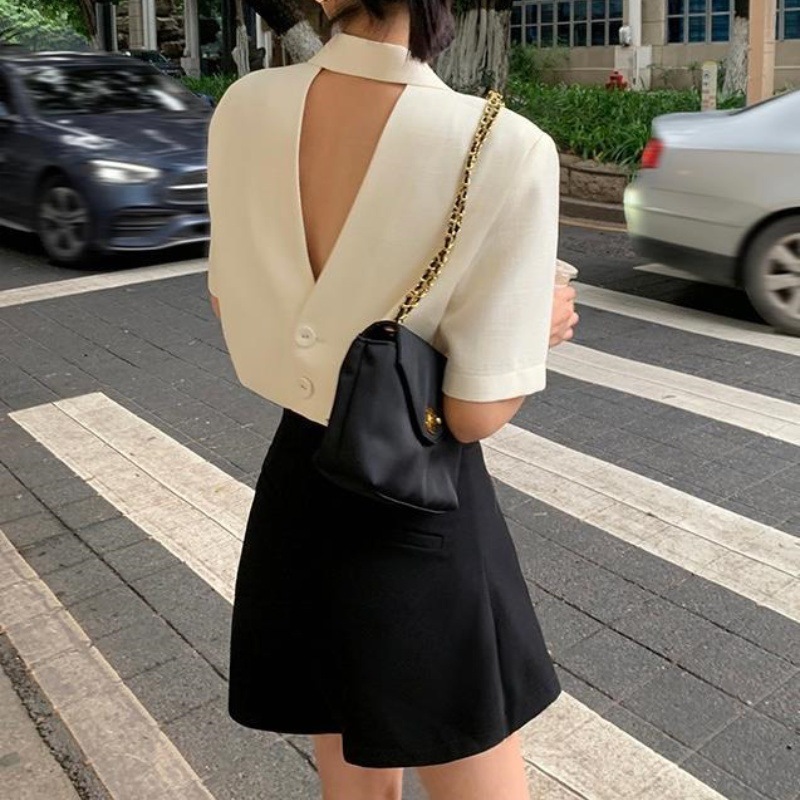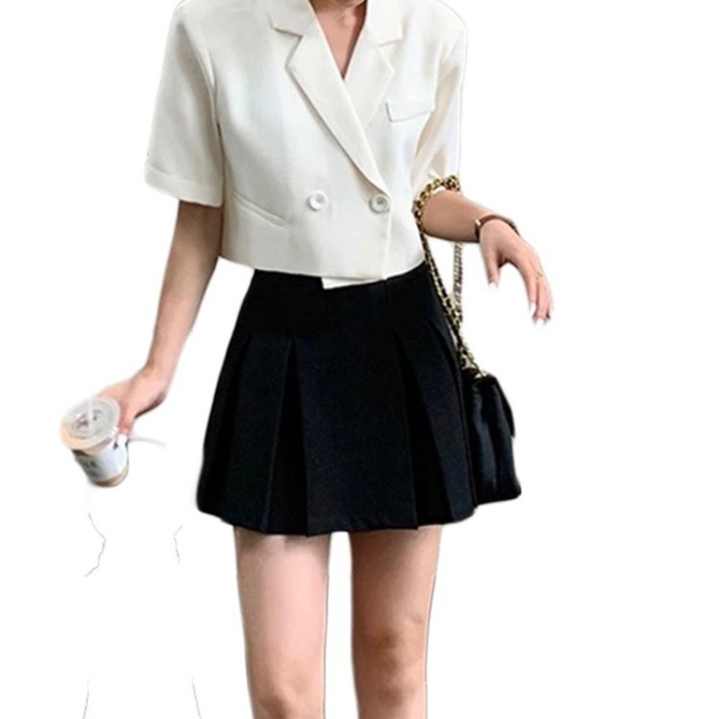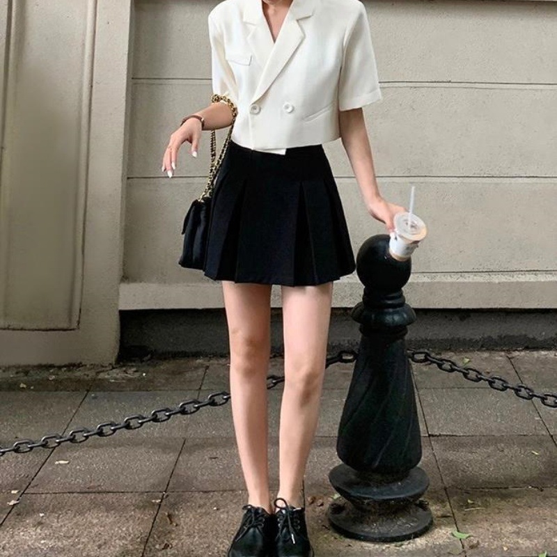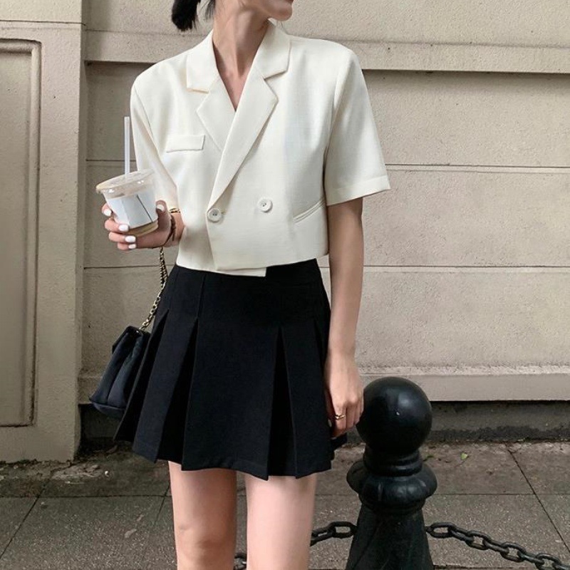 Color: beige coat, black skirt, beige coat black skirt