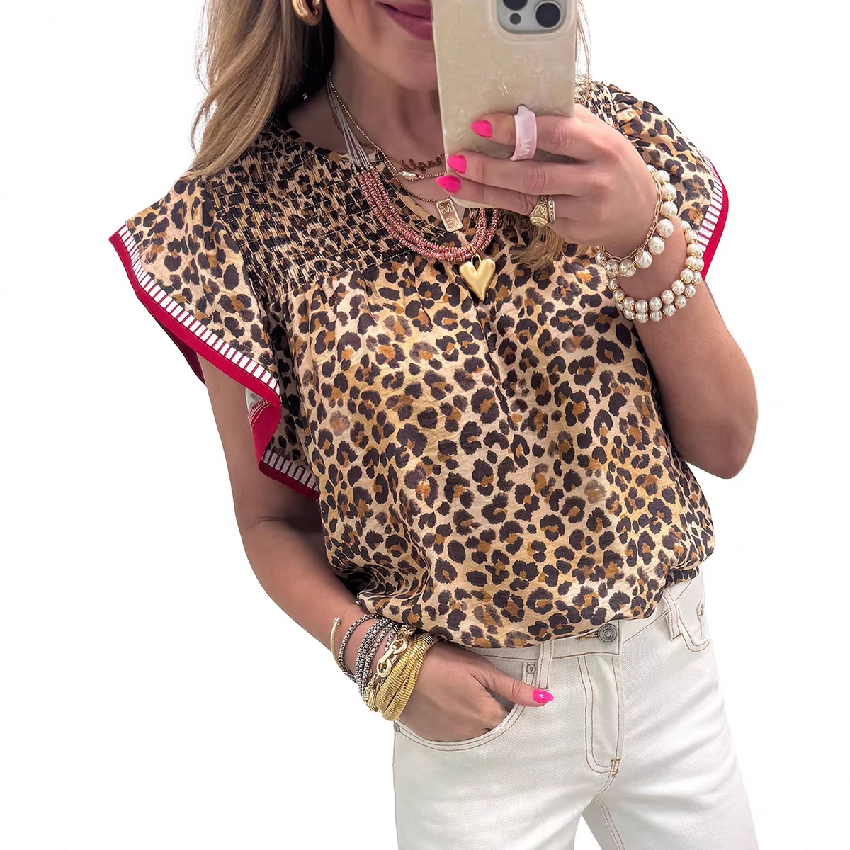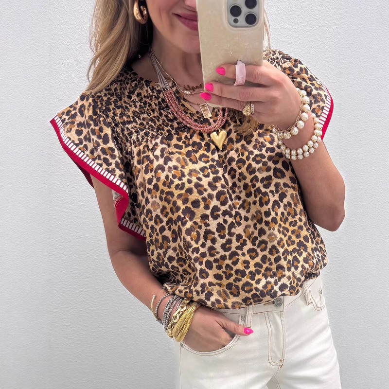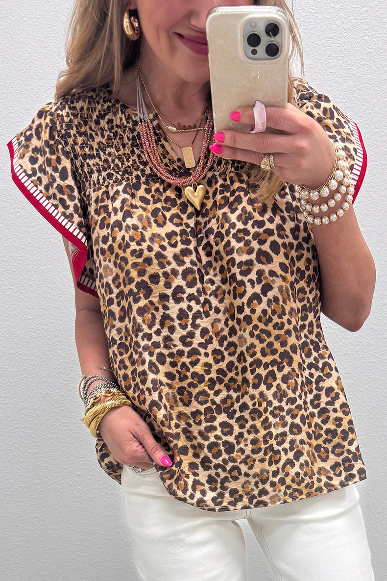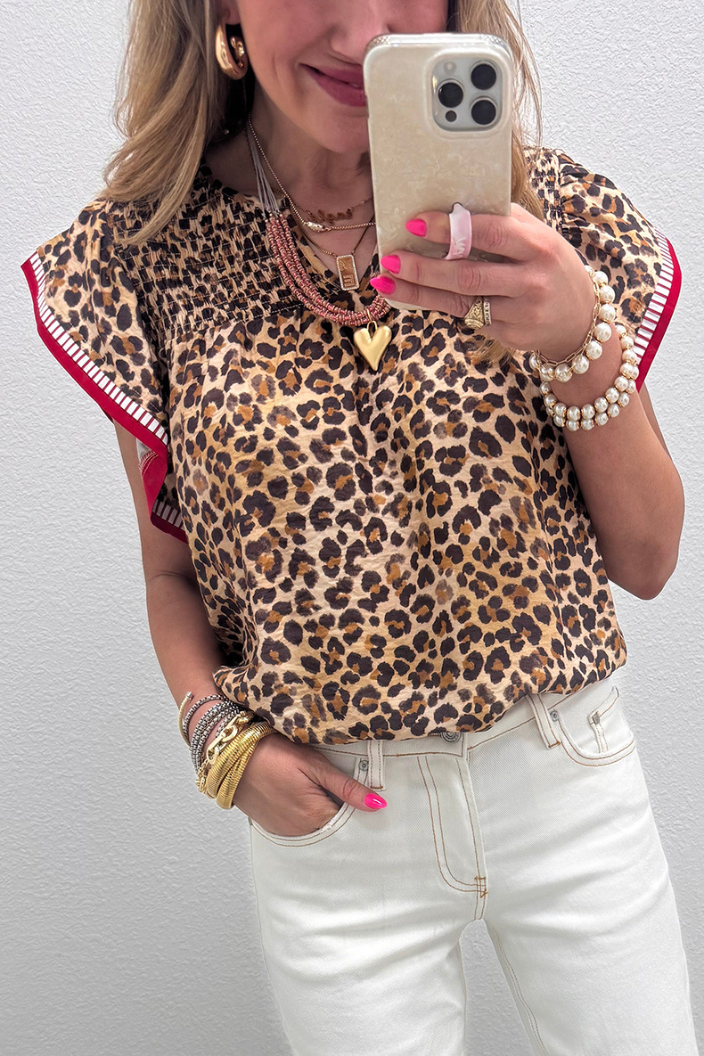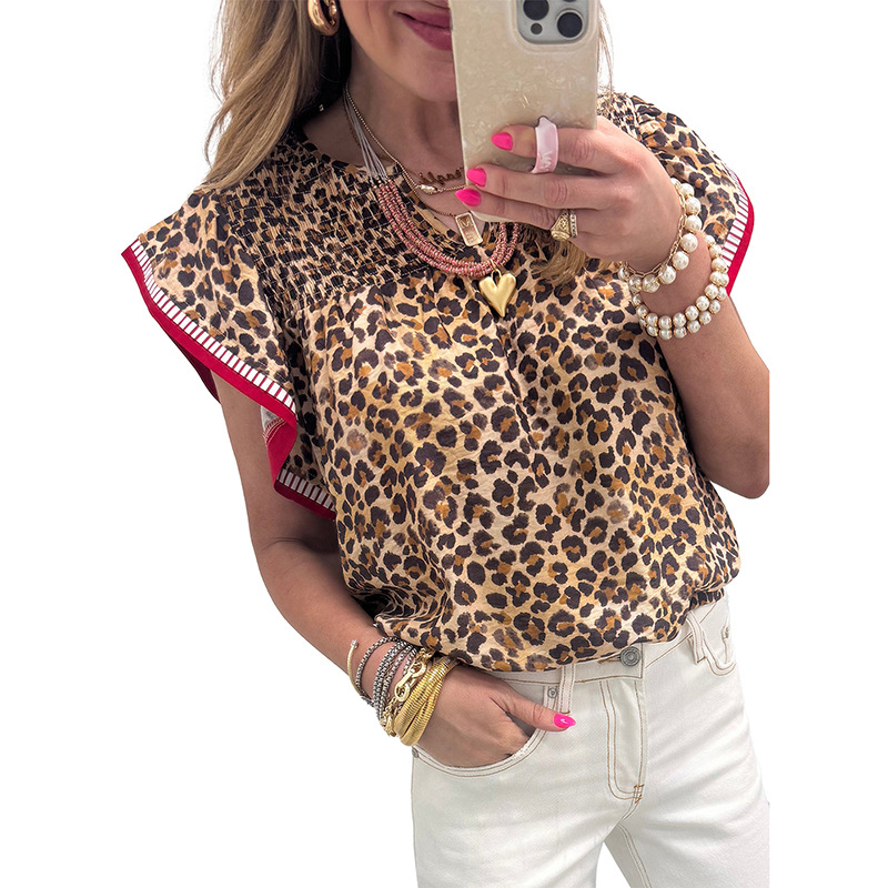 Womens Fashion Leopard-Print Ruffle-Trim Loose Chiffon Blouse