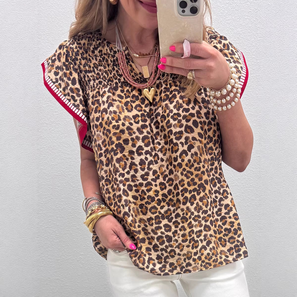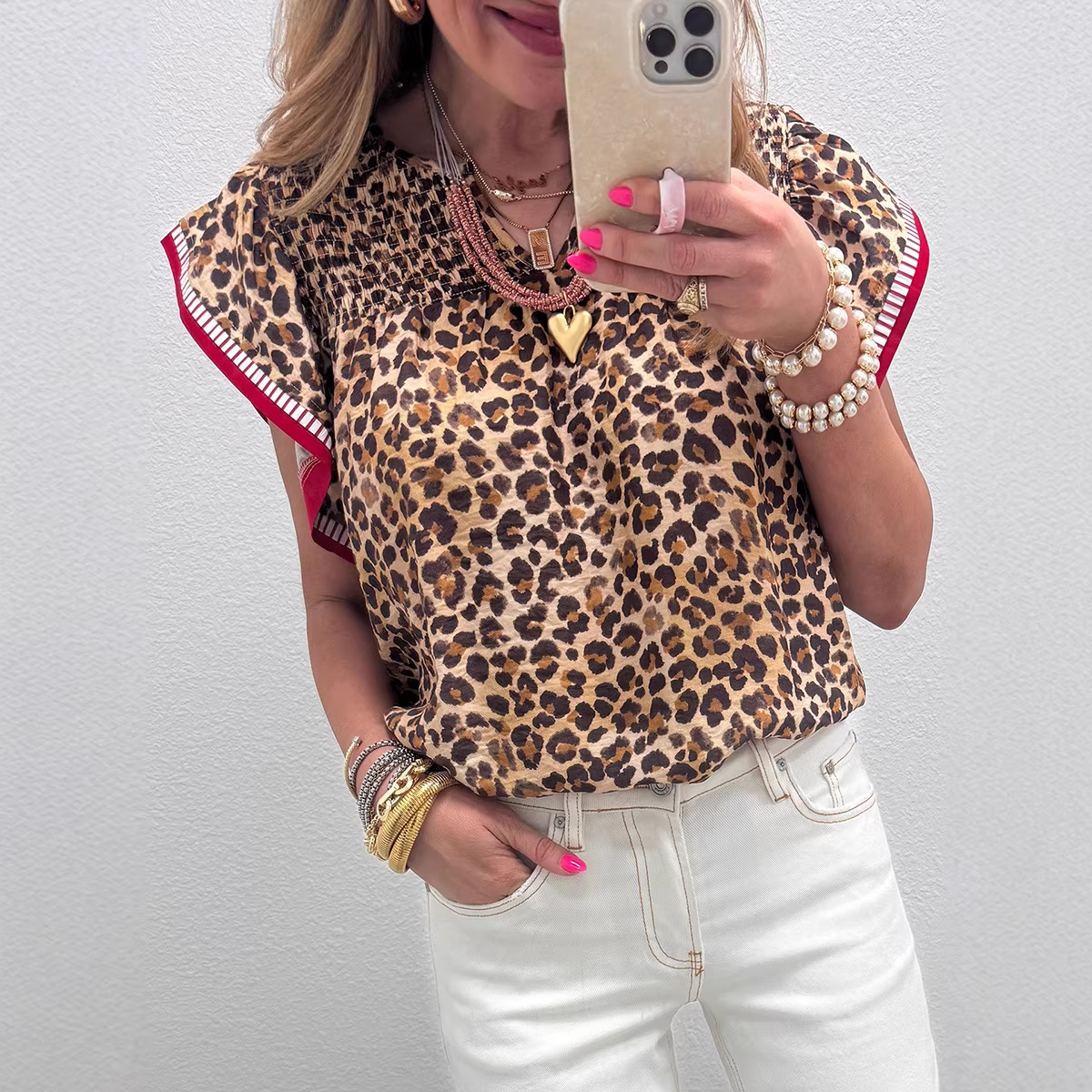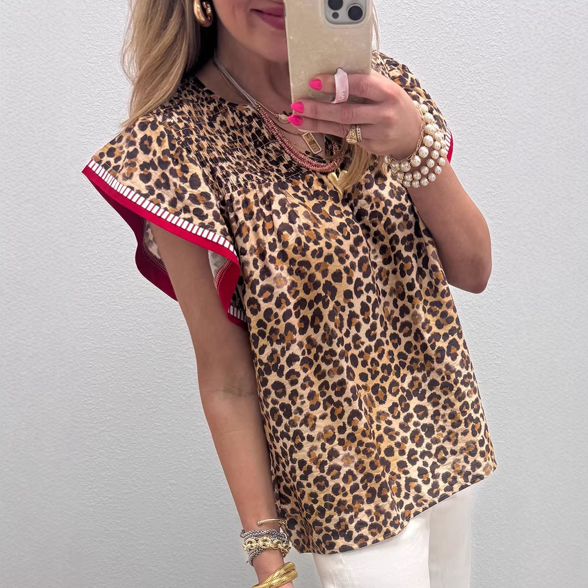 Womens Fashion Leopard-Print Ruffle-Trim Loose Chiffon Blouse